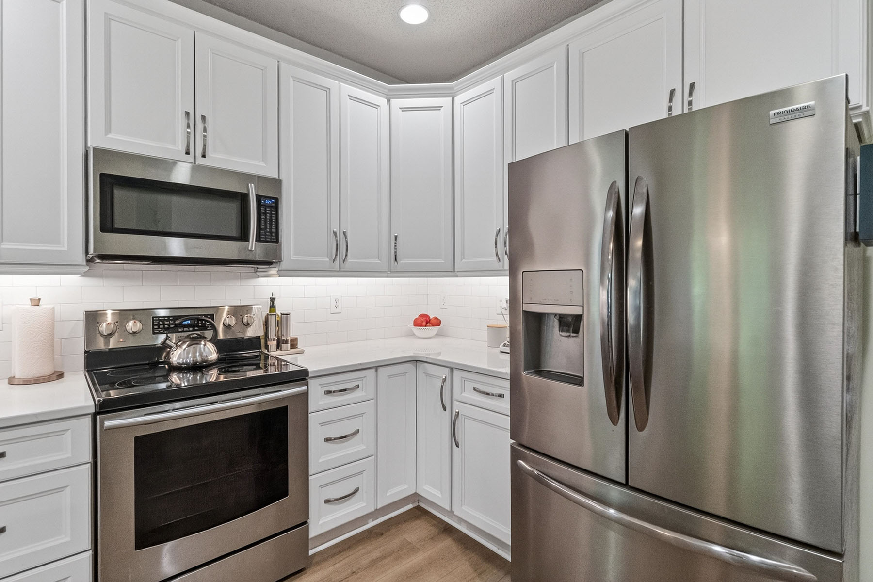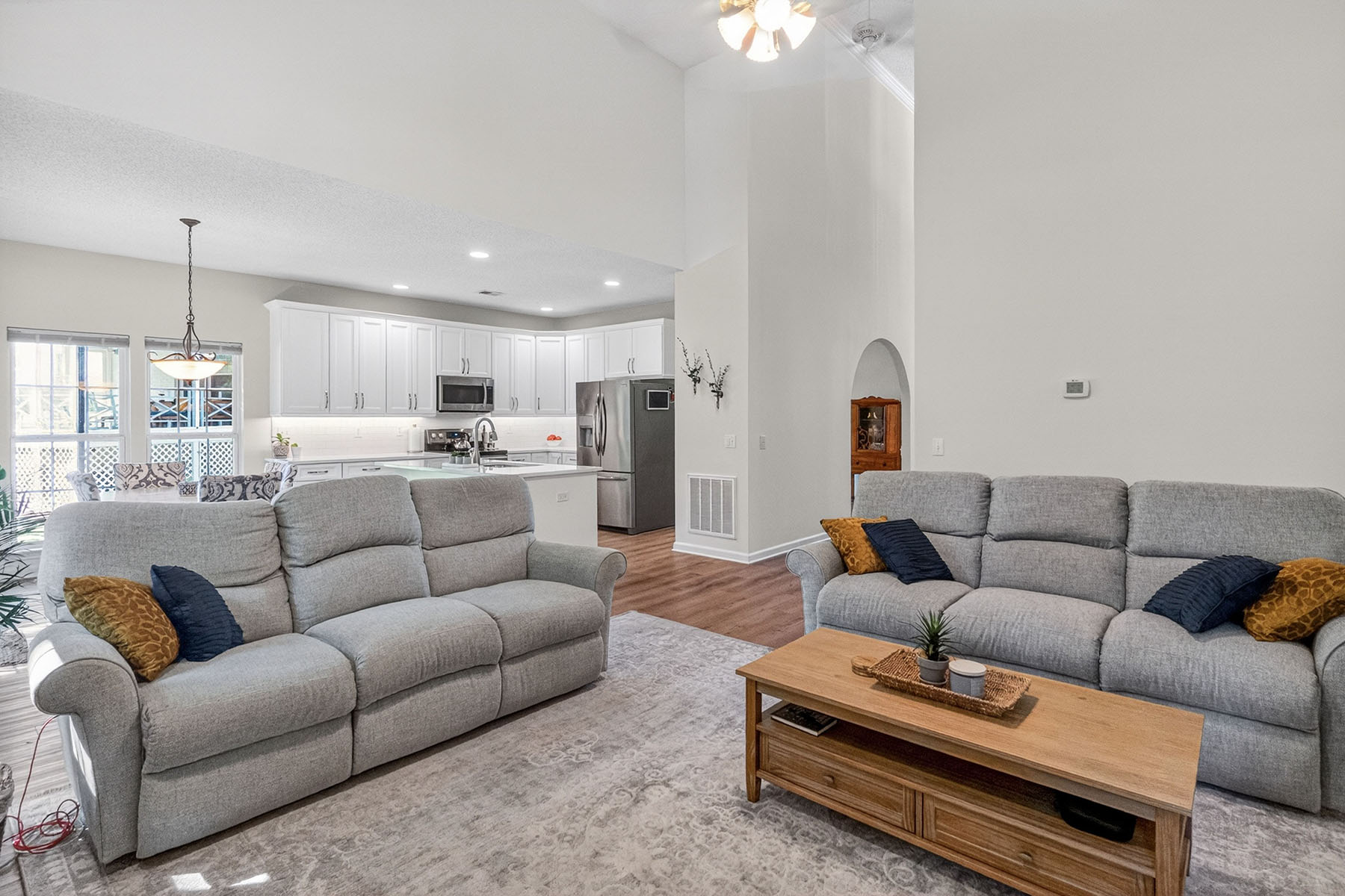 The main level features a spacious primary suite along with dedicated living and dining areas. The home showcases a beautifully remodeled kitchen complete with stainless steel appliances, new cabinetry, and a large island. The updated primary bathroom offers a walk-in shower, a freestanding soaking tub, and a modern vanity, creating a spa-like retreat.