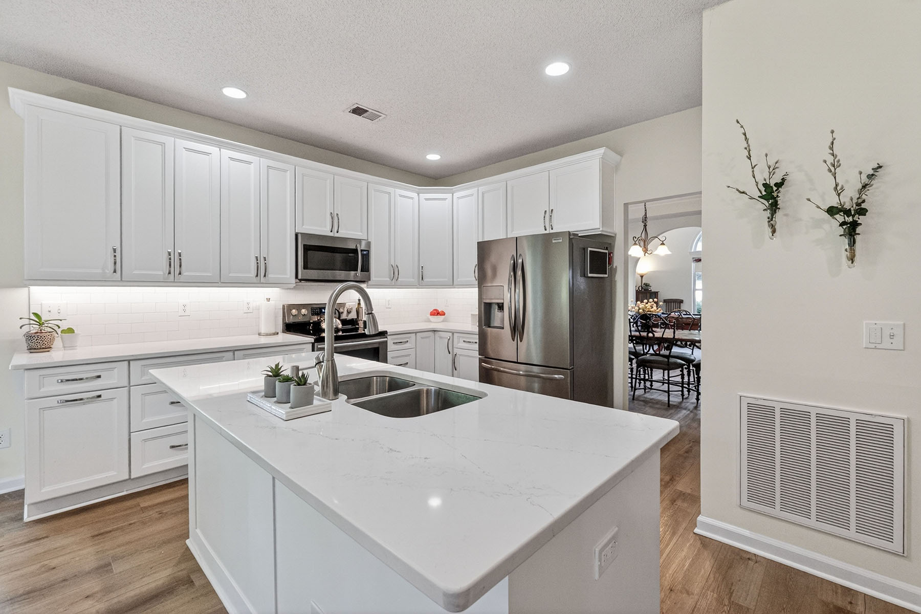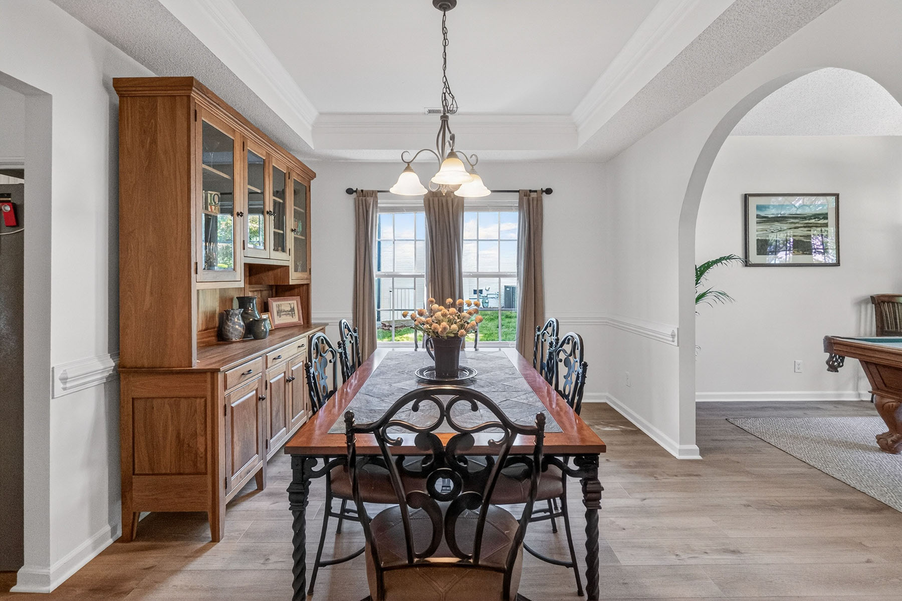 Additional highlights include newer luxury vinyl plank (LVP) flooring installed in 2023 and neutral paint tones throughout, providing a warm and inviting atmosphere. The primary suite also features a tray ceiling, a generous walk-in closet, and serene views of the private, wooded, and level backyard.