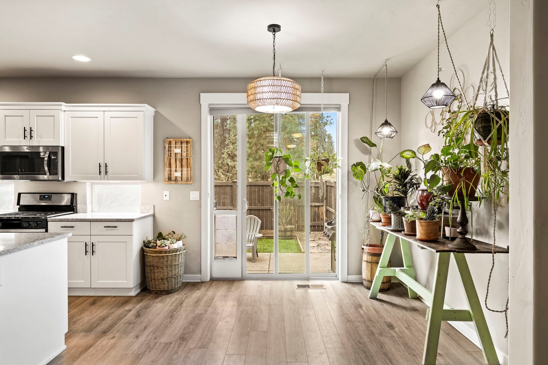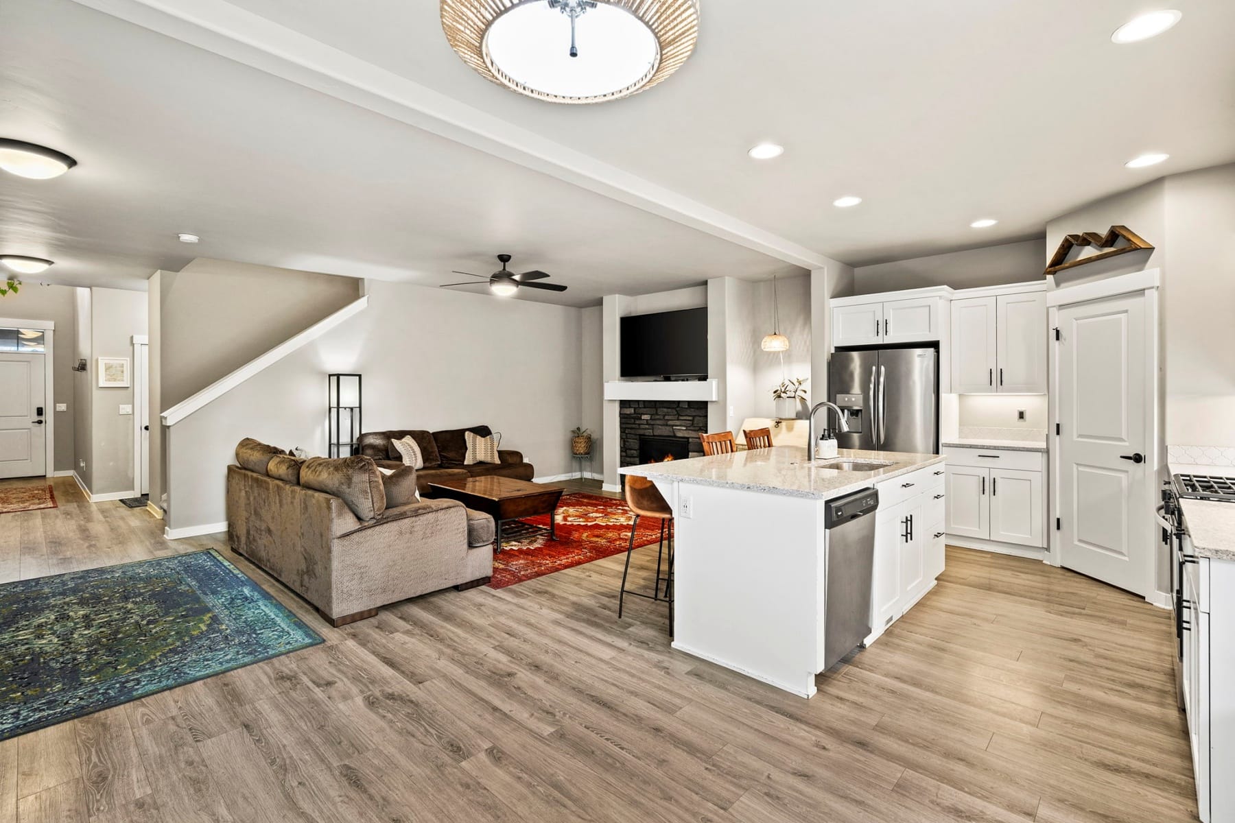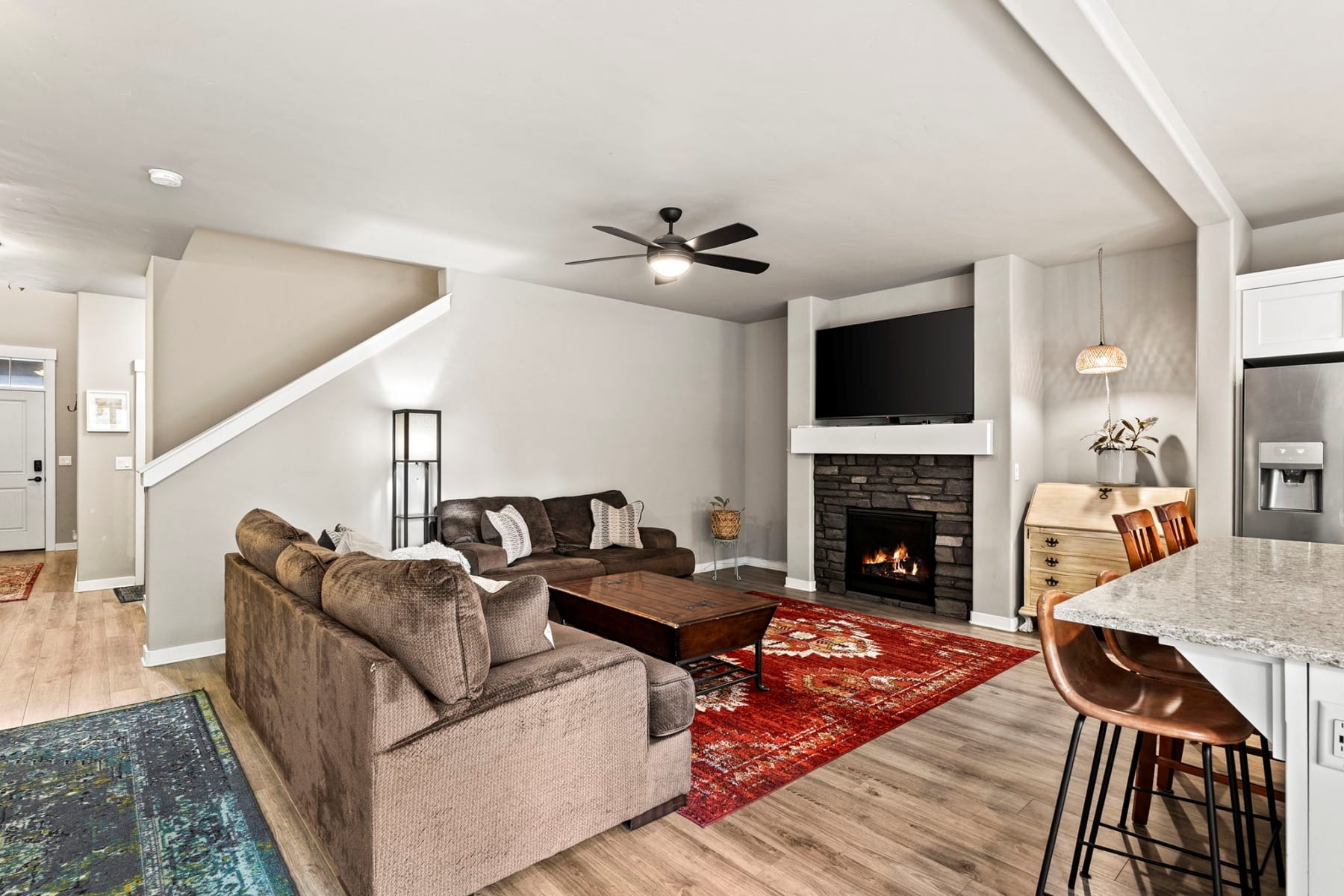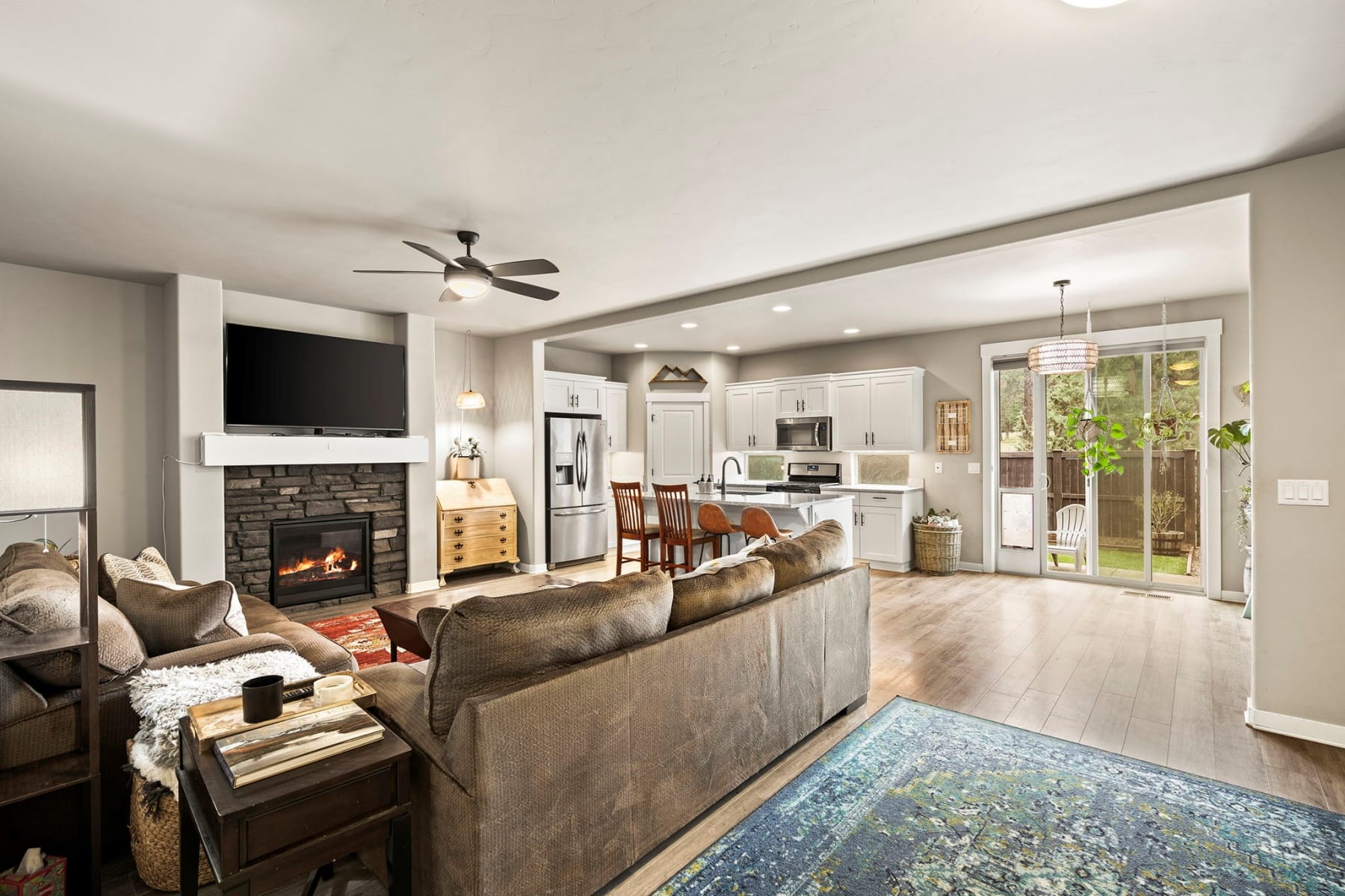 Turn-key and move-in ready, this elevated Stonegate townhome offers the ideal blend of style, comfort, convenience, and energy efficiency in a prime Southeast Bend location. Close to shopping, restaurants, public trails, downtown Bend, the Old Mill District, and year-round Central Oregon recreation, this home is perfectly positioned for both daily living and weekend adventure. The bright open-concept layout features quartz countertops, stainless steel appliances, a pantry, island seating, and inviting living spaces designed for easy entertaining. Upstairs, thoughtful bedroom separation includes a spacious primary suite with a dual vanity and large walk-in closet. Highly energy efficient construction, air conditioning, a fully fenced backyard with updated xeriscaping, and an oversized two-car garage with generous additional storage add everyday comfort and functionality. Stonegate amenities include a community pool, park, playground, front yard landscaping, and walking trails.