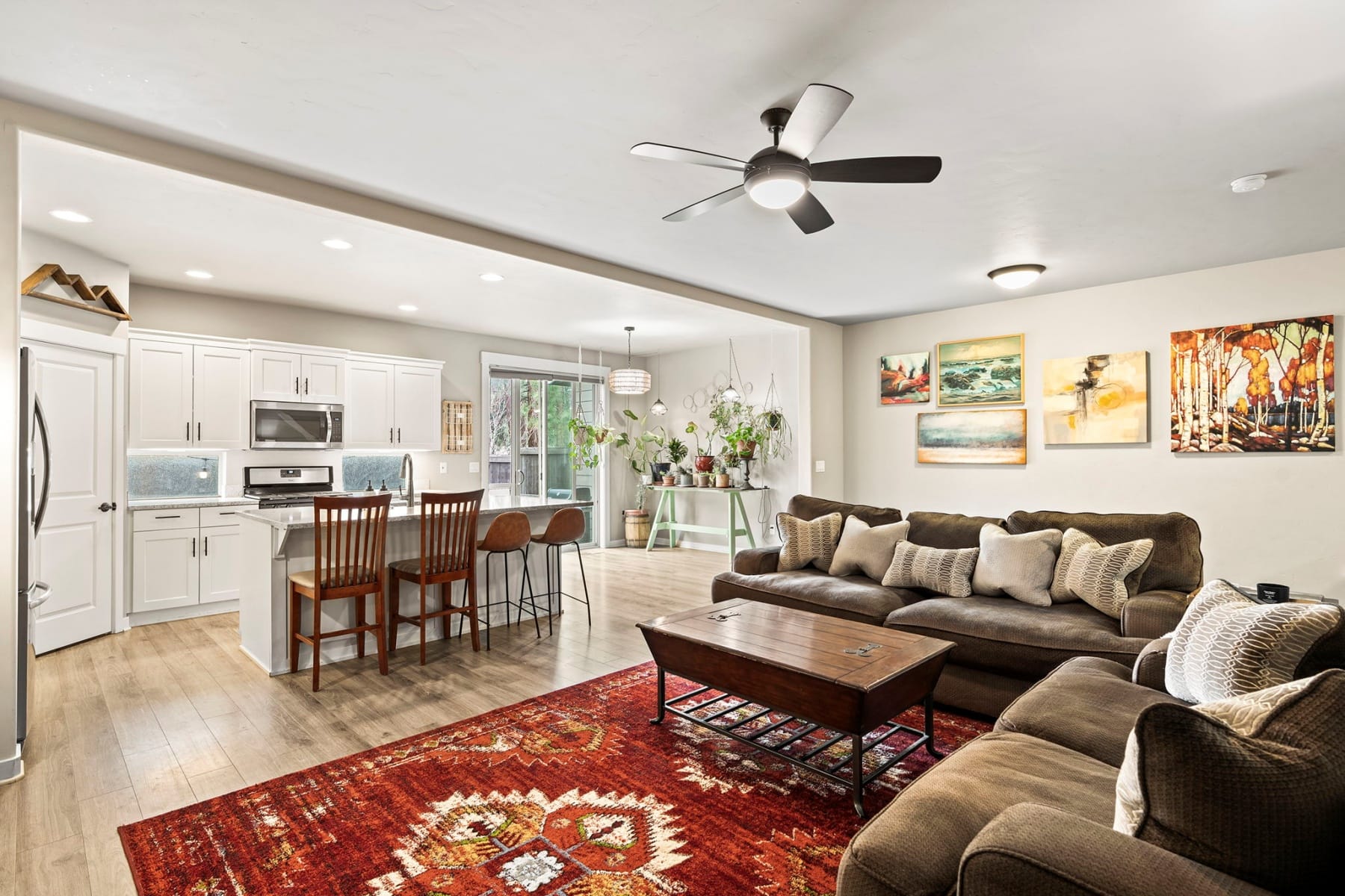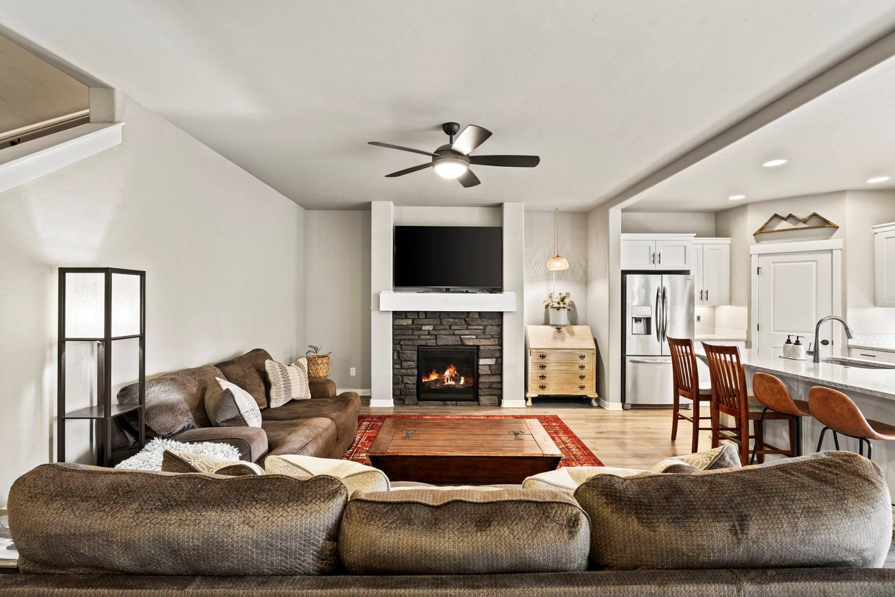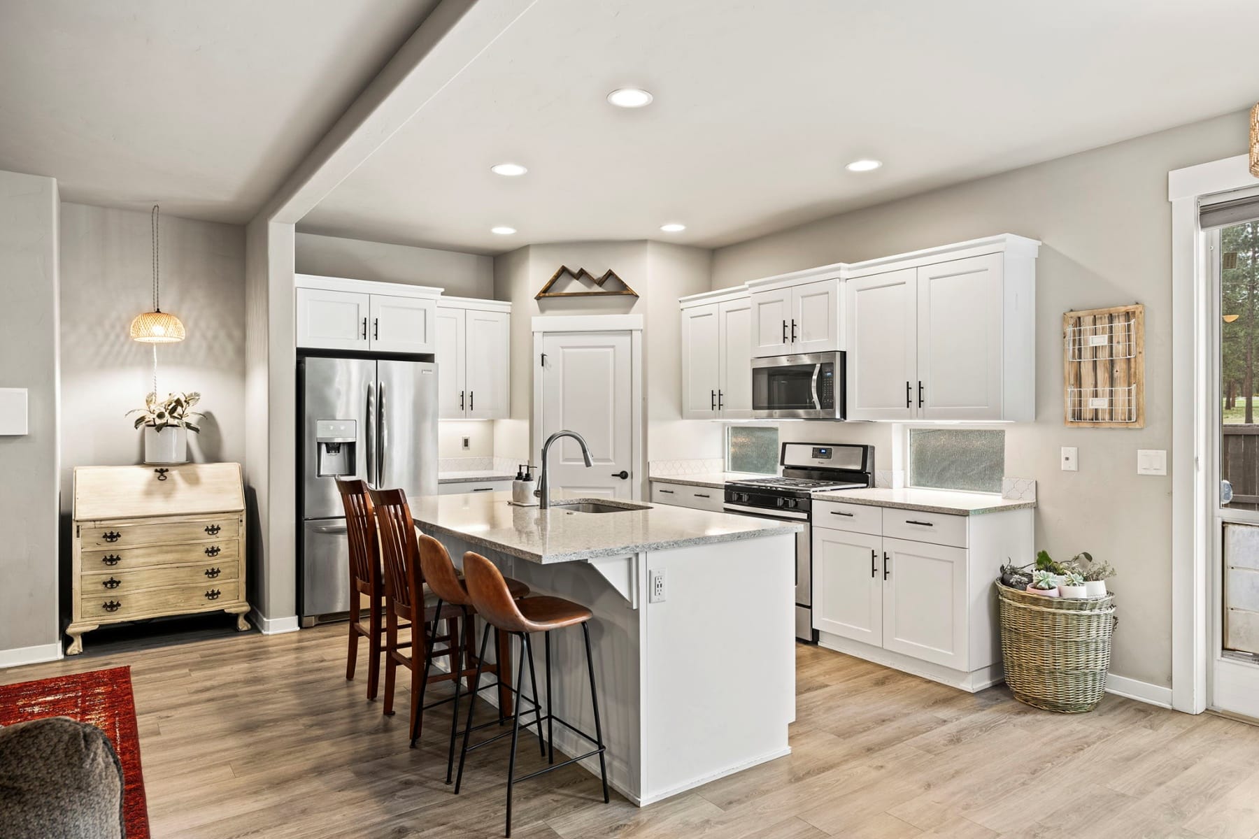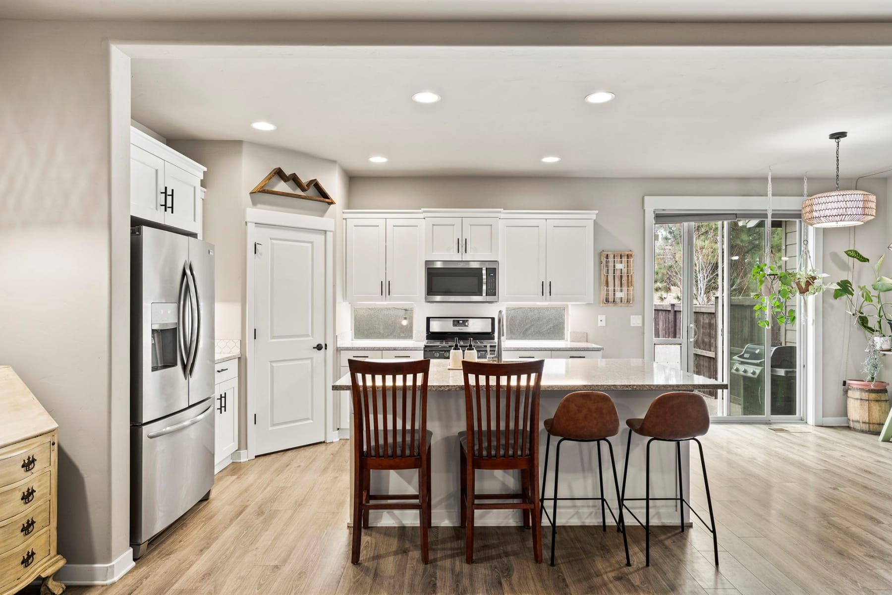 Turn-key and move-in ready, this elevated Stonegate townhome offers the ideal blend of style, comfort, convenience, and energy efficiency in a prime Southeast Bend location. Close to shopping, restaurants, public trails, downtown Bend, the Old Mill District, and year-round Central Oregon recreation, this home is perfectly positioned for both daily living and weekend adventure. The bright open-concept layout features quartz countertops, stainless steel appliances, a pantry, island seating, and inviting living spaces designed for easy entertaining. Upstairs, thoughtful bedroom separation includes a spacious primary suite with a dual vanity and large walk-in closet. Highly energy efficient construction, air conditioning, a fully fenced backyard with updated xeriscaping, and an oversized two-car garage with generous additional storage add everyday comfort and functionality. Stonegate amenities include a community pool, park, playground, front yard landscaping, and walking trails.