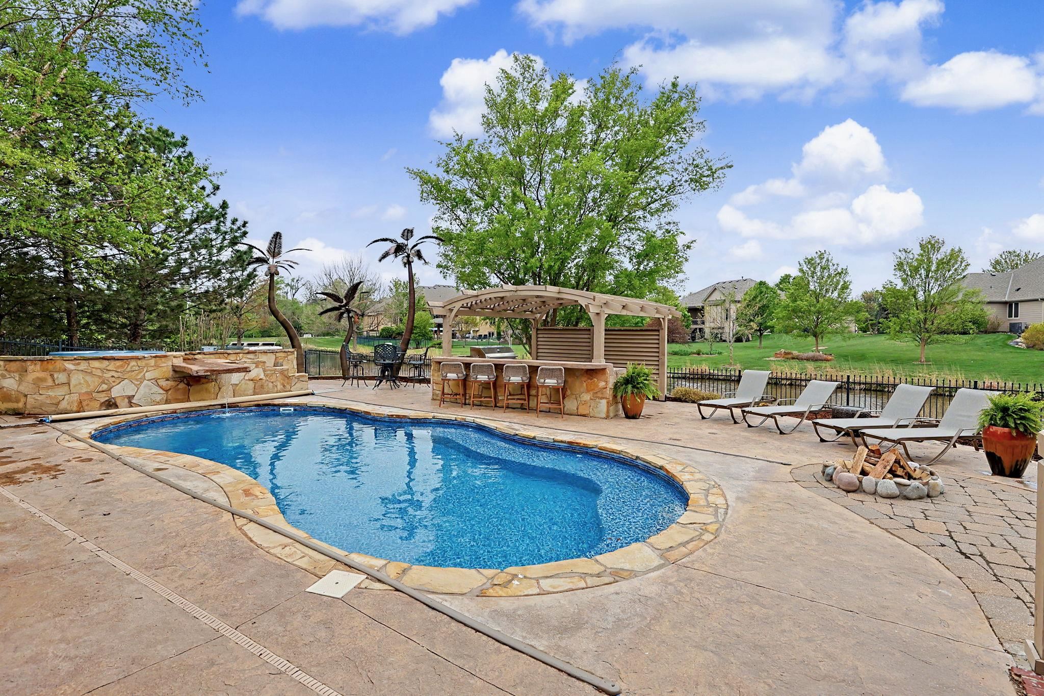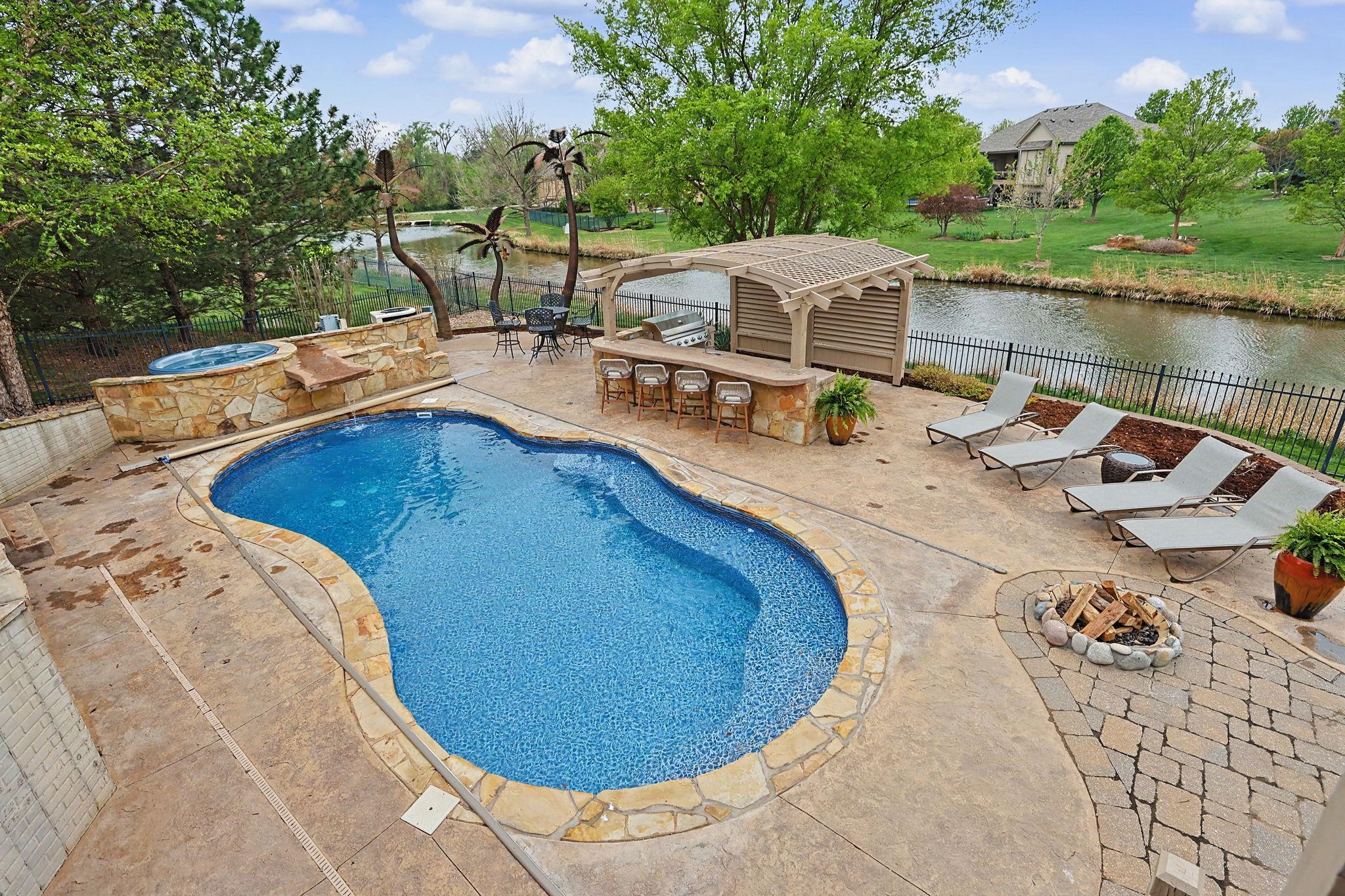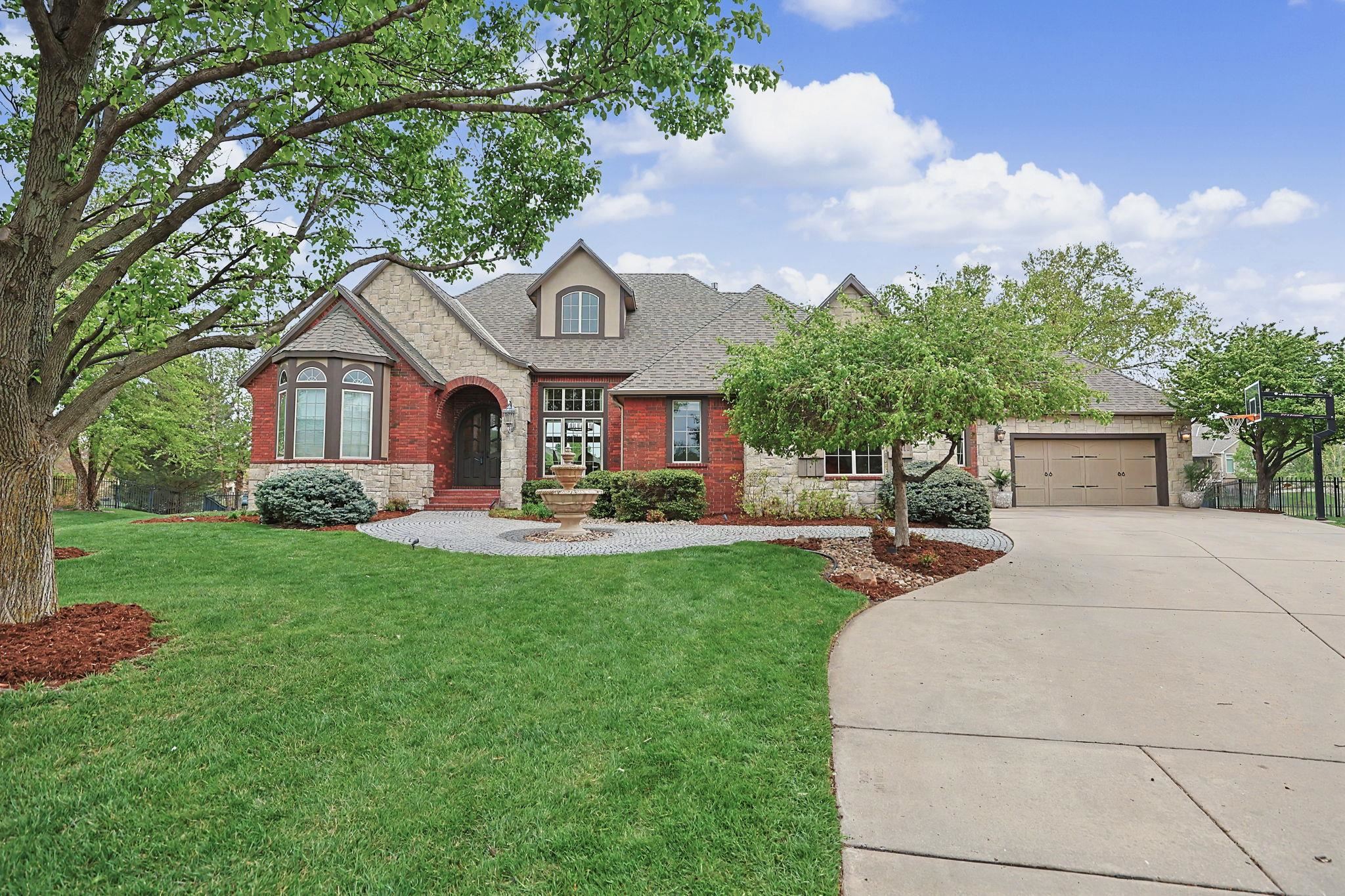 Located inear 21st and 127th Streets, this home offers an unbeatable East Wichita location - close to top-rated public and private schools, fine dining, shopping, fitness centers, country clubs, and convenient highway access. Impeccably maintained and in excellent condition, the home features a smart, functional floor plan designed for effortless living and entertaining. Stunning curb appeal welcomes you with grand double front doors, soaring ceilings, and abundant natural light throughout. Situated on an oversized, quiet lake lot, the backyard is a true retreat - complete with a heated and cooled saltwater pool with new liner, built-in hot tub, outdoor kitchen, pergola, putting and chipping greens, firepit, wrought iron fencing, irrigation well, and serene lake views. Decorative metal palm tree sculptures with lighting remain with the home. Additional highlights include a Class 4 impact-resistant roof, new deck, tankless water heater, water softener, real hardwood floors, oversized three-car garage, and a large storage room with built-in shelving. The spacious main level offers a family room, private office, and a beautifully appointed kitchen with high-end appliances and updated lighting. The walk-out, view-out basement features a massive rec room with wet bar, theater room, and generous living space. All bedrooms are well-sized, including a luxurious primary suite with an expansive bathroom and oversized closets. This exceptional property truly combines comfort, quality, and lifestyle - an outstanding opportunity for refined yet easy living.