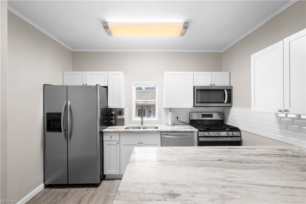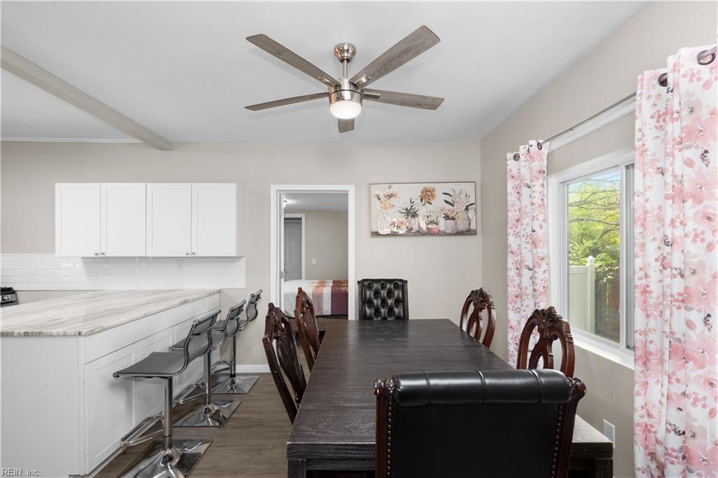 Fully renovated 4 bedroom and 3 full bathrooms includes 1st and 2nd floor primary bedrooms with ensuite ... great for multi-generational or rental options. Since 2024, updates include new roof, siding, windows, dual HVAC, flooring, light fixtures, and blinds. Full kitchen remodel with granite countertops and huge prep island. Front and backyard spaces to enjoy. Detached garage AS-IS but has potential for flex space. And the beach is in sight... just up the street!