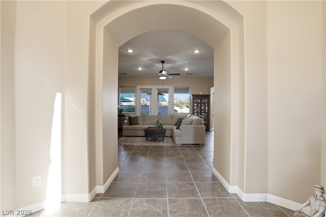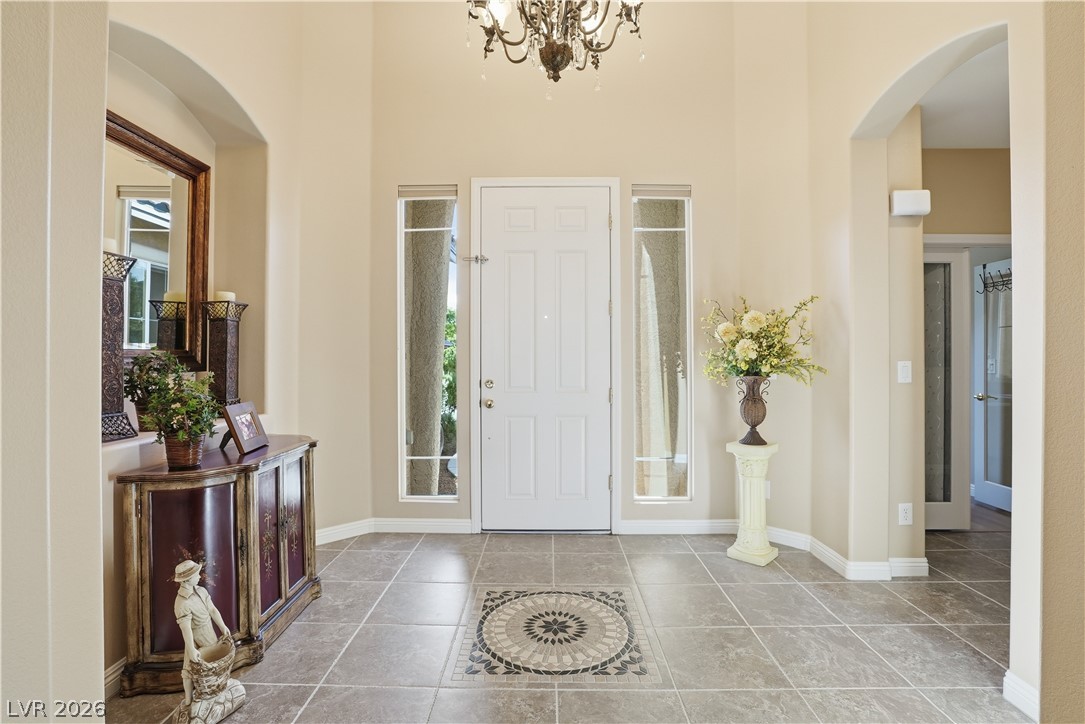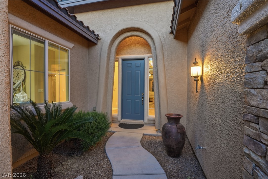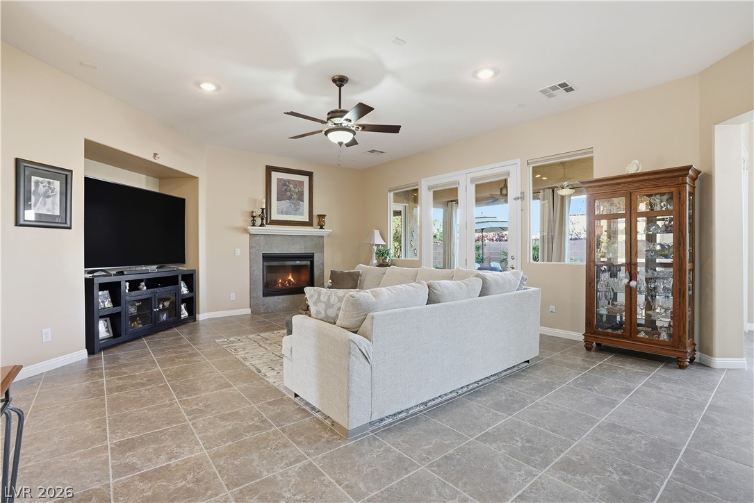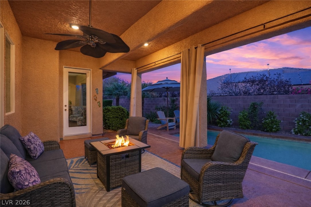 Discover single story living in the gated Yellowstone at Mountains Edge community with this spacious 2,866 sq ft, 5 bedroom, 4 bath home designed for comfort and indoor outdoor enjoyment. A private courtyard entry sets the tone, leading into an open layout with plenty of natural light and anchored by a warm family room fireplace. The kitchen and living spaces flow seamlessly for everyday living and entertaining. The laundry room offers added convenience with cabinetry and a sink. Step outside to the private backyard featuring a sparkling pool, covered patio, firepit, and pavered walkways, creating multiple areas to relax or host gatherings. Community amenities enhance the lifestyle with parks, trails, and recreation options and conveniently located near shopping and dining. A rare blend of space, privacy, and outdoor appeal in one of Mountains Edge's most desirable gated neighborhoods.