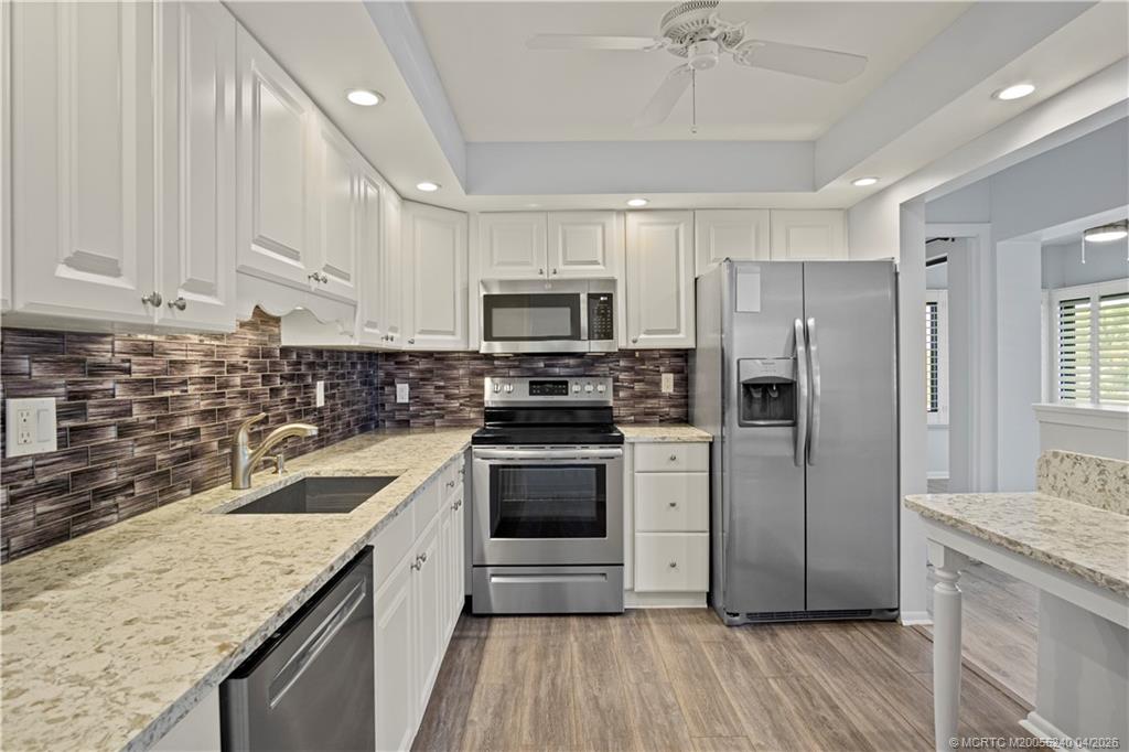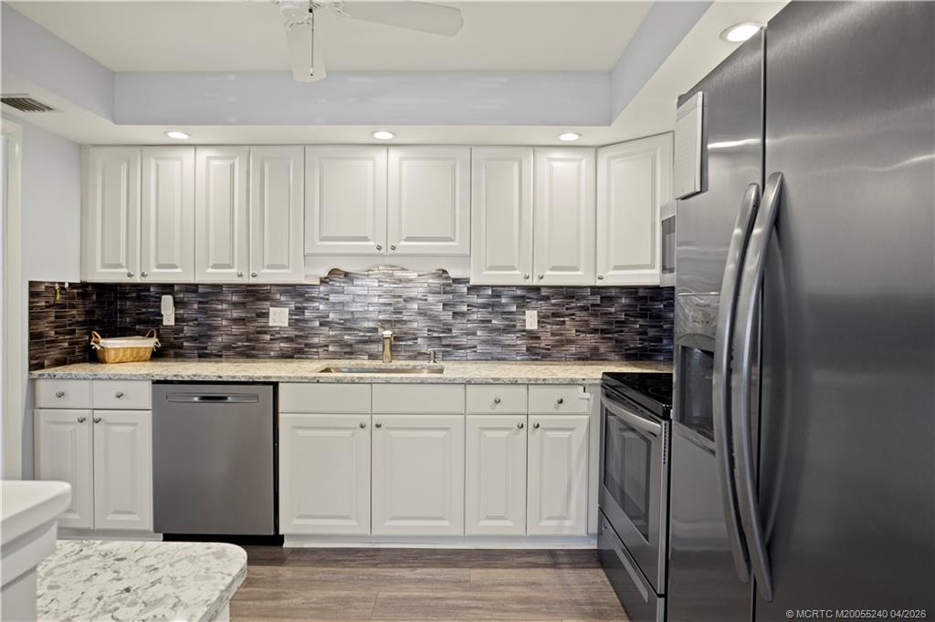 Elevator, Pet Friendly Building - Trucks Allowed in Community. Relax/Fish on the Day Dock/Pier on the Saint Lucie River - Adjacent to Martin County Sailfish Sands Golf Course - Very Clean Bright Condo w/ Western Exposure for Beautiful Sunset Views. Renovated throughout- Special Features include Kitchen with Newer (never used) SS Appliances, Quartz Counters, Recessed Lighting, Built-in Desk (or food prep area), Coffee Bar, Deep Oversized Sink, Tile Backsplash. Enclosed Sunroom offers Additional Living Space - Luxury Vinyl Plank Flooring - Modern Ceiling Fans & Lighting - Baths with Quartz Vanities, Custom Tiling - Calif Style Cabinetry in Bedroom Closets - Plantation Shutters - Washer/Dryer in Unit - Clubhouse Complex w/ Sparkling Pool, Large Gym, Pickleball, Tennis, Shuffleboard, Bocce, Game Room, Ballroom, Billiards, Ping Pong, Kayak Storage. PLUS - Perfect Stuart Location! Many Residents Walk/Bike to Stores, Restaurants, Theatres and just 7 minutes to Downtown Stuart and Beaches.