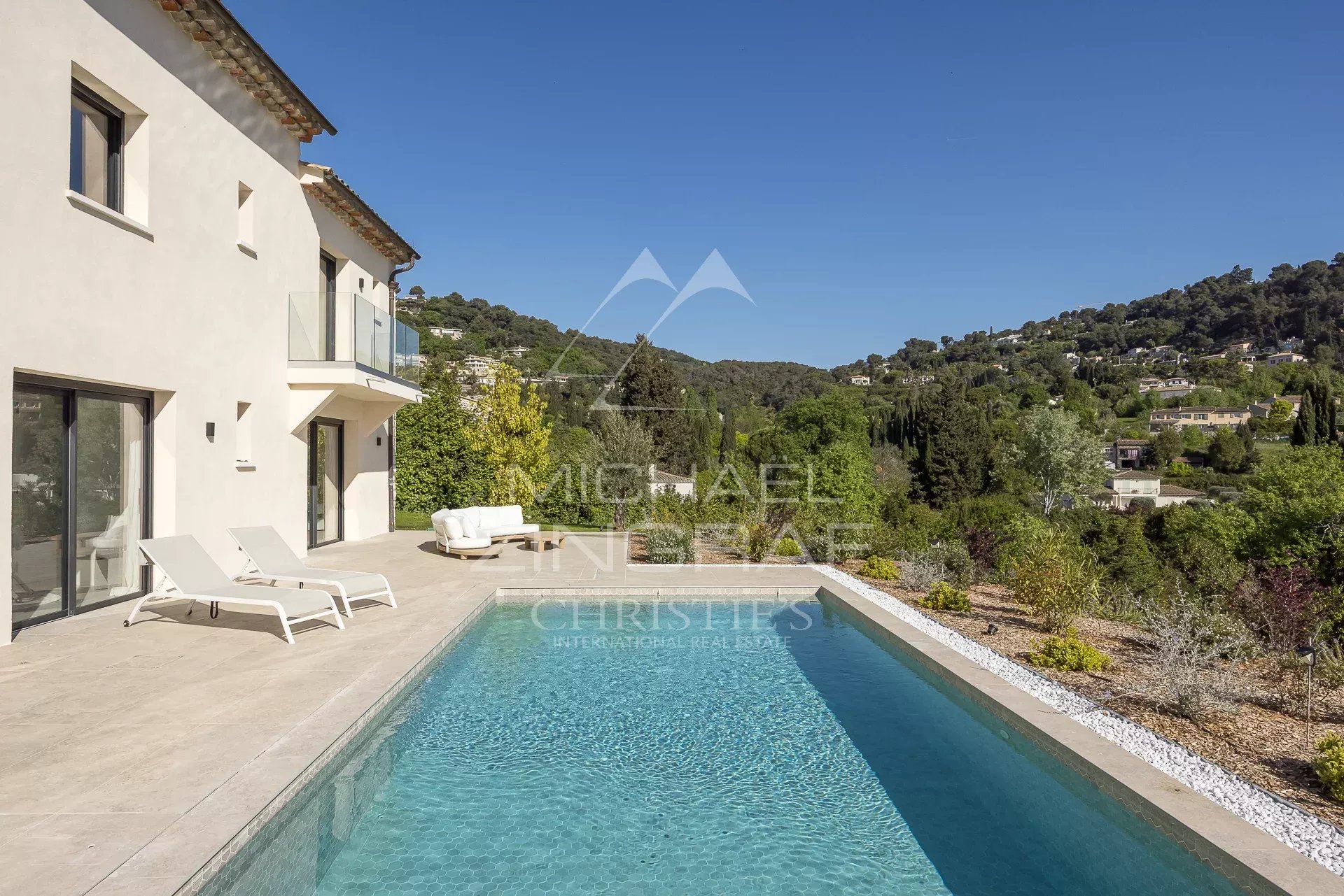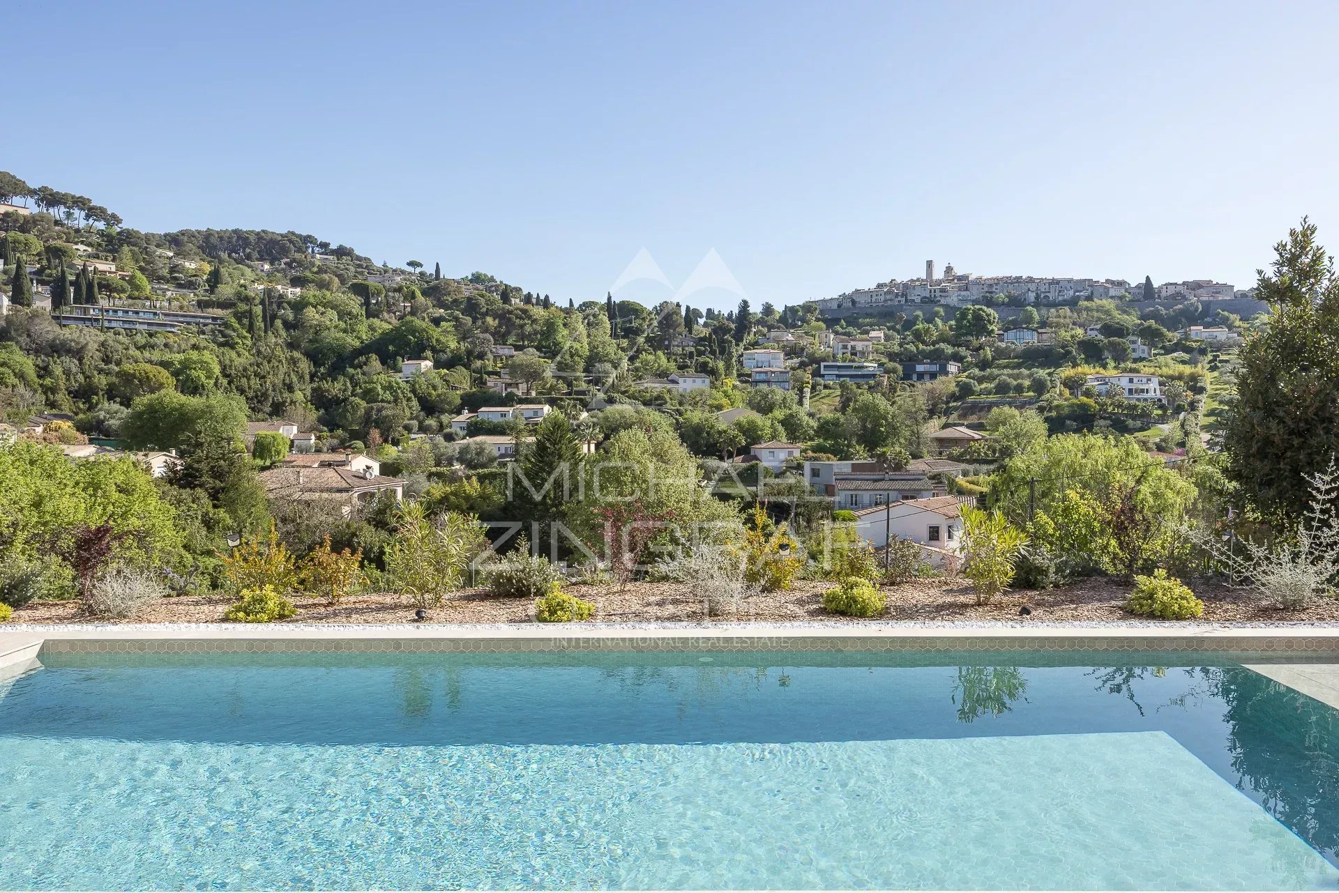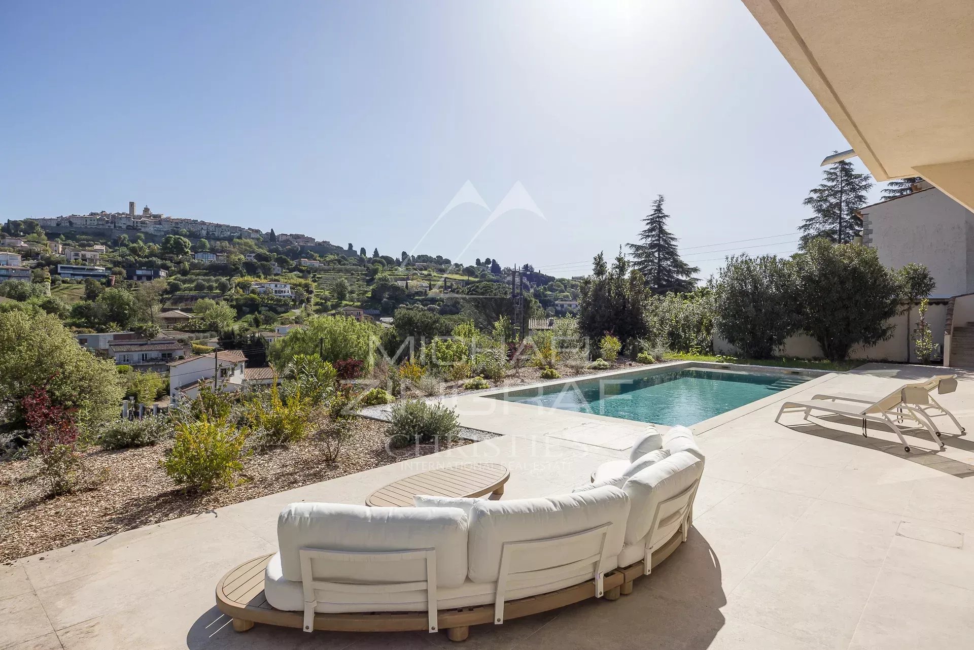 The living areas open onto the outdoors with several terraces and a swimming pool, offering a pleasant setting and breathtaking views over Saint-Paul de Vence.