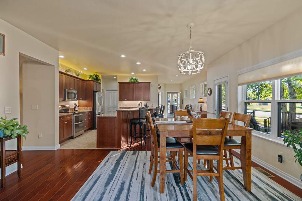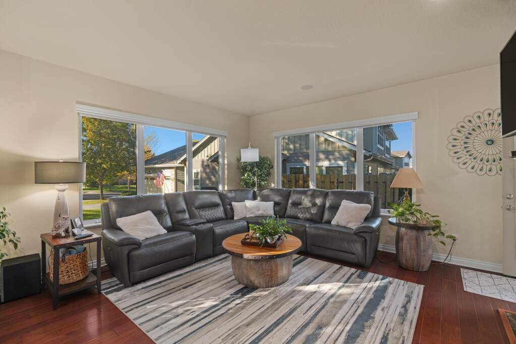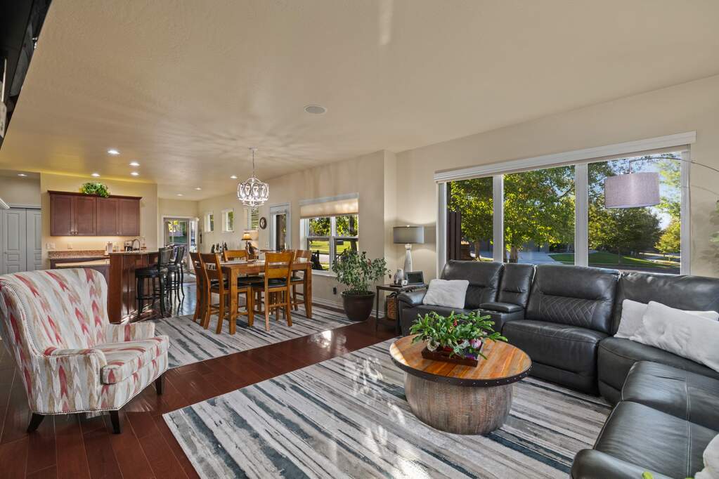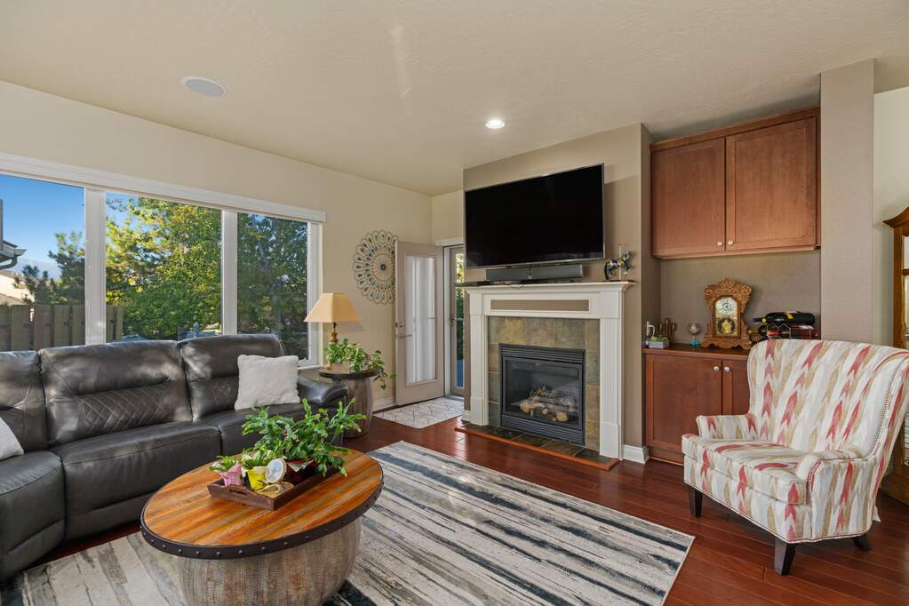Located in the sought-after Ranch Club community, this spacious townhome offers 3746 sf including 2 primary ensuite bedrooms, 4 total bathrooms, 2 living rooms, theater room, & plenty of storage. As you step into the home, you walk into an open-concept kitchen, dining & living room space. The kitchen offers long granite counters with a raised breakfast bar perfect for casual dining options. With updated stainless appliances & cherry cabinets, you'll feel right at home while you're cooking. The living room offers a gas fireplace promising cozy evenings & a welcoming ambiance. Just off the dining area, you'll find a side deck perfect for grilling. Additionally, off the living room & main level, primary bedroom you can escape to your back deck surrounded by cozy common area landscaping. That primary bedroom also offers a large walk-in closet, full bathroom including shower and jetted tub. The main floor also has a 2nd bedroom, guest bathroom, laundry & 2-car garage access making this home great for main level living. Upstairs offers a 2nd ensuite bedroom and full bathroom. Downstairs enjoy the 2nd living room, theater, another bedroom, bathroom, and storage space. The theater room comes with 2 rows of 3 lit, reclining chair perfect for movie nights at home! Missoula's premier Ranch Club restaurant, pool, clubhouse, and golfing are just a short walk away! The North Reserve shopping area is just 10 minutes away. Overall this spacious, low maintenance townhome is move-in ready offering main level living while also accommodating a large household or company with plenty of spaces to entertain whether it be in the open kitchen/living room space, back deck, downstairs living room, or theatre. This townhome has it all!