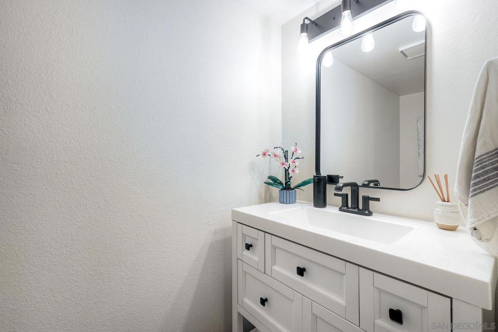 Upscale living in the Golden Triangle! This home greets you with double-height ceilings and abundant natural light, an open floorplan, and sophisticated designer touches, creating a comfortable, upscale living environment that blends comfort, style and functionality. The kitchen features new cabinetry and stainless steel KitchenAid appliances, Alpine Valley granite countertops, oversized apron-front sink and tile-to-ceiling backsplash. Wood floors, stunning new bathroom remodel with Villa Porcini polished porcelain tile, and fresh designer paint complete this exceptional offering. Located in the highly desirable Golden Triangle, this rarely available detached residence in the beautifully maintained Barcelona community is tucked away in a quiet interior location - the home backs to a greenbelt, providing a sense of privacy and a serene backdrop for the backyard patio and garden retreat. Residents enjoy access to lifestyle amenities including a pool, spa, walking trails, and nearby La Jolla Colony Park. Upscale living in the Golden Triangle! This home greets you with double-height ceilings and abundant natural light, an open floorplan, and sophisticated designer touches, creating a comfortable, upscale living environment that blends comfort, style and functionality. The kitchen features new cabinetry and stainless steel KitchenAid appliances, Alpine Valley granite countertops, oversized apron-front sink and Villa Porcini polished porcelain tile-to-ceiling backsplash. Wood floors, stunning new bathroom remodel, and fresh designer paint complete this exceptional offering. Located in the highly desirable Golden Triangle, this rarely available detached residence in the beautifully maintained Barcelona community is tucked away in a quiet interior location - the home backs to a greenbelt, providing a sense of privacy and a serene backdrop for the backyard patio and garden retreat. Residents enjoy access to lifestyle amenities including a pool, spa, walking trails, and nearby La Jolla Colony Park.