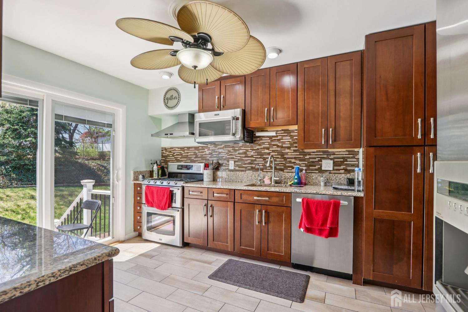 Discover the perfect blend of architectural character and modern functionality in this spacious, updated Bi-Level home situated on a generous 0.29-acre lot in one of Edison's most convenient corridors. The main living level features soaring vaulted ceilings and recessed lighting, creating an airy, sophisticated atmosphere that flows seamlessly across refinished hardwood floors. The updated kitchen serves as the heart of the home, offering direct access to the rear grounds and opening into a formal dining area. Just off the dining room, a versatile bonus room with large windows provides a secluded space ideal for a quiet home office or library. The upper level offers comfortable sleeping quarters, while the lower level significantly expands the living footprint. Here, you will find a substantial recreation room, a conveniently expanded laundry room, and a recently upgraded full bathroomproviding a complete and private living suite. Outdoor living is a highlight of this property; the kitchen leads to a stunning, fully fenced, terraced backyard. This outdoor oasis features a massive patio shaded by a custom pergola, with tiered levels that offer distinct zones for gardening, relaxation, and entertaining. Additional features include a spacious 2-car garage and well-maintained mechanical systems throughout. Positioned with excellent proximity to Route 1, this home offers effortless access to the New Jersey Turnpike, Garden State Parkway, and the Edison and Metuchen train stations for a streamlined commute. A rare find that combines updated interiors with a truly exceptional landscape!