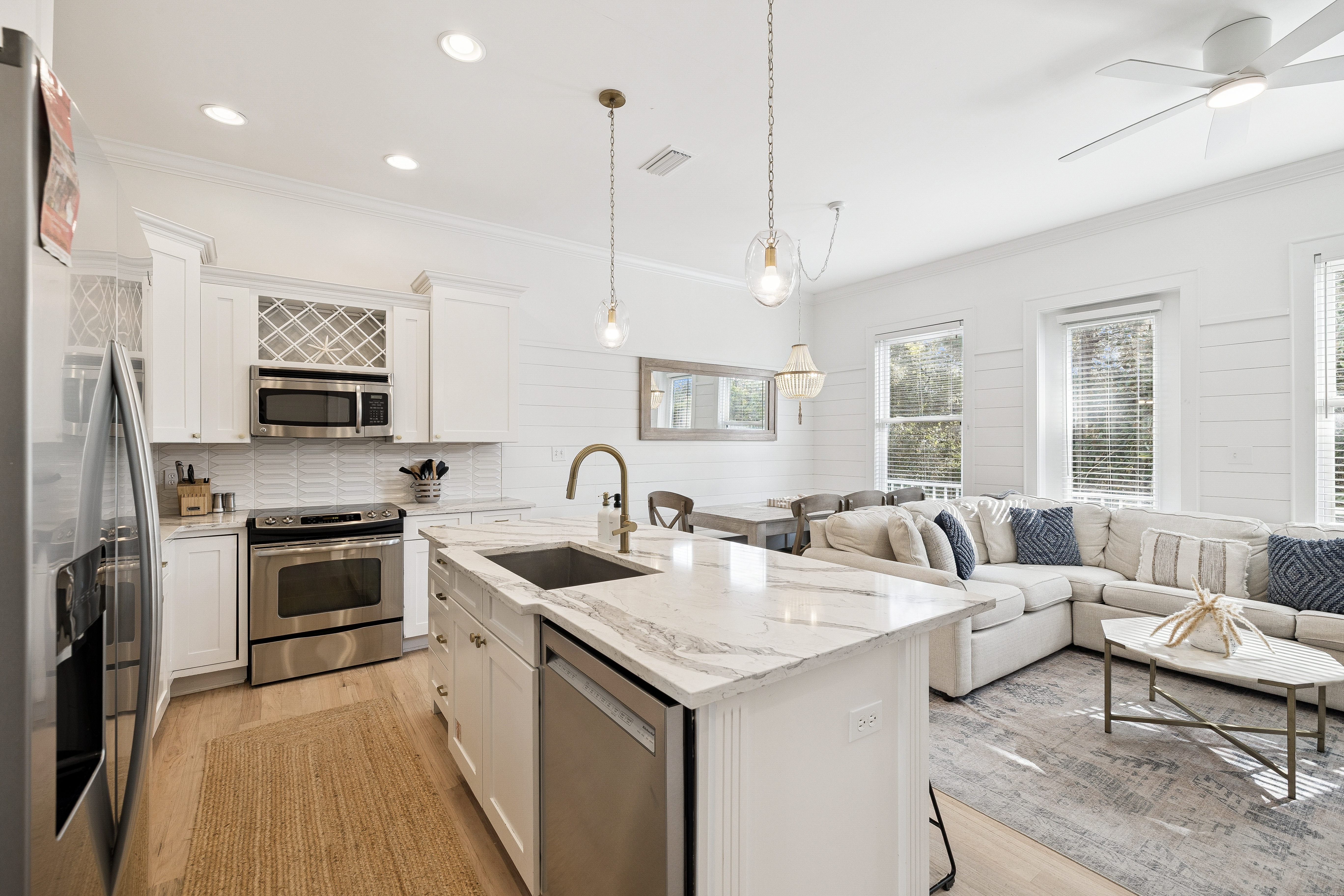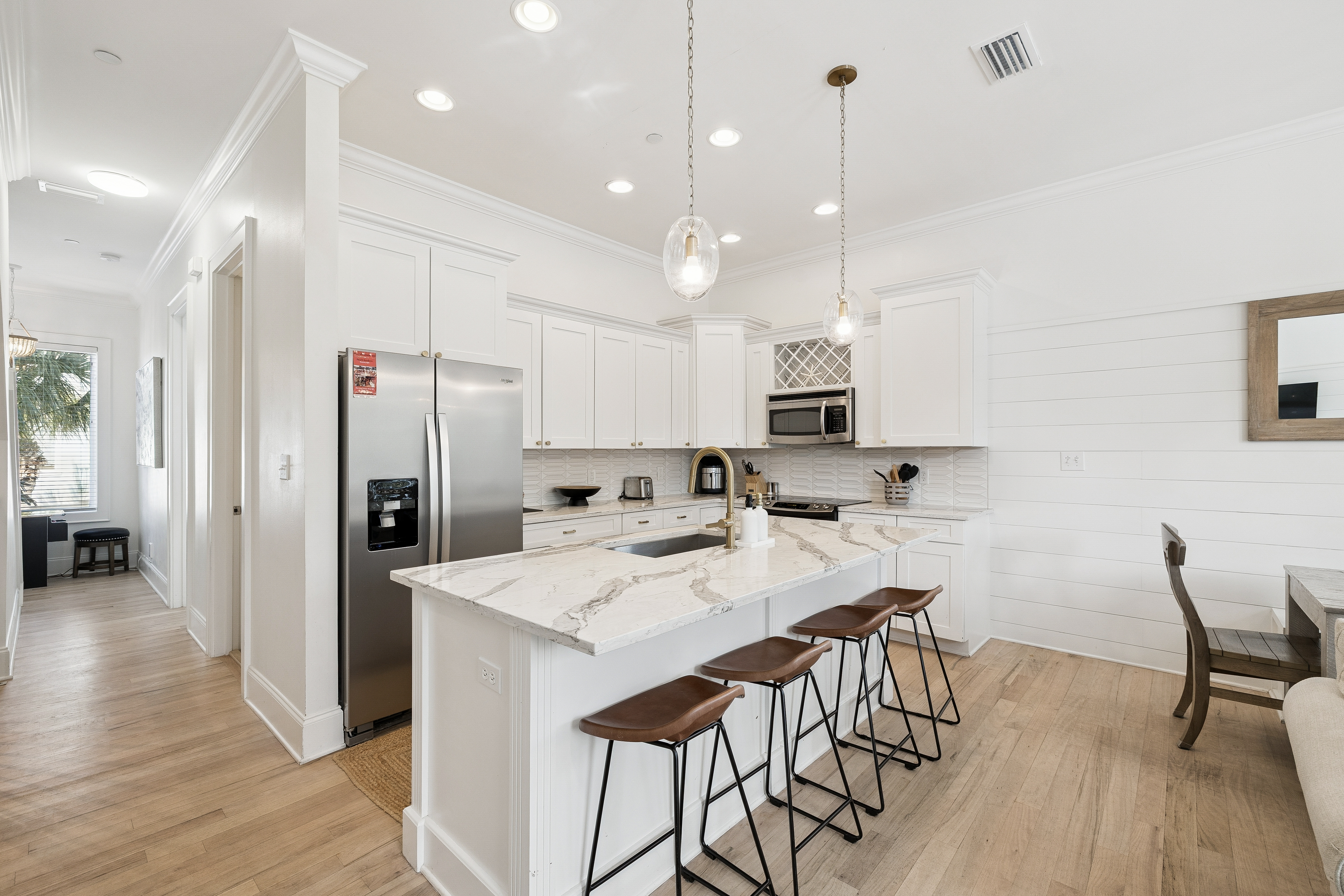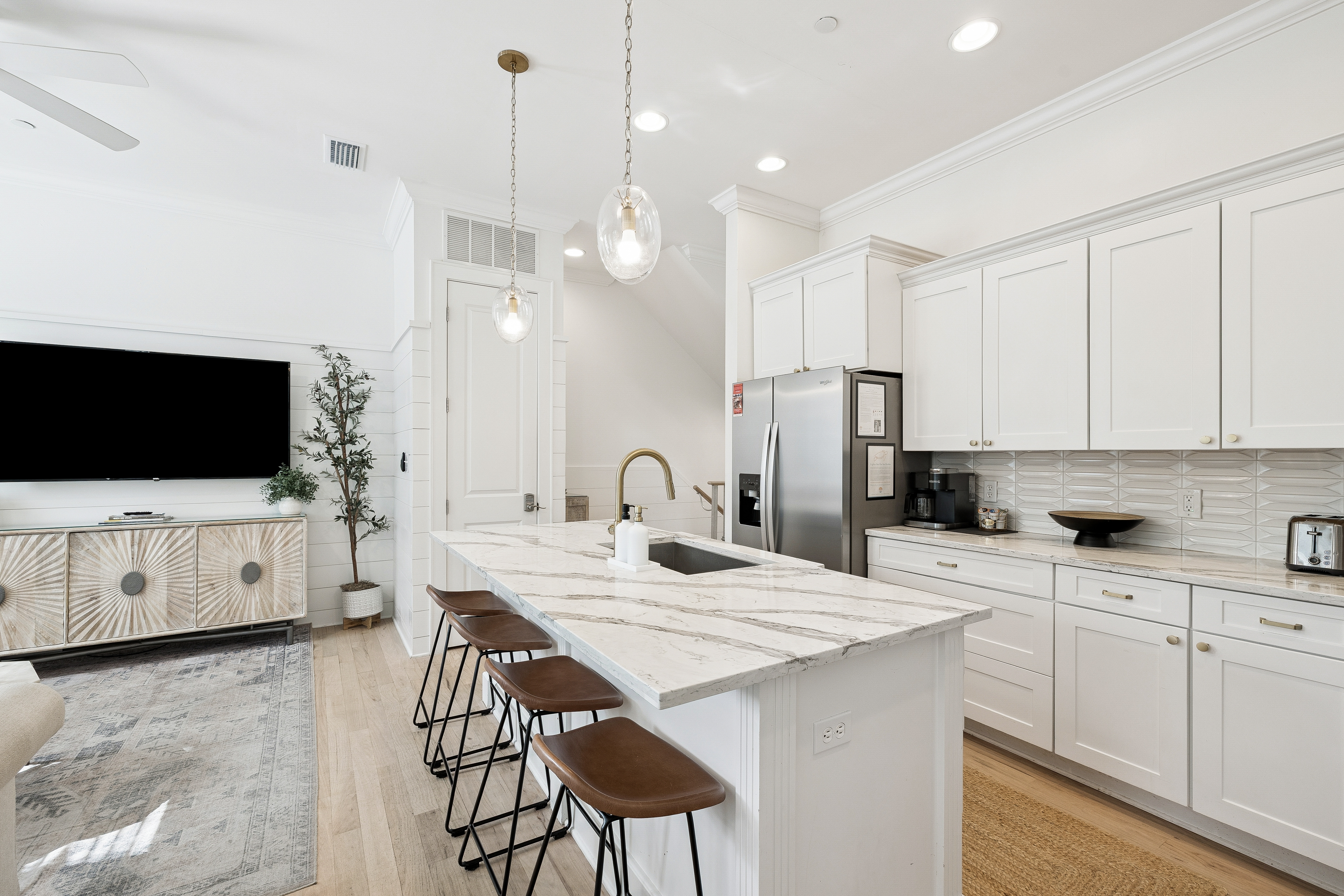 Tucked within Summer Place, a charming enclave of townhomes just off Scenic 30A, this beautifully renovated coastal residence offers an elevated take on beachside living with Gulf views, refined interiors, and exceptional outdoor living spaces creating an ideal full-time residence, second home, or investment opportunity. Spanning multiple levels, the layout is designed for both privacy and entertaining, with carefully curated spaces that balance comfort and style throughout. The first level features a private guest bunk suite complete with a game table, creating the perfect gathering space or separate retreat for guests. The second level serves as the main living area, where the renovated kitchen, dining, and living spaces flow together seamlessly in a bright, open-concept design, along with a guest suite for added convenience. The third level is dedicated to the primary suite and an additional guest suite, offering a peaceful escape removed from the main living areas. Crowning the home is the rooftop deck, designed for true indoor-outdoor coastal living, featuring two separate lounging spaces with Gulf views, ample room to enjoy sunset gatherings or dine al fresco, and a beverage center with a beverage refrigerator for easy entertaining. A one-car garage, with an included golf cart, adds convenience and additional storage, completing the home’s thoughtful layout and functionality. This location offers the best of the 30A lifestyle, with a community pool, multiple public beach accesses nearby and the shops, dining, and entertainment of Gulf Place just a short stroll away. Enjoy local favorites like Shunk Gulley, Papa Surf Burger Bar, Kith and Kin Coffee, and Renaissance French Restaurant, all just moments from your front door, making it easy to enjoy the walkable, coastal lifestyle that makes this area so desirable.