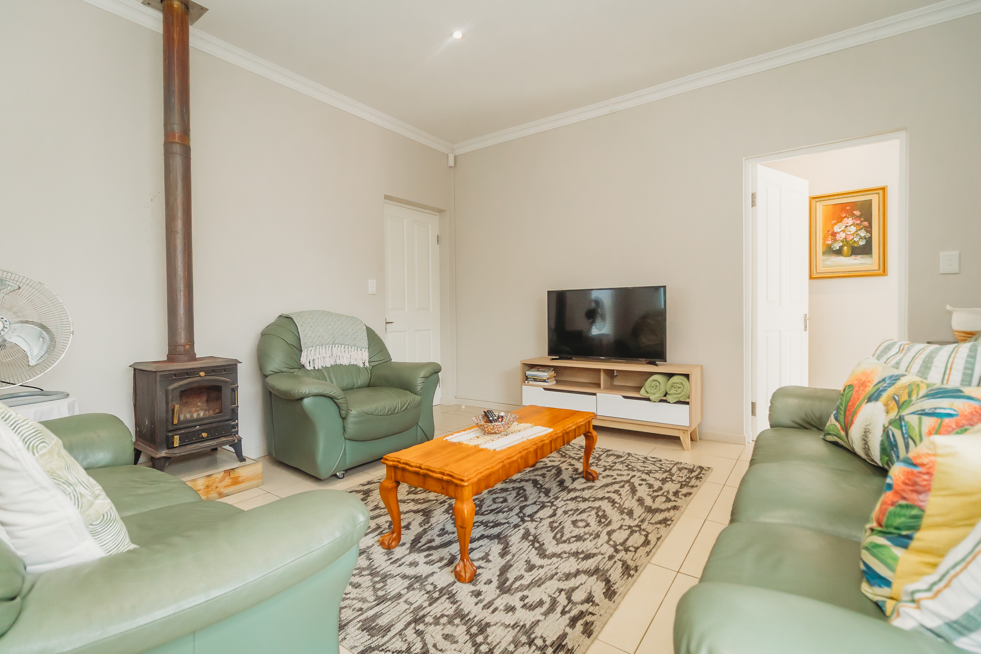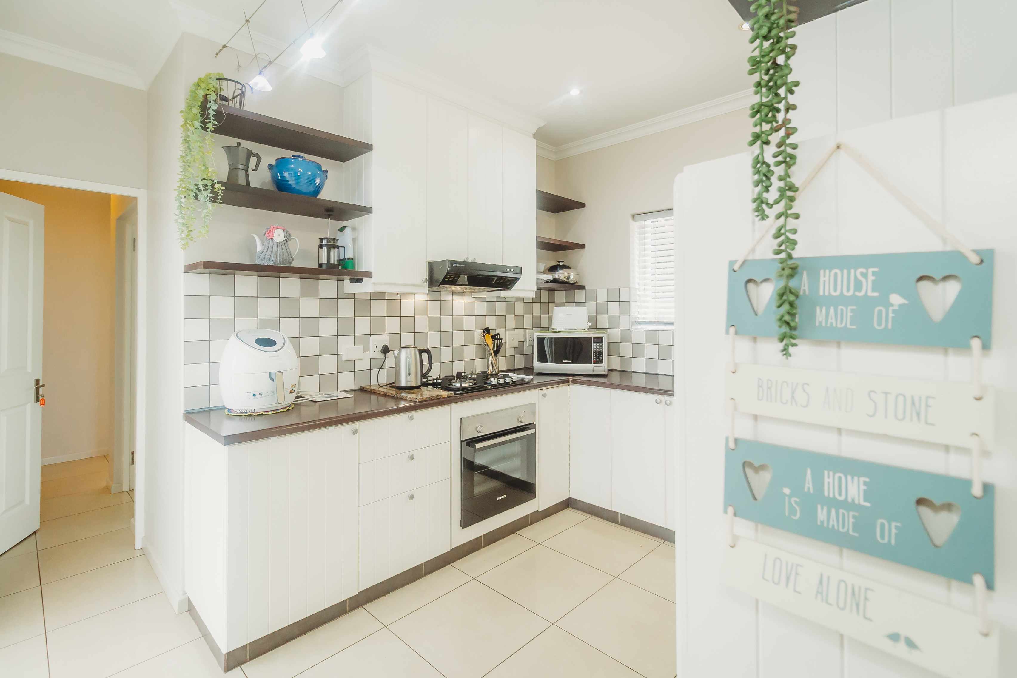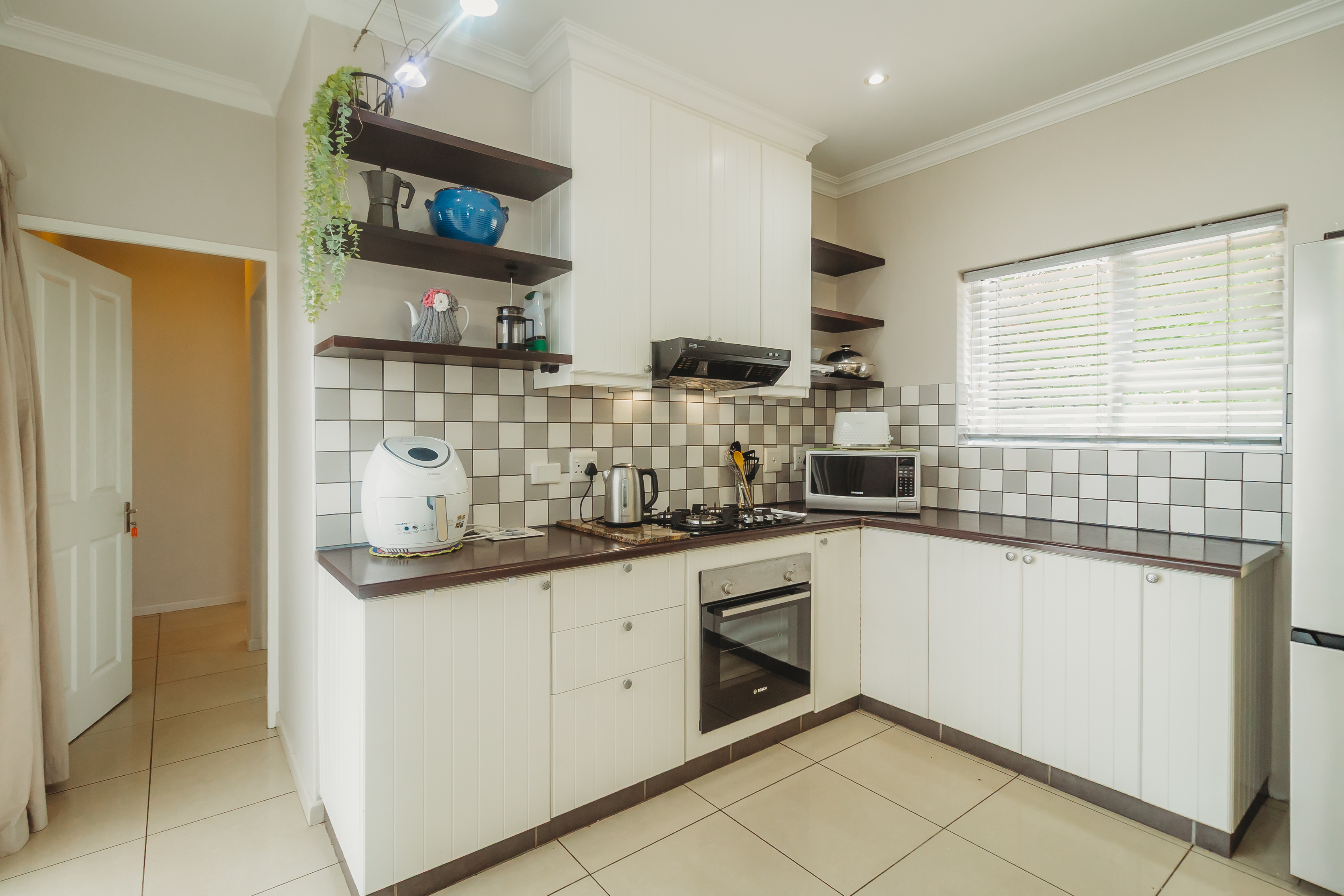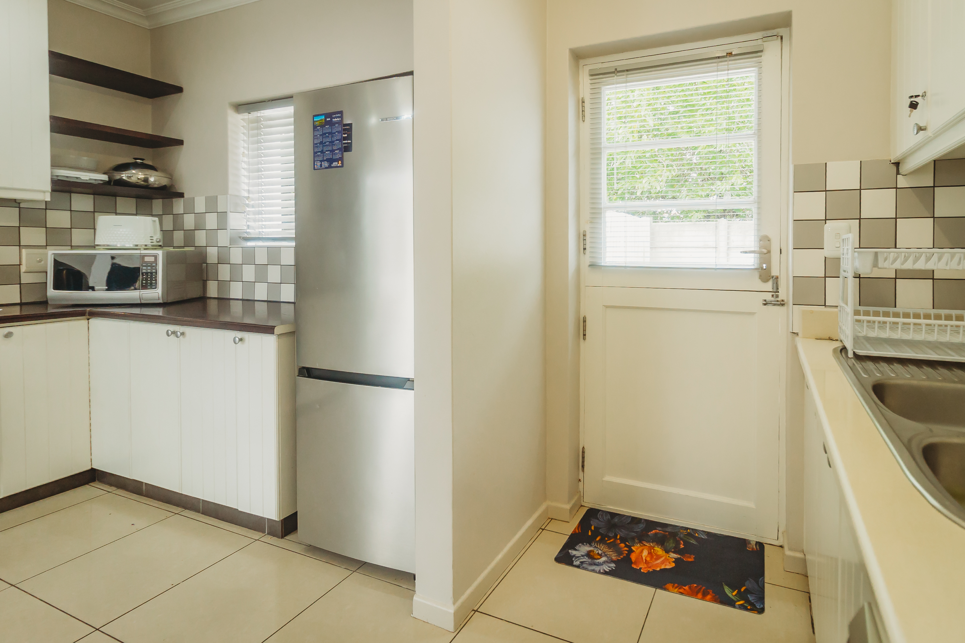 The generously proportioned double garage offers direct access into the home and includes integrated laundry facilities. Security features are comprehensive, with an interior alarm system, burglar bars, and Trellidoors ensuring complete peace of mind.