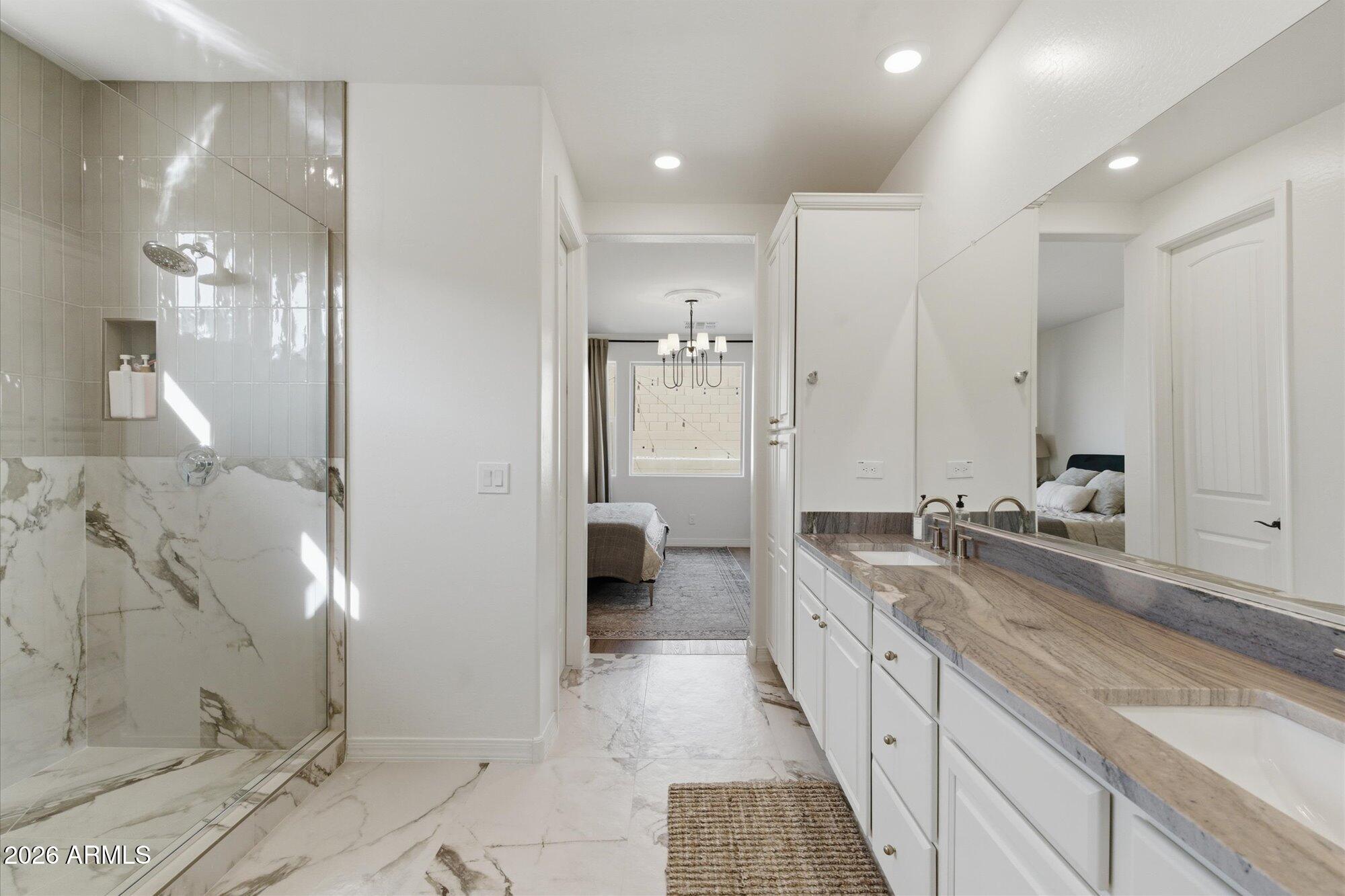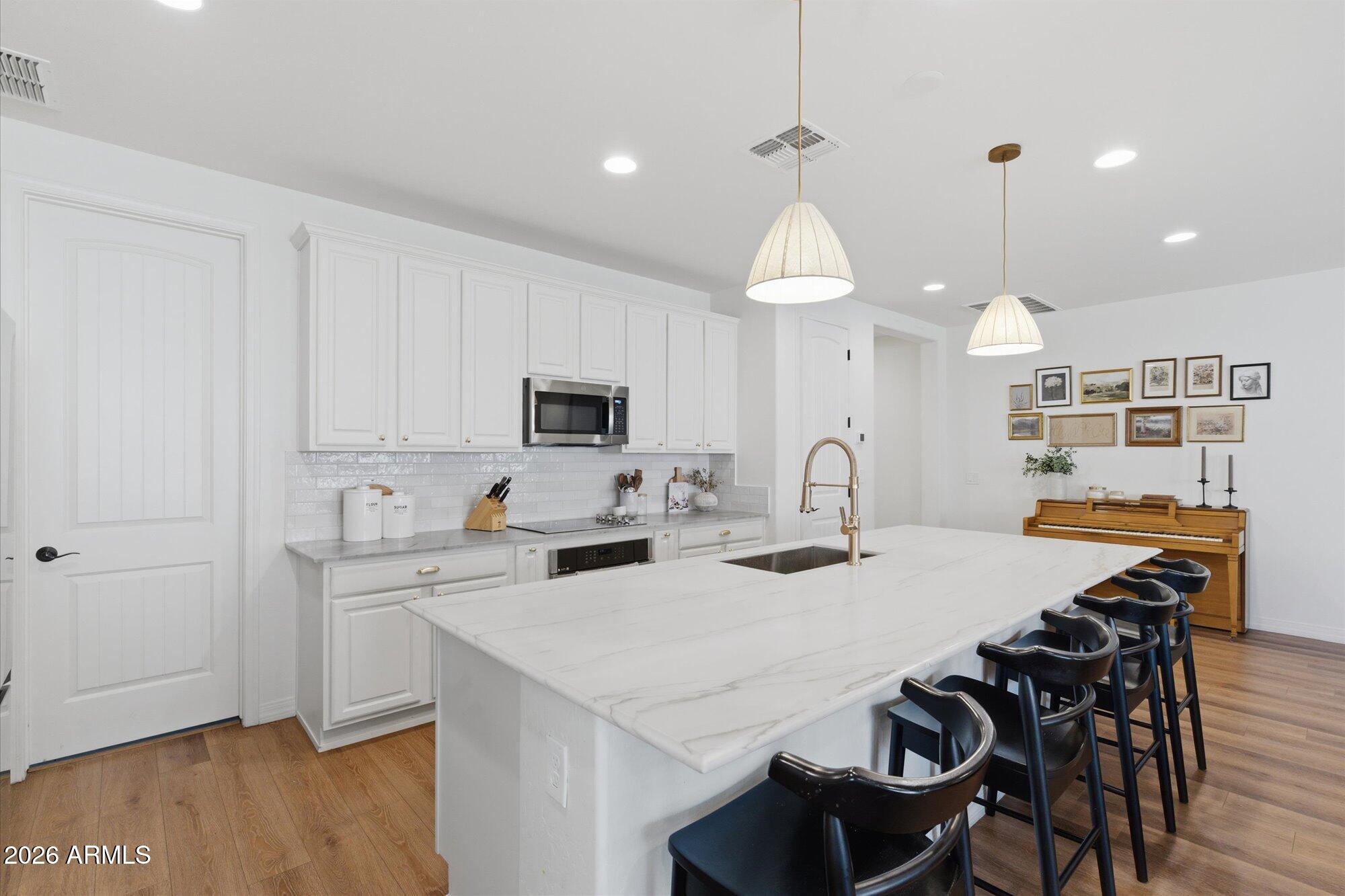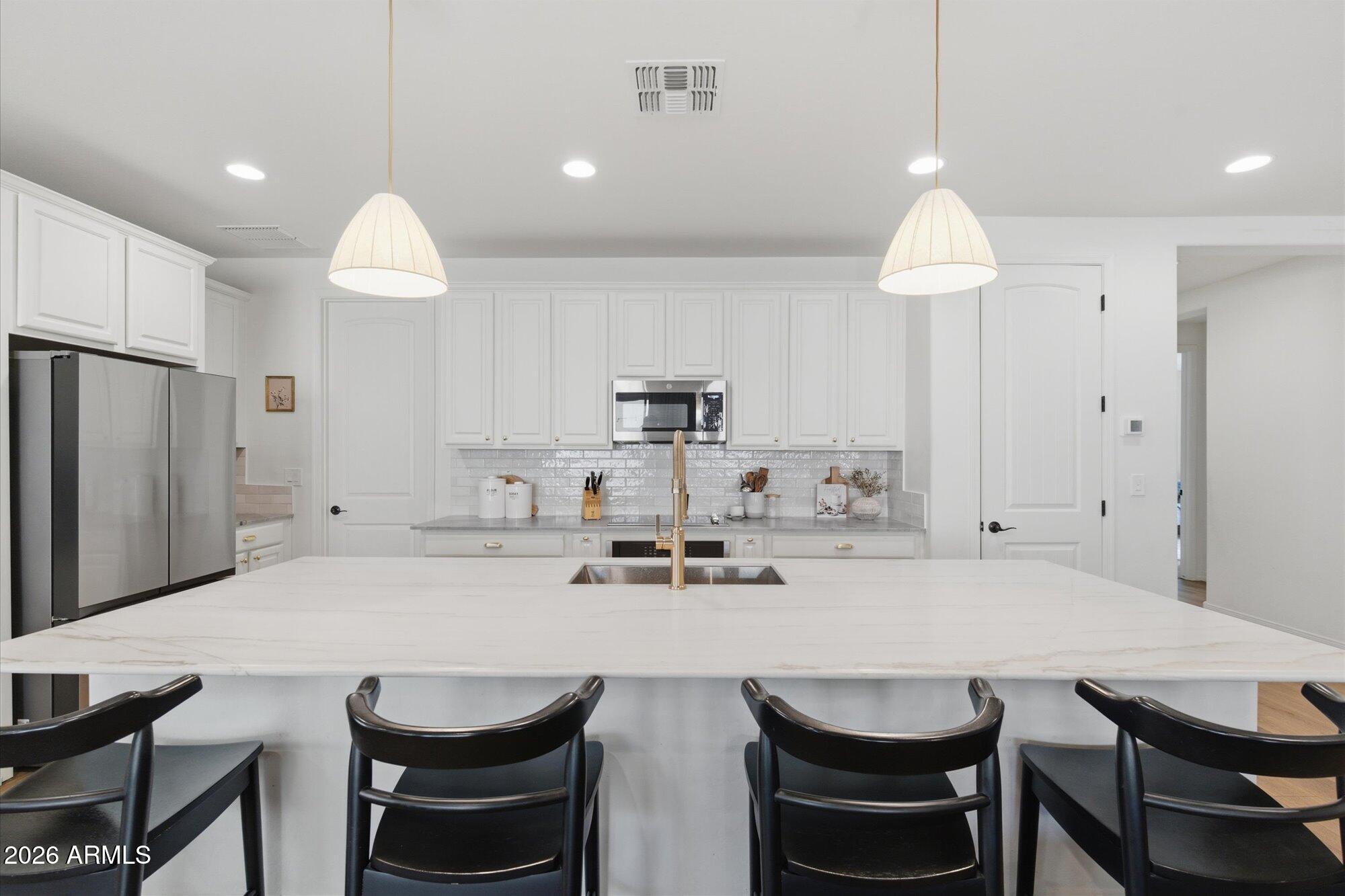 Step into immediate luxury in the heart of Alora Vida, without the wait or hidden costs of new construction. A fully landscaped yard and prime park-side setting make this home ideal for family living. Discover this 4-bedroom, 3-bath residence featuring over $75,000 in renovations that transform the home into a resort-style sanctuary. Inside, the upgraded designer kitchen showcases rare quartzite and sealed marble countertops, anchored by a stunning island with a classic ogee edge, Bedrosians Chloe tile, and designer Delta fixtures. Highlights include an oversized pantry, GE appliances, a Samsung smart refrigerator (2022), and luxury vinyl plank flooring (2022) throughout the main living areas. The sophistication continues in spa-inspired bathrooms, where 24x48 Italian porcelain tile pairs beautifully with timeless Taj Mahal stone. The primary suite offers a walk-in closet and private water closet, while custom sconces illuminate the foyer and living room and checkerboard tile upgrades (2022) add charm. Outside, enjoy a covered patio, turf yard (2022), fire pit, bistro lighting, and extended privacy wall, perfect for entertaining. This isn't just a house; it's a meticulously curated home where every upgrade has been thoughtfully completed, ready for you to enjoy.