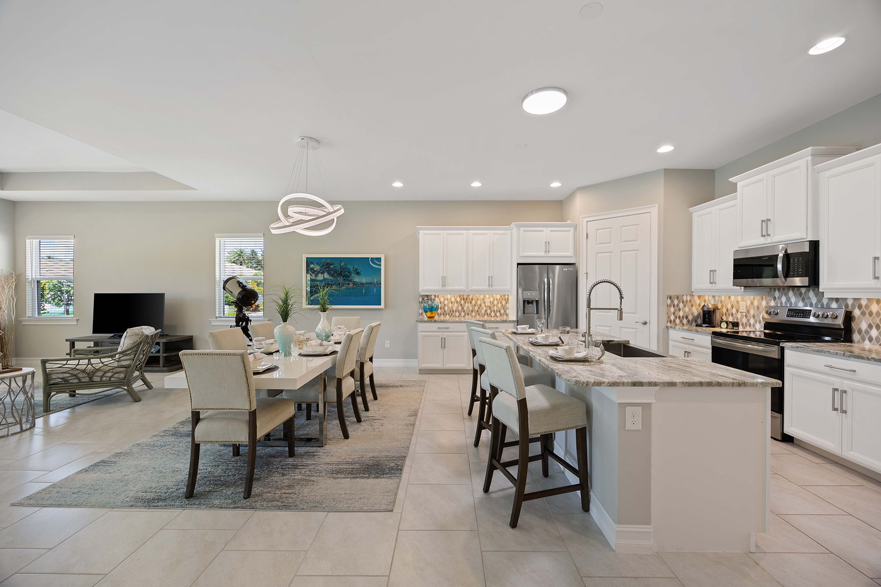 In Naples Reserve, this coastal-inspired ranch residence captures ease of resort living with 3,368 square feet of total space, a three-car garage plus an oversized corner home site. Built in 2018 and lightly enjoyed as a seasonal retreat, the home offers exceptional privacy, lushly landscaped views and polished feel of a property that has been meticulously maintained. The open floor plan is tailored for elegant entertaining and relaxed everyday living, featuring three bedrooms plus a den, two full baths and one half bath. The primary suite is a private sanctuary with direct lanai access, dual walk-in closets and a spacious en-suite bath designed for comfort and convenience. At the heart of the home, the island kitchen showcases white cabinetry, stone countertops, a walk-in pantry and an adjoining dining area that flows effortlessly into the main living spaces. Tile flooring throughout the principal living areas enhances the home's clean, coastal aesthetic. Walls of sliding glass doors open to an exceptional screened lanai that feels like a private resort. Here, a custom pool and spa with spillover, built-in outdoor kitchen, bar seating, and multiple areas for lounging and alfresco dining create the ideal setting for sunset gatherings, weekend entertaining and year-round enjoyment of the Naples lifestyle. Electric rolldown storm screens add ease and peace of mind. Ideally near the Island Club, the home enjoys close access to one of Naples Reserve's celebrated lifestyle amenities. Naples Reserve is a gated, amenity-rich waterfront community designed for those who want every day to feel like a getaway. Residents enjoy a stunning lakefront clubhouse, beach-entry resort-style pool, state-of-the-art fitness center, tiki bar and café, tennis, pickleball and bocce, along with kayaking, paddleboarding and other on-water recreation. Miles of scenic sidewalks and outdoor fitness stations further enhance the community's active, social atmosphere. Lawn care and landscaping are included in the low association fees, offering a lock-and-leave lifestyle with exceptional convenience. Ideally between downtown Naples and Marco Island, this residence offers effortless access to acclaimed dining, luxury shopping, white-sand beaches and the best of Southwest Florida living.