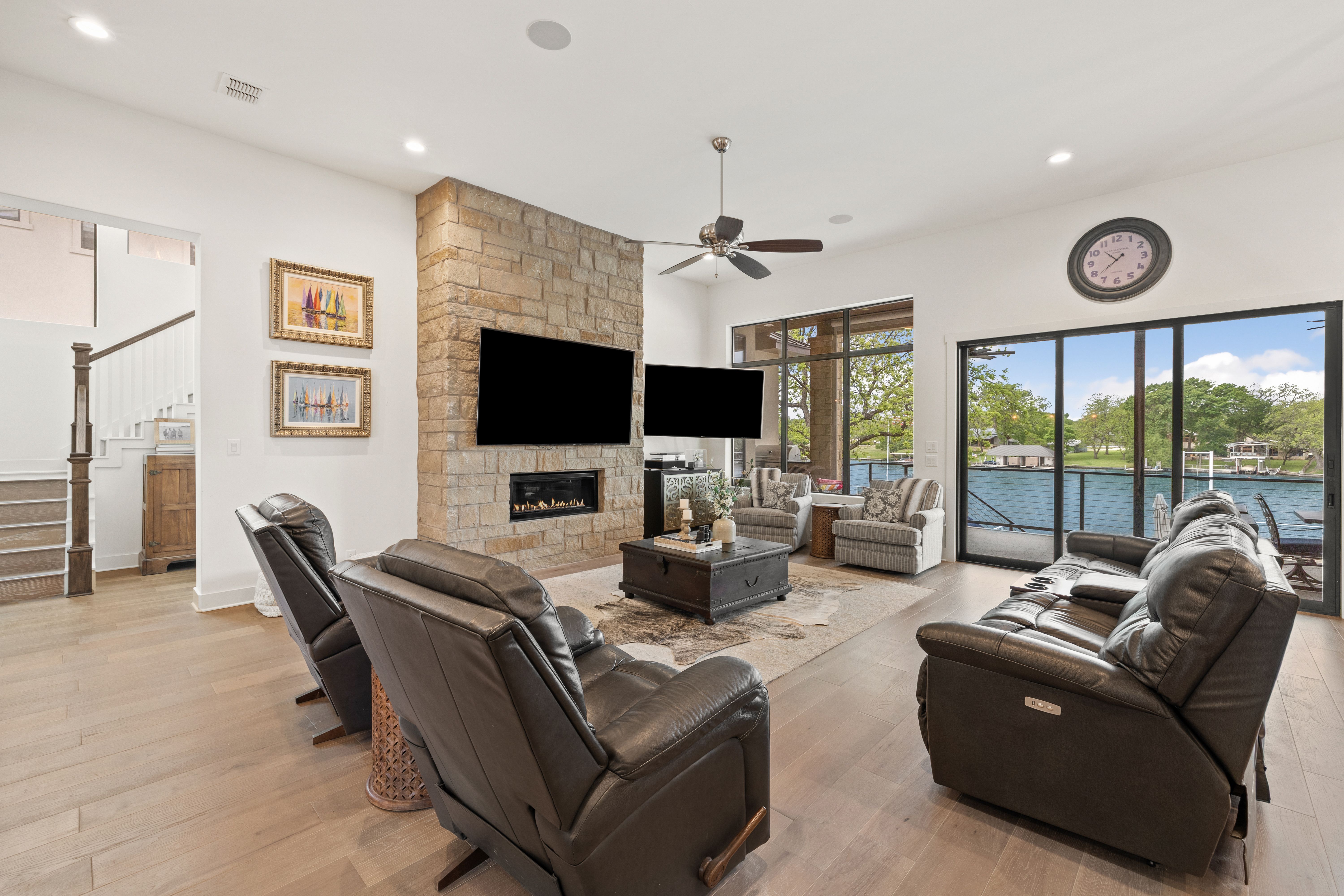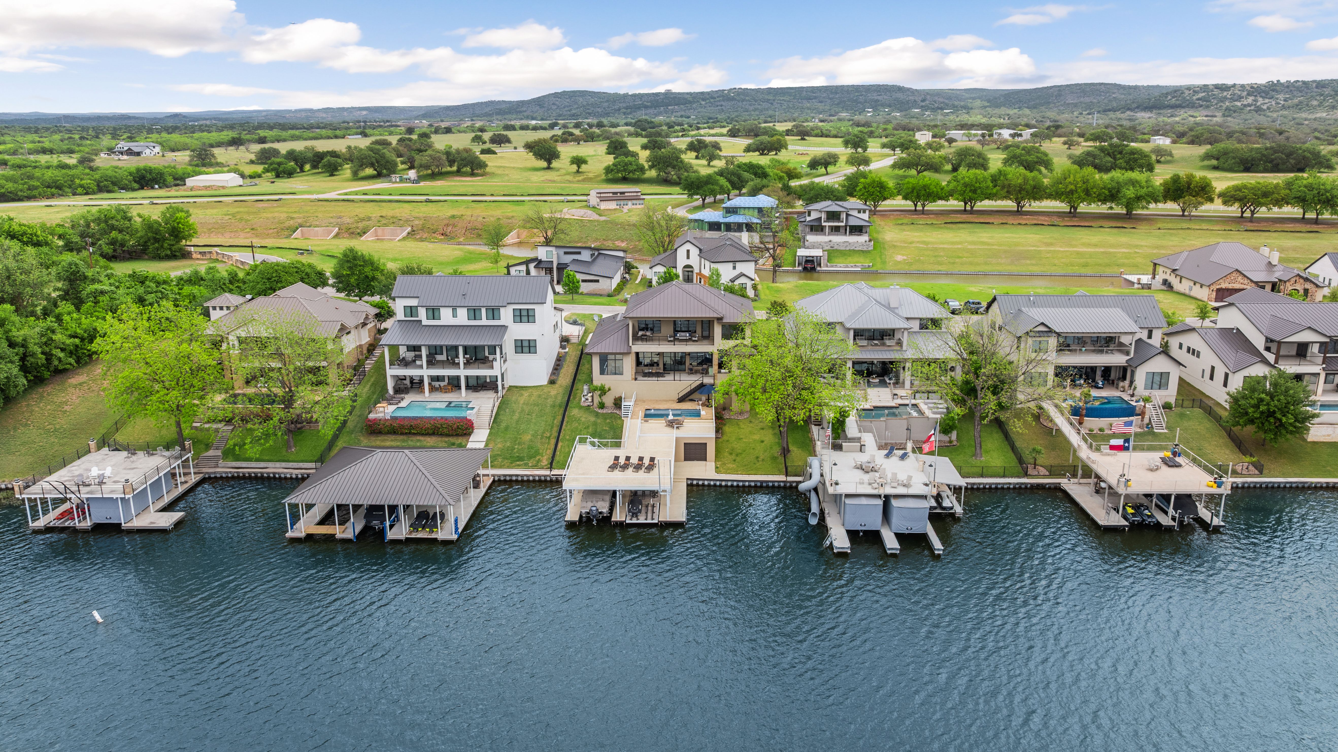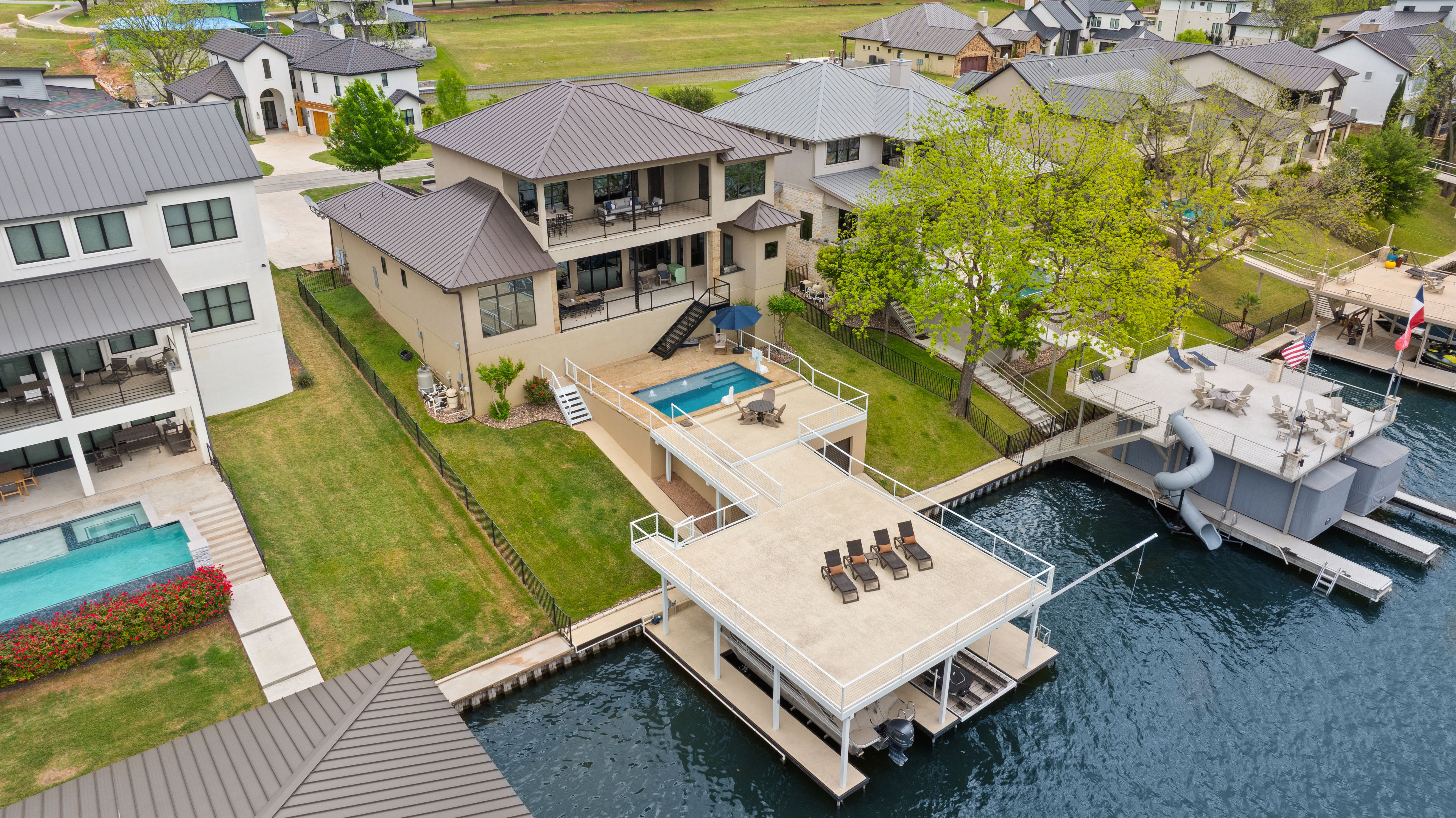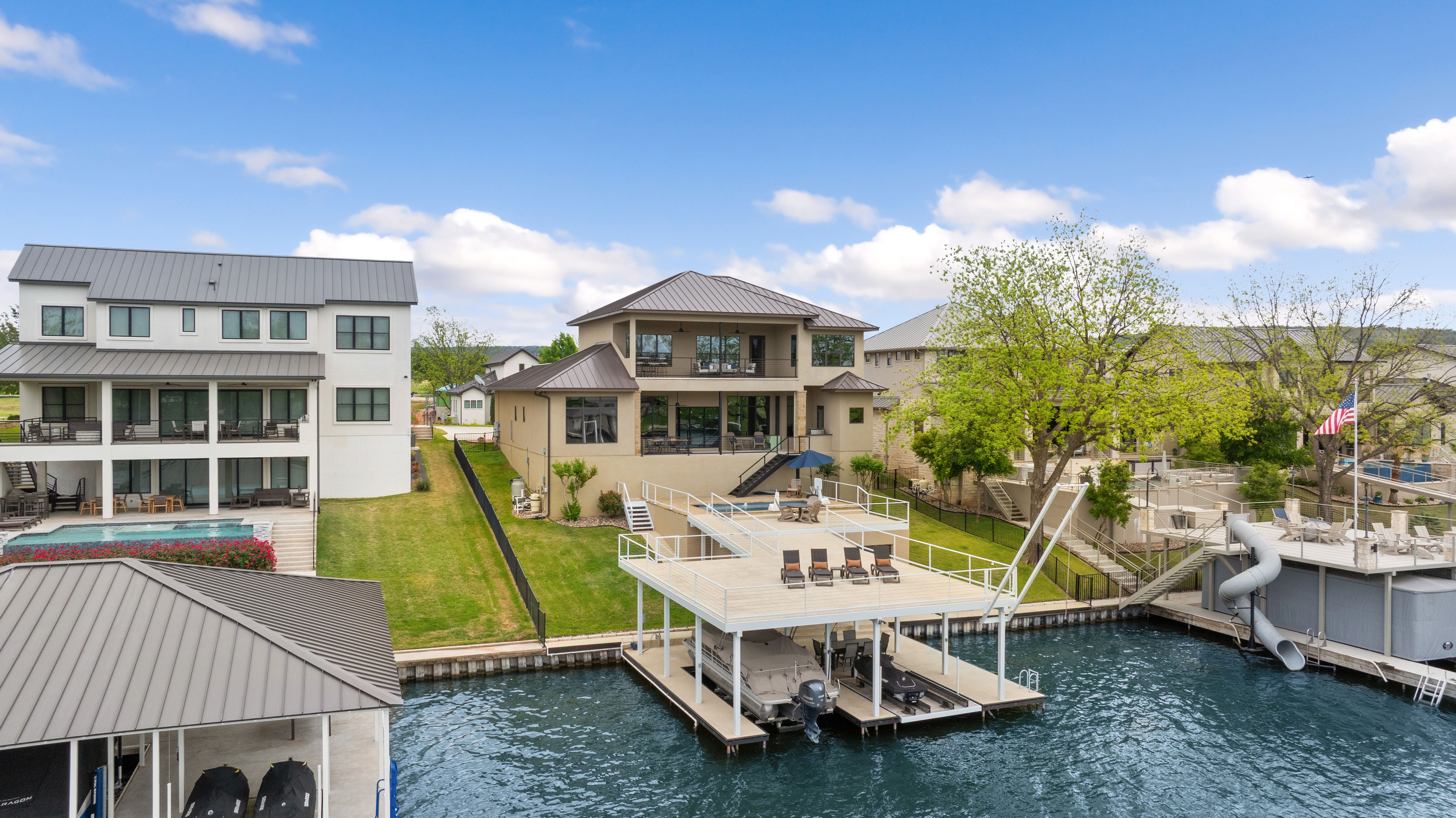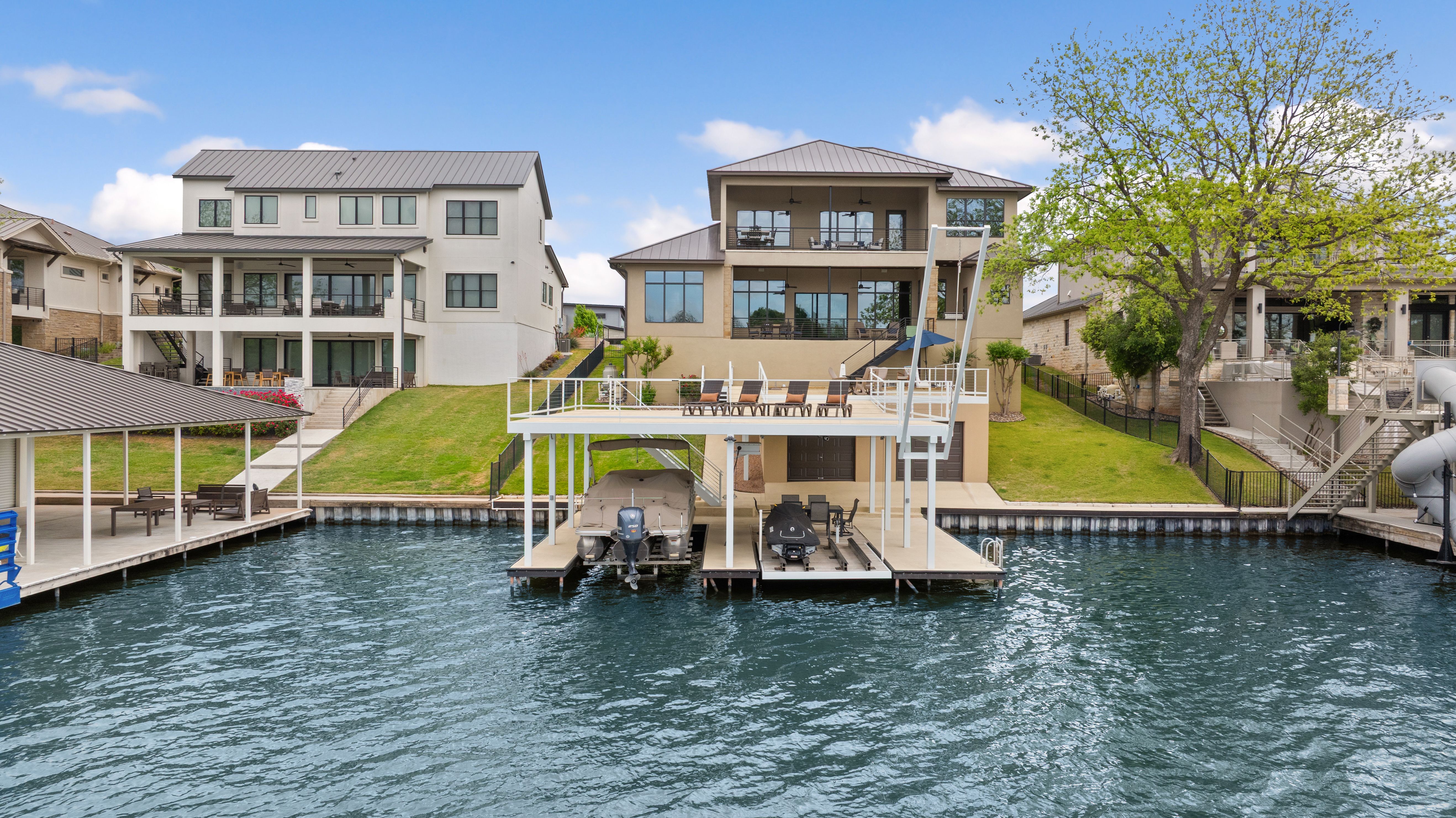 Life is better on Lake LBJ! This stylish custom-built lake house offers quality construction and high-end details, that you would expect in a Keith Wing Custom Built Home. Perfectly designed for large family gatherings or easy everyday living. Enter through a stunning foyer with a wall of windows that frames your first breathtaking view of 80' feet of pristine open waterfront. The expansive open-concept living area flows into a gourmet kitchen, while the main level features a beautiful primary suite with lake views. A second primary suite on main level. Upstairs, a game/media room is surrounded by three additional bedrooms and a bunkroom. Enormous patios on both levels provide exceptional outdoor entertaining space, complete with an outdoor kitchen and a sparkling pool. Down at the water, the boat house offers lakeside fun with a large upper deck, shaded seating below, and two extra-large boat slips ready for even the biggest boats, one is set up for a triton and one slip ready for your personal watercraft. Located in The Ranch on Lake LBJ — a private gated community of high-end waterfront homes buffered by a 250-acre ranch — this property sits in one of the most desirable areas on the lake. Enjoy the deep, cool waters of the Colorado Arm, just minutes from Perissos Winery, Longhorn Caverns, Fleckenstein Castle, and The Legends Golf Course. Horseshoe Bay Resort amenities are right around the corner. Lake LBJ is a favorite Texas destination just 45 minutes northwest of Austin and 90 minutes north of San Antonio.