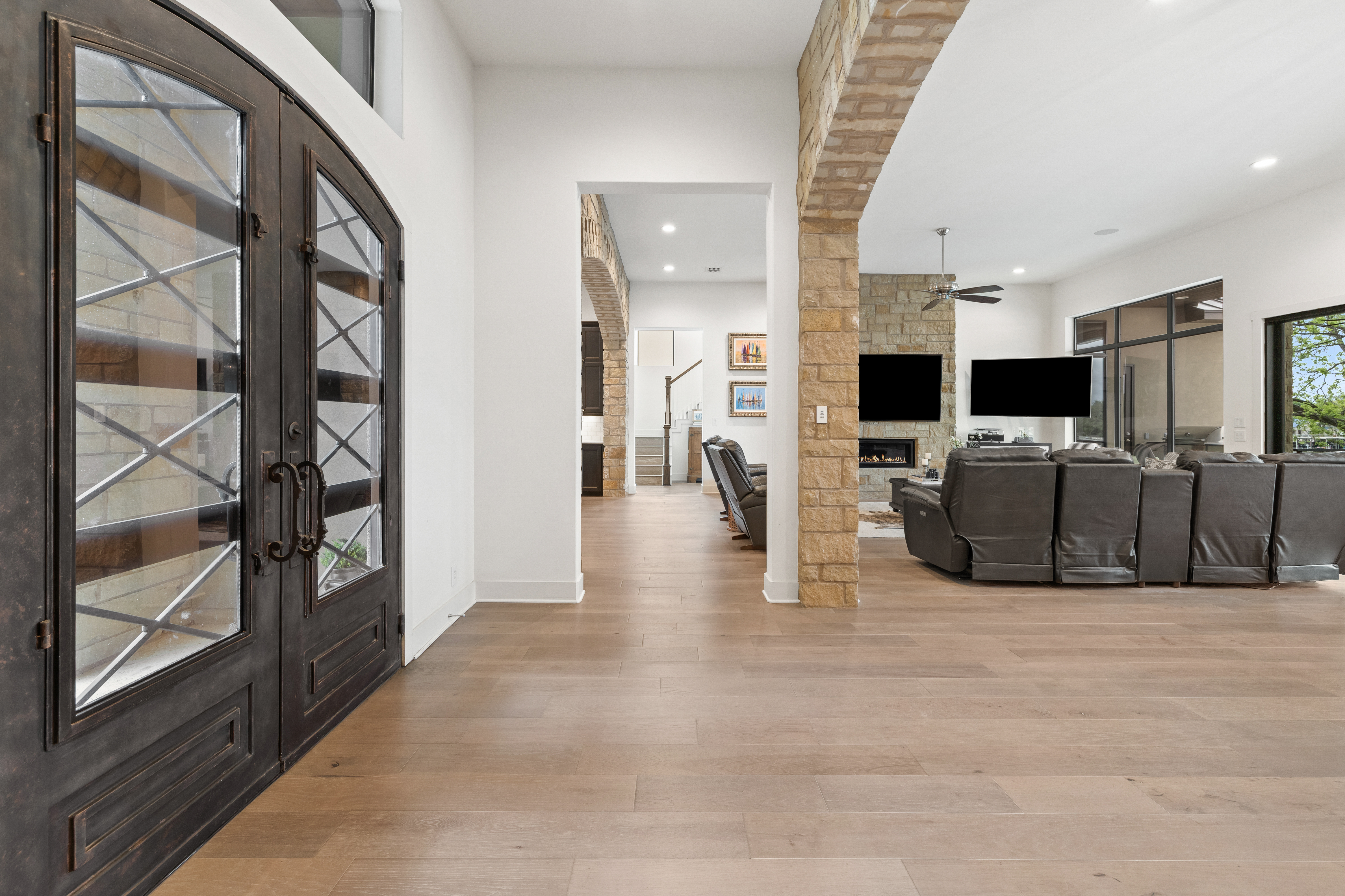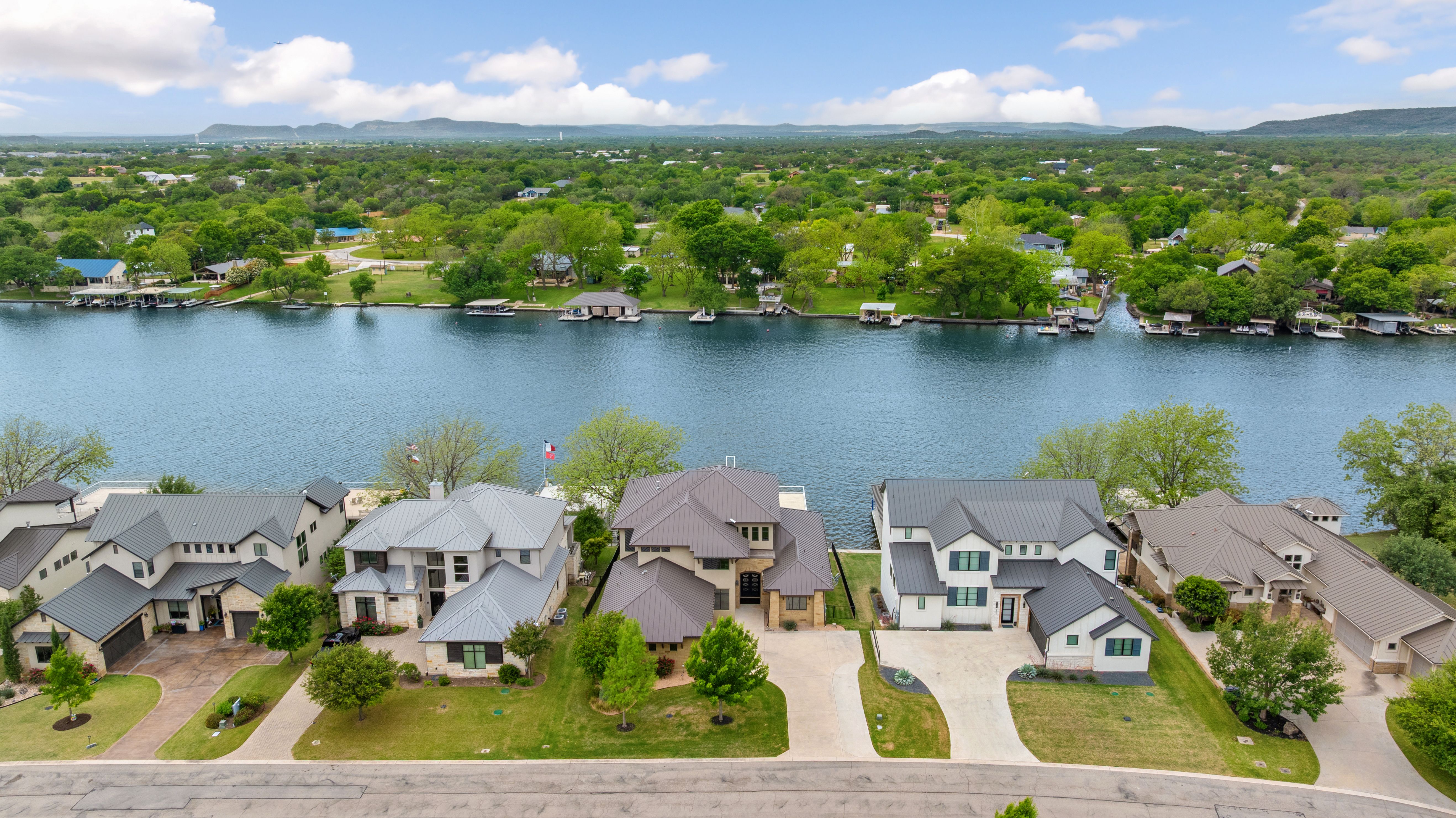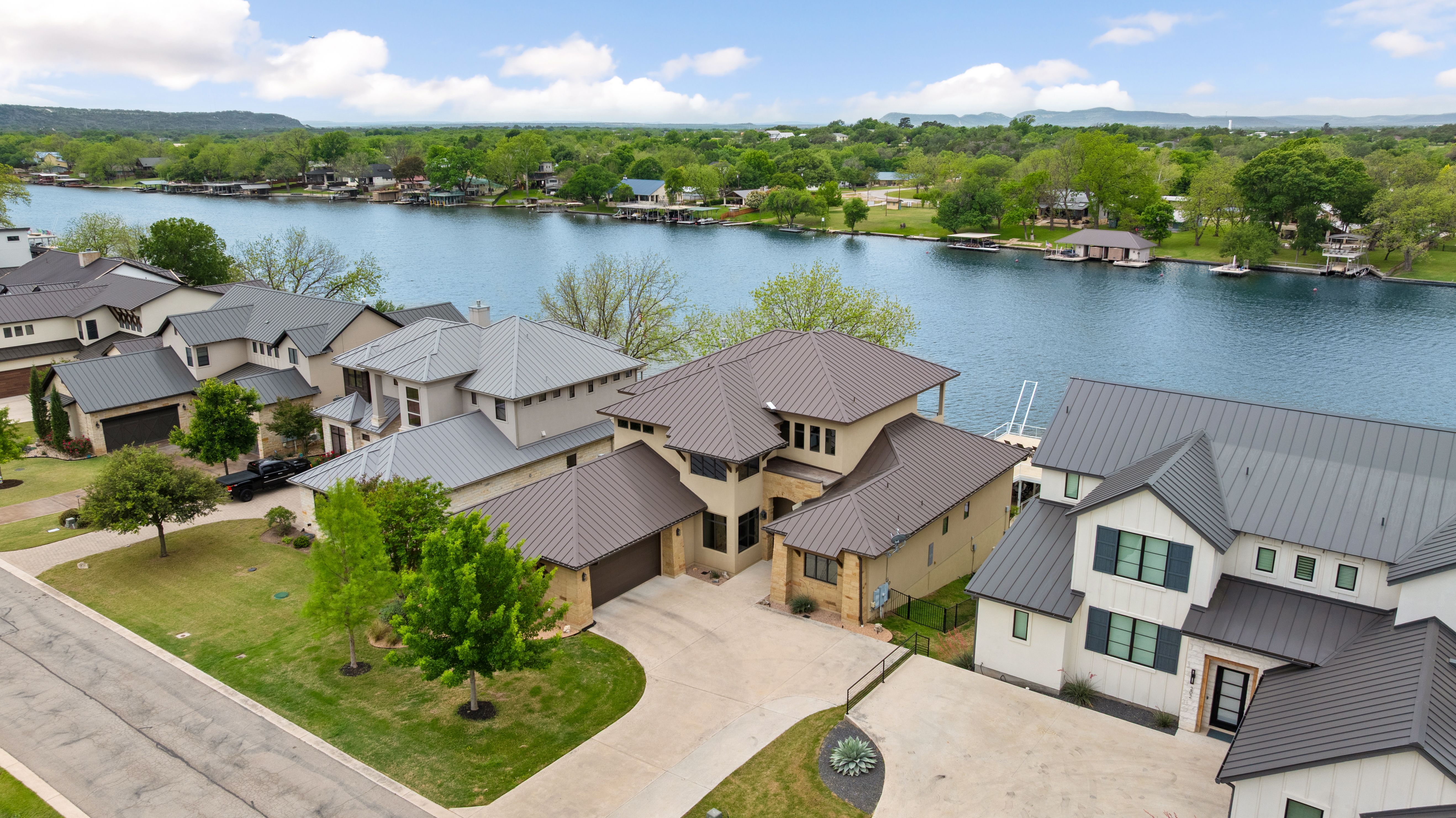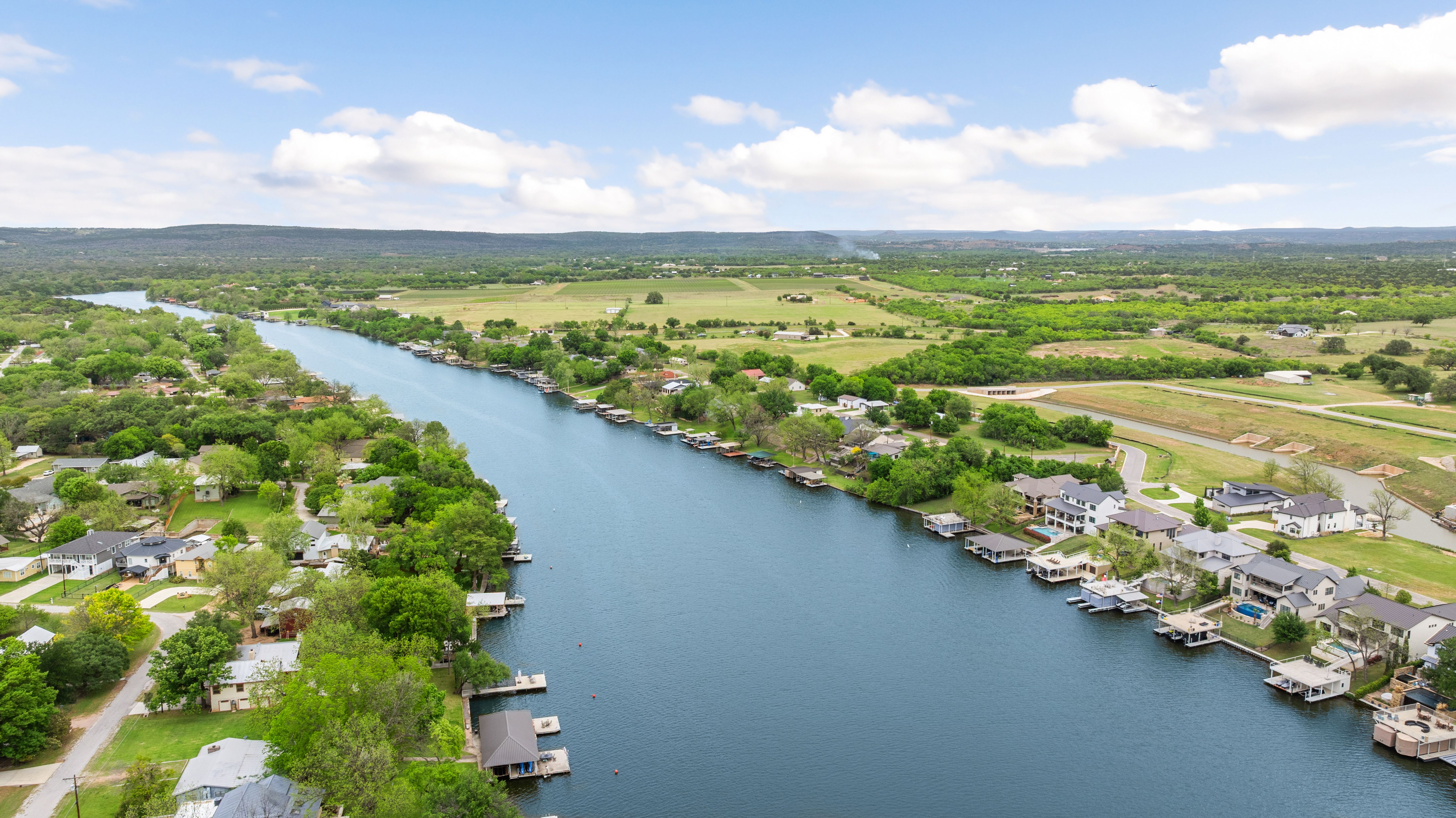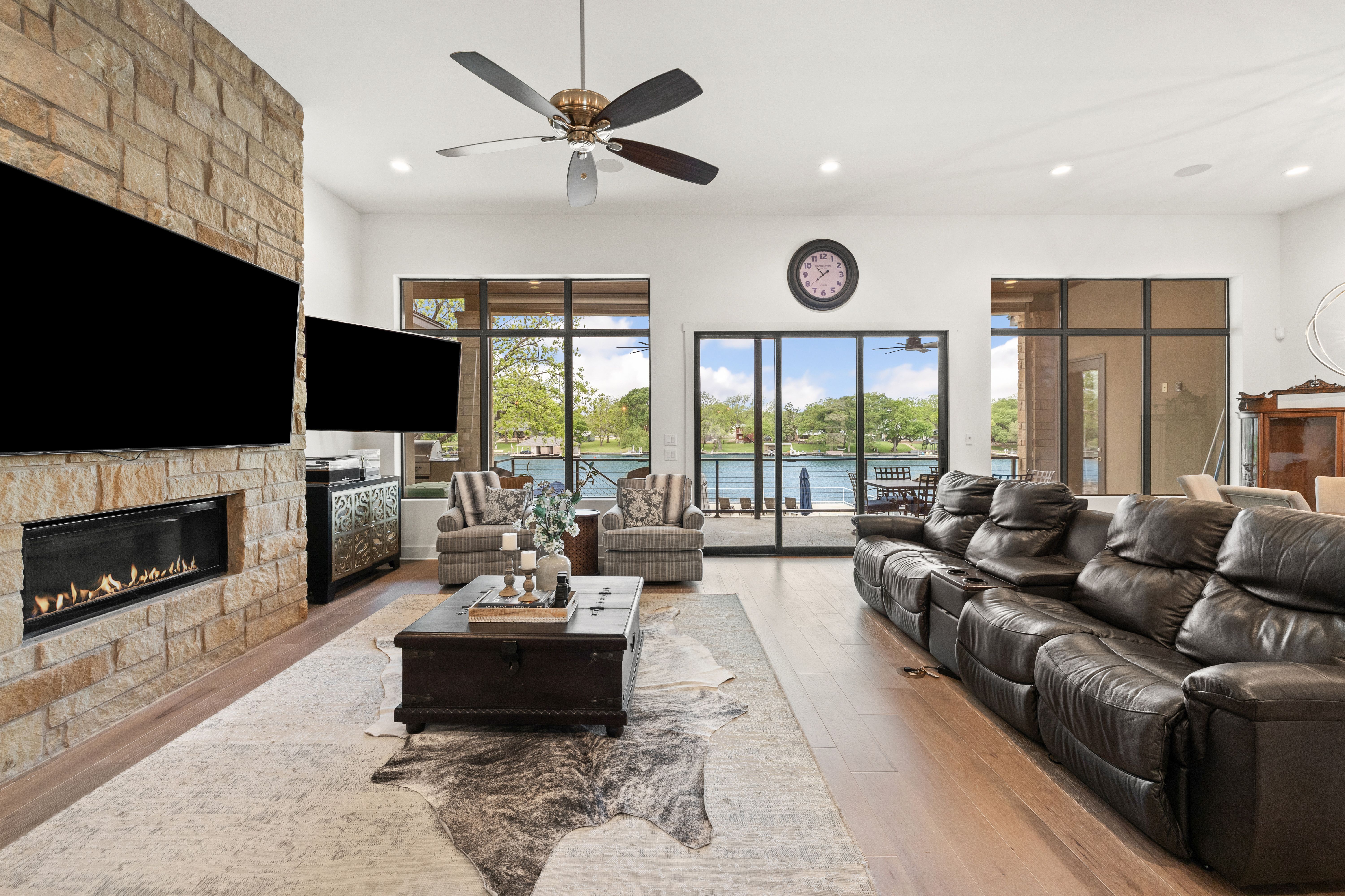 Life is better on Lake LBJ! This stylish custom-built lake house offers quality construction and high-end details, that you would expect in a Keith Wing Custom Built Home. Perfectly designed for large family gatherings or easy everyday living. Enter through a stunning foyer with a wall of windows that frames your first breathtaking view of 80' feet of pristine open waterfront. The expansive open-concept living area flows into a gourmet kitchen, while the main level features a beautiful primary suite with lake views. A second primary suite on main level. Upstairs, a game/media room is surrounded by three additional bedrooms and a bunkroom. Enormous patios on both levels provide exceptional outdoor entertaining space, complete with an outdoor kitchen and a sparkling pool. Down at the water, the boat house offers lakeside fun with a large upper deck, shaded seating below, and two extra-large boat slips ready for even the biggest boats, one is set up for a triton and one slip ready for your personal watercraft. Located in The Ranch on Lake LBJ — a private gated community of high-end waterfront homes buffered by a 250-acre ranch — this property sits in one of the most desirable areas on the lake. Enjoy the deep, cool waters of the Colorado Arm, just minutes from Perissos Winery, Longhorn Caverns, Fleckenstein Castle, and The Legends Golf Course. Horseshoe Bay Resort amenities are right around the corner. Lake LBJ is a favorite Texas destination just 45 minutes northwest of Austin and 90 minutes north of San Antonio.