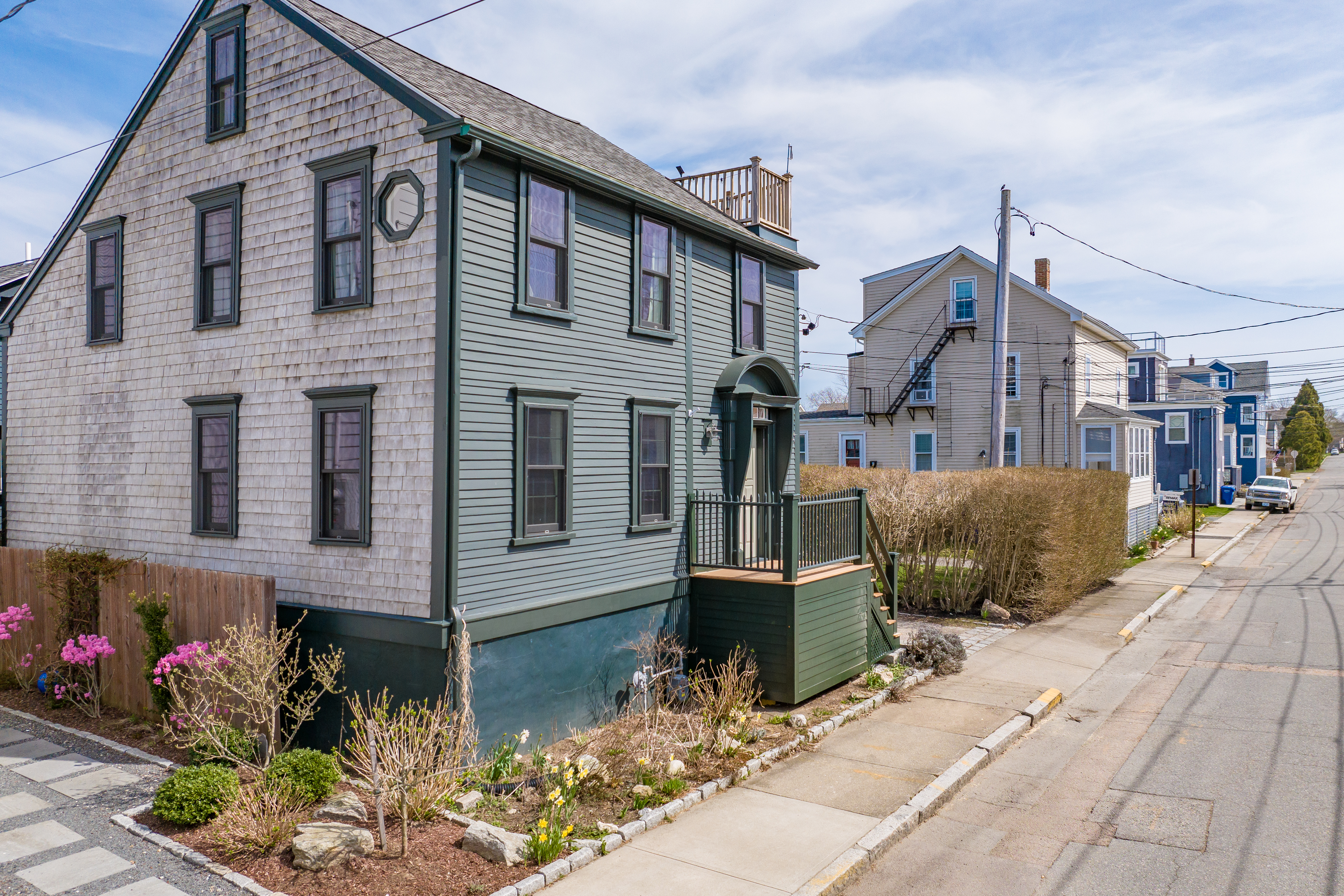 HISTORIC COTTAGE NEAR WATERFRONT KINGS PARK. Available monthly in summer for $20,000/month (and front cottage only available for September to May at $3500/month). A stone's throw from Newport Harbor at King's Park, 24 Houston Avenue has a superb in-town location near Downtown's shops, restaurants and cafes, as well as just moments from the Ocean Drive, New York & Ida Lewis Yacht Clubs, Sail Newport, Newport Country Club and Bailey's Beach. The Colonial House dates from 1750 and has authentic Newport charm and details including exposed wood beams and bracketing with wide plank floors in major rooms. Recently renovated kitchen and bathrooms with Central Air Conditioning and ample closets make this an ideal home. The Guest Cottage, with strong nautical inspiration, has one bedroom plus a sleeping loft/office, and 1.5 baths with high ceilings and its own kitchenette. Outdoors, a lovely lawn, outdoor deck, rooftop perch and 3-car tandem driveway (with EV charger) make this a Newport Oasis! Note furnishing is underway so furnishings may vary from imagery. Some images digitally staged. Utilities included up to a cap. Pets negotiable.