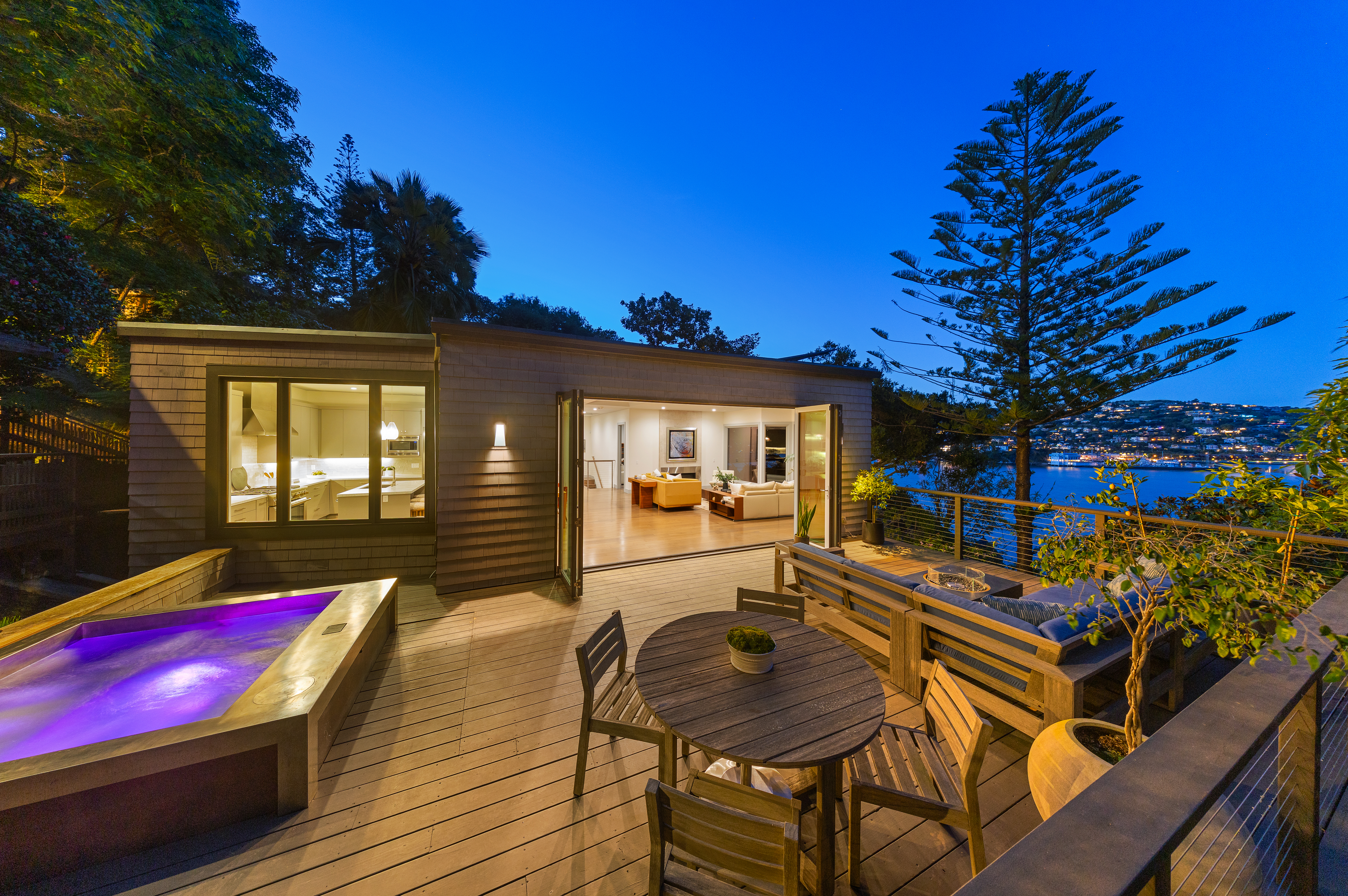 Located on coveted Beach Road—one of the most sought-after locations on Belvedere Island—this exceptional residence offers expansive Bay views, effortless indoor-outdoor living, and a fully renovated, exceptional design just moments from town.Recently reimagined with chic, modern finishes and a major renovation, the home is designed for easy living and elegant entertaining. The light-filled great room, with cozy fireplace and open-concept chef’s kitchen, flows seamlessly to the outdoors. Retracting glass walls open to a newly expanded deck complete with hot tub—perfectly positioned to capture the sweeping water views.With an ideal floor plan, the main level features a relaxing primary suite with panoramic Bay vistas, spa-like bath with soaking tub and walk-in shower, and an additional bedroom or office with its own bath. The first level offers three additional bedrooms—one currently used as a gym—along with a spacious family or media room, providing flexibility for your own lifestyle.A detached guest suite with full bath and wet bar offers ideal accommodations for guests, office, or au pair. An elevator provides an optional stair-free, convenient access to both the guest suite and the spacious two-car garage. Additional highlights include beach access, a newer roof with solar panels, and gorgeous garden areas. Filled with natural light and designed to maximize its spectacular setting, this is a rare opportunity to enjoy turnkey luxury in one of Belvedere’s most cherished locations.