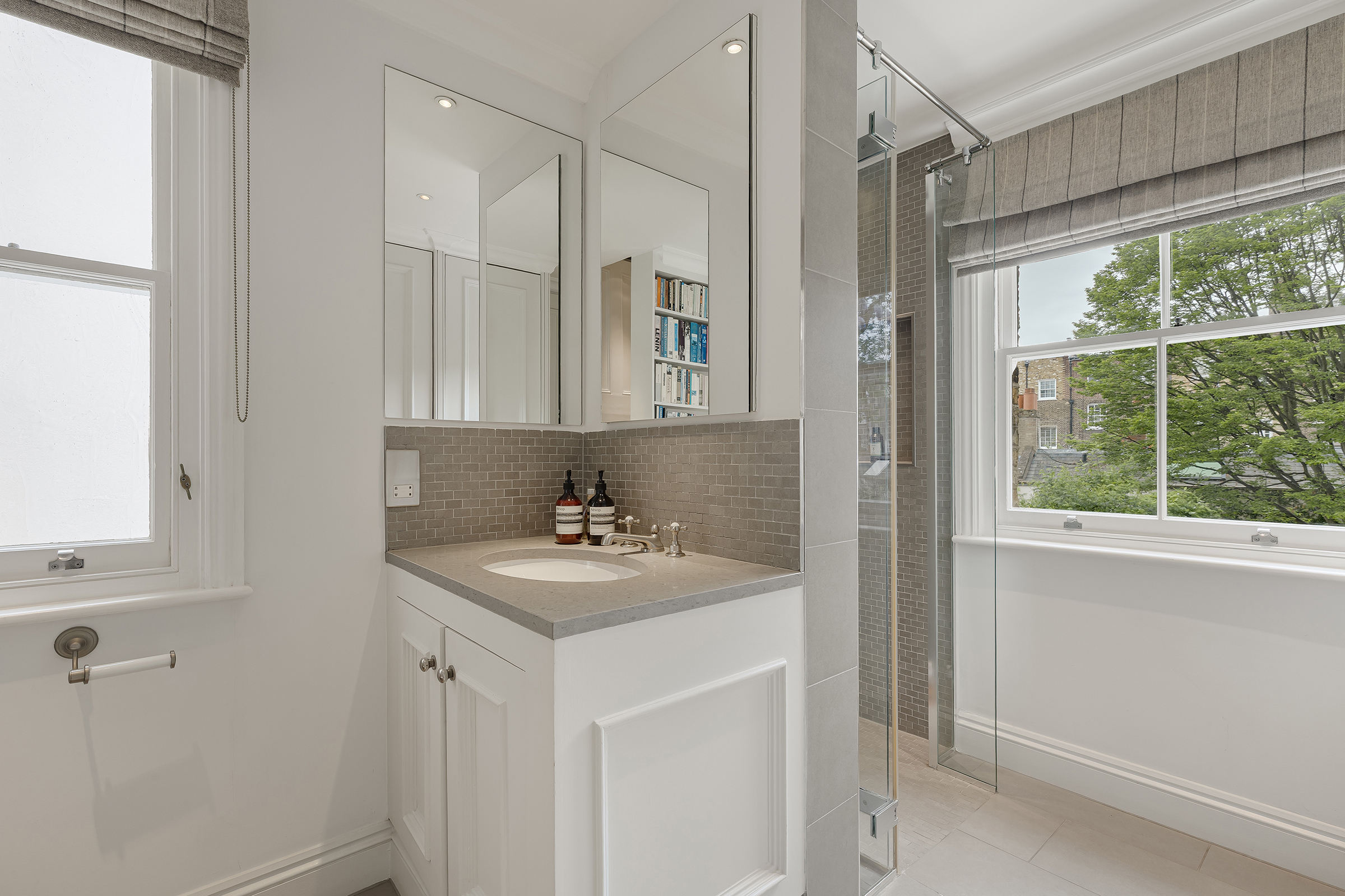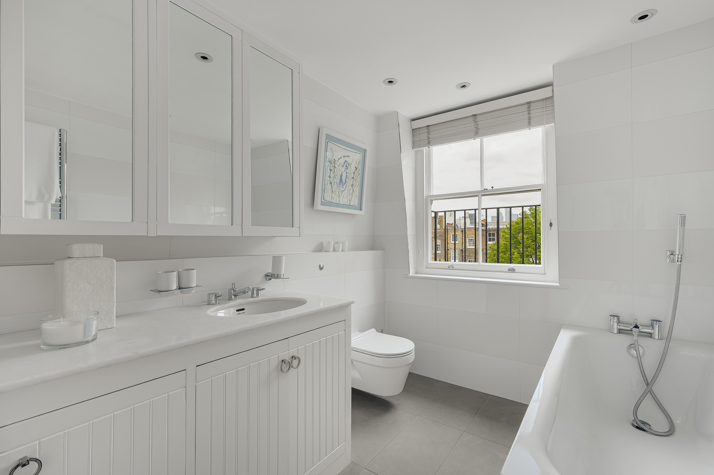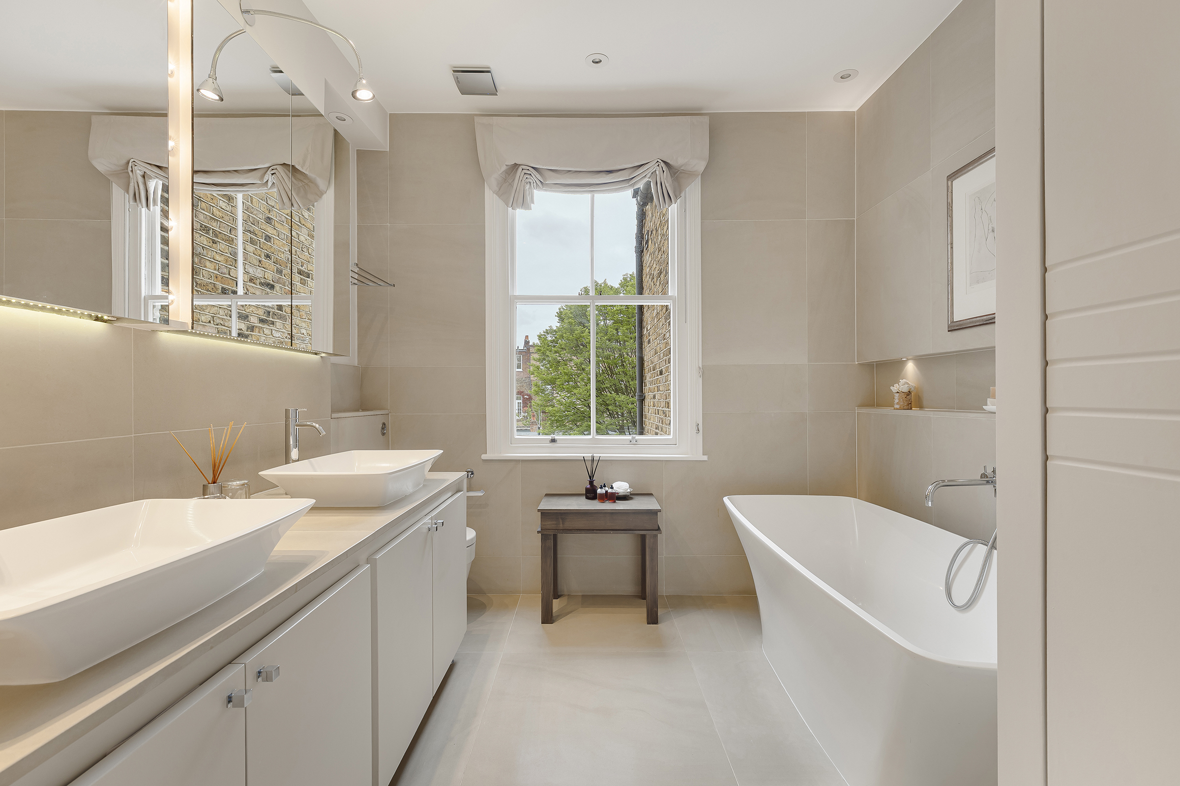 The ground floor is more relaxed. A bespoke kitchen sits alongside a dining room, with an additional sitting area that opens directly onto the private south-facing patio garden. This connection to the outside gives the house a softer edge, particularly in warmer months when the doors are left open and the garden becomes part of the living space.