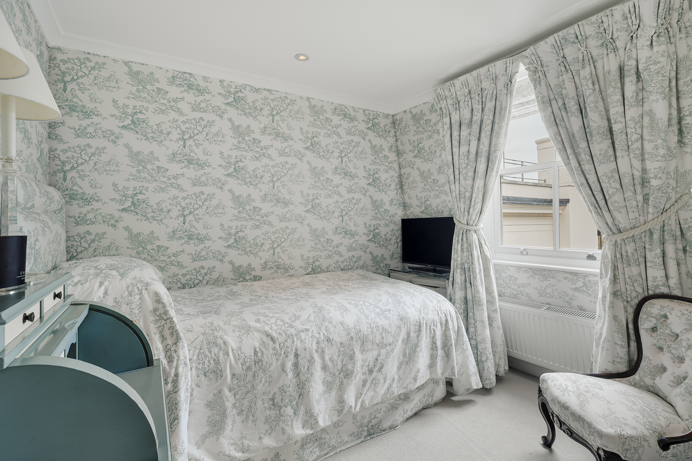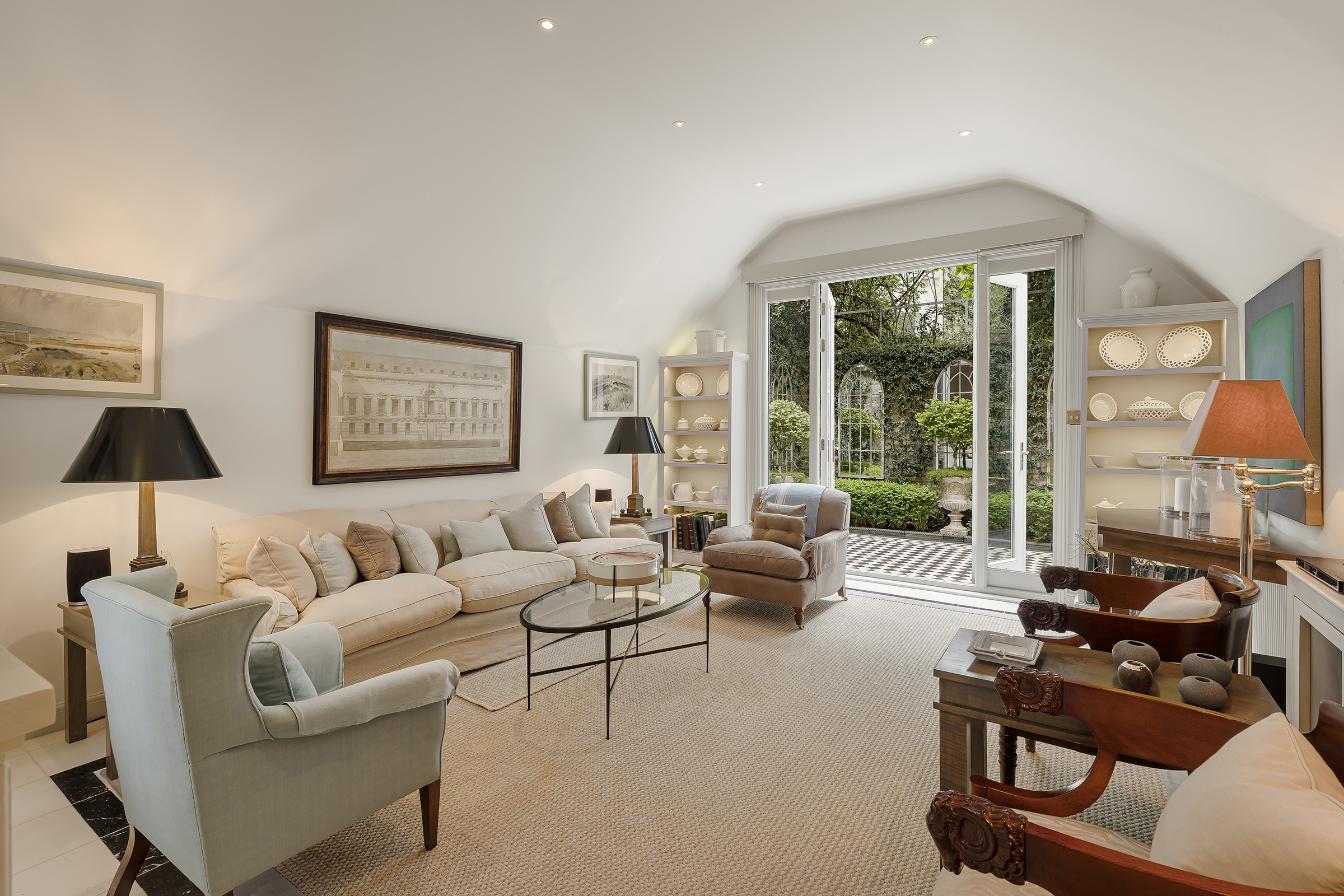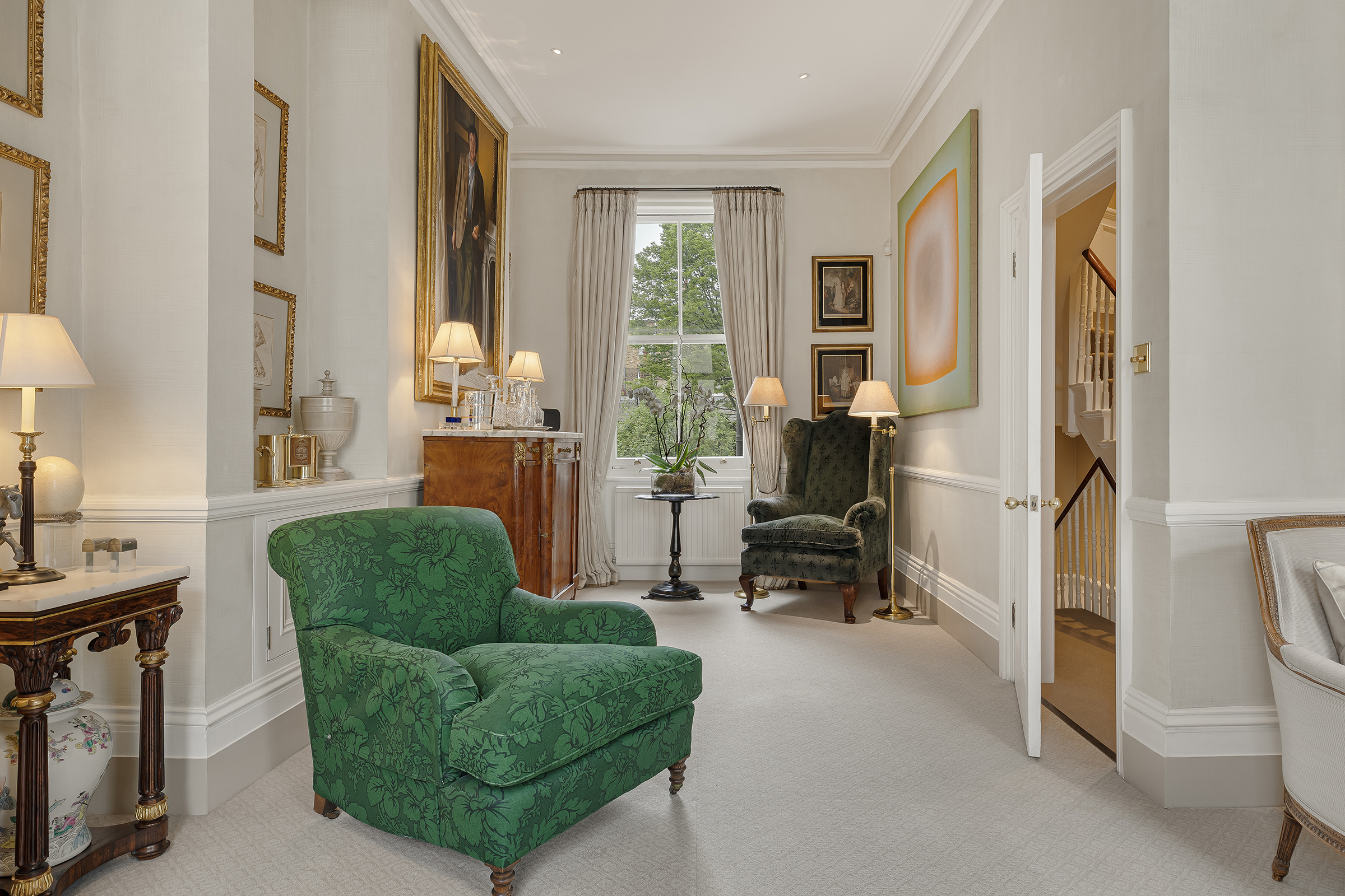 Most of the first floor is given over to an elegant drawing room, a generous and composed space with tall sash windows and refined proportions. It is a room that feels both formal and liveable. Behind lies a quiet study.