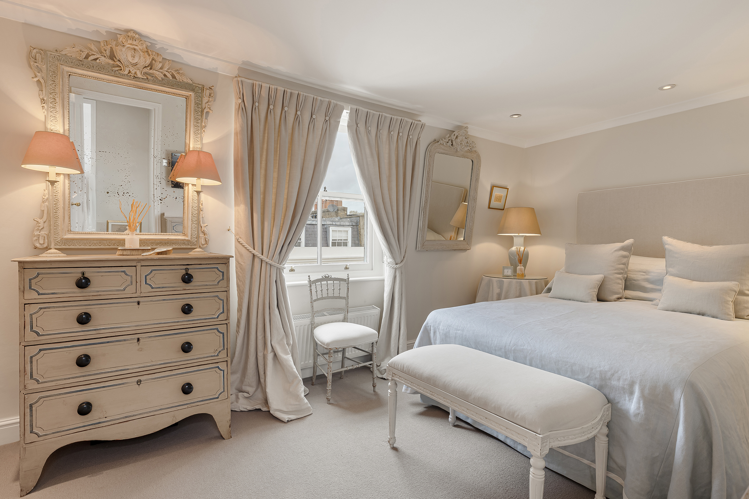 Further bedrooms are distributed across the upper floors, offering flexibility for family life, guests or working from home. A bedroom and an additional reception room on the lower ground floor provide further versatility, whether as a gym, bedroom or staff accommodation.