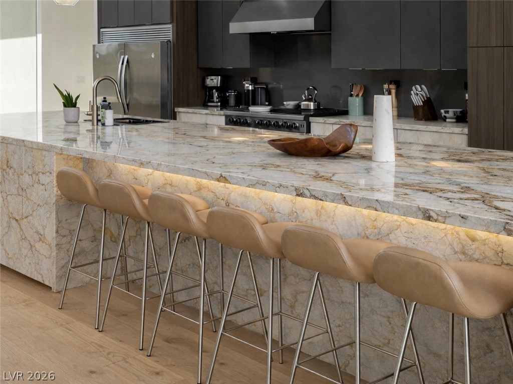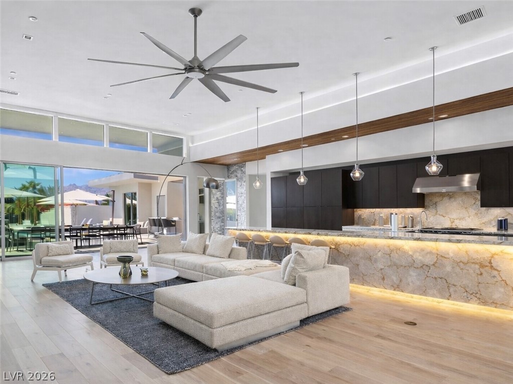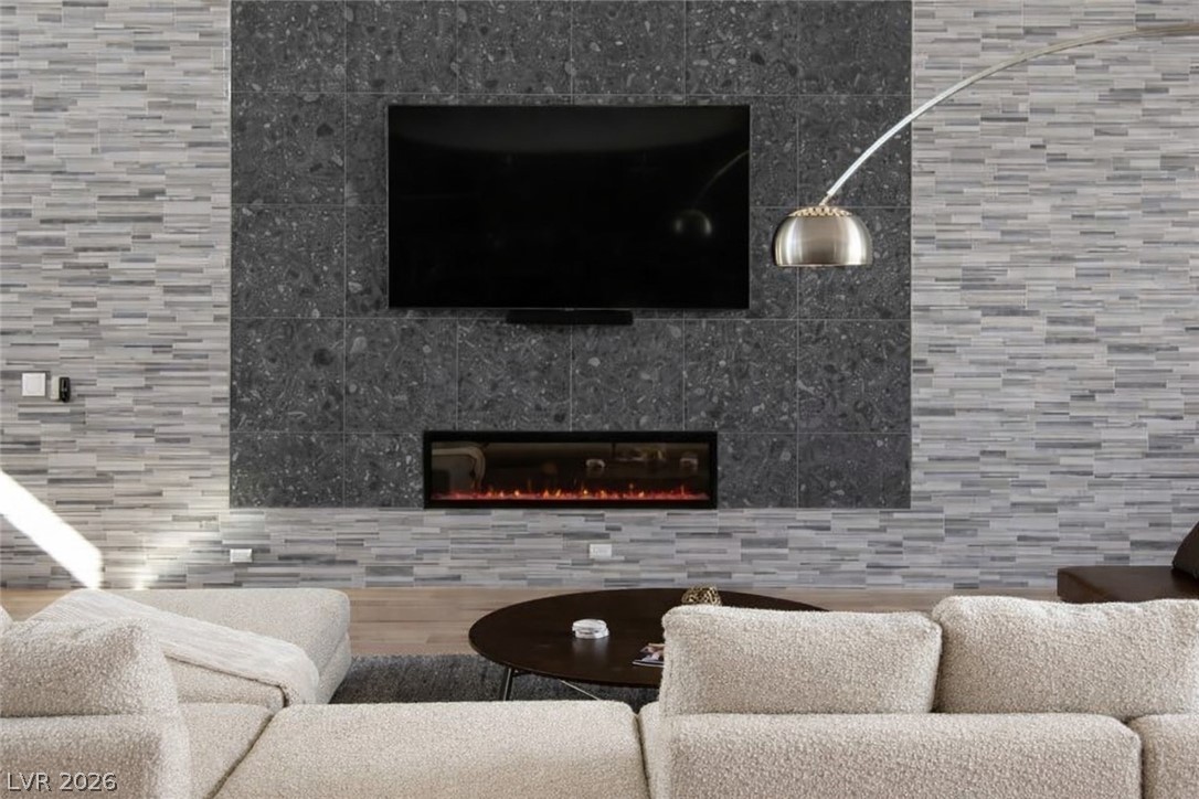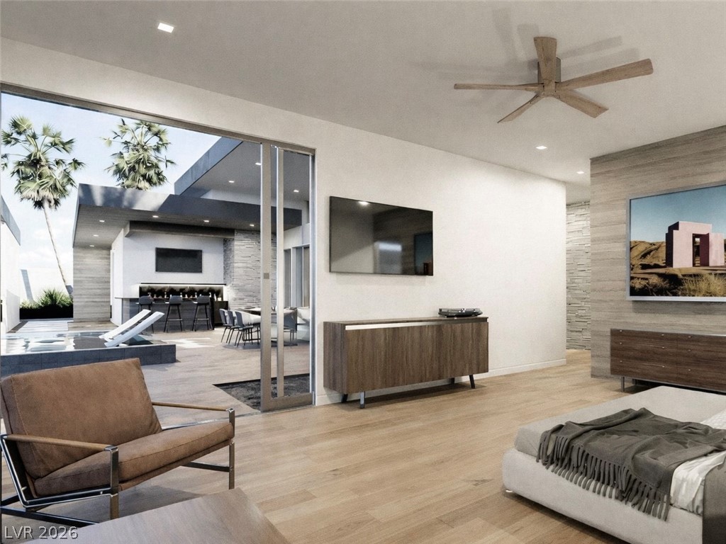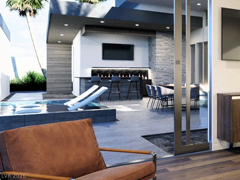 Experience elevated desert living in this stunning modern custom estate set on a 1.35-acre homesite with breathtaking mountain and valley views. Designed and built by Paradise Estates, this single-story residence offers a seamless open-concept layout filled with natural light and clean architectural lines. The chef's kitchen features custom cabinetry, premium quartz countertops, and a dramatic waterfall island, flowing into an expansive great room anchored by a sleek contemporary fireplace. Indoor-outdoor living is effortless with covered patios, a built-in outdoor kitchen, exterior fireplace, and RV hookups for added convenience and flexibility. Every detail reflects quality, space, and modern luxury in a serene setting just outside Las Vegas. To be built. Approximately 3,567 sq ft, 4 bedrooms, 3.5 bathrooms, 3-car garage, energy-efficient construction with fully owned solar included. Optional upgrades may include pool, spa, and RV garage.