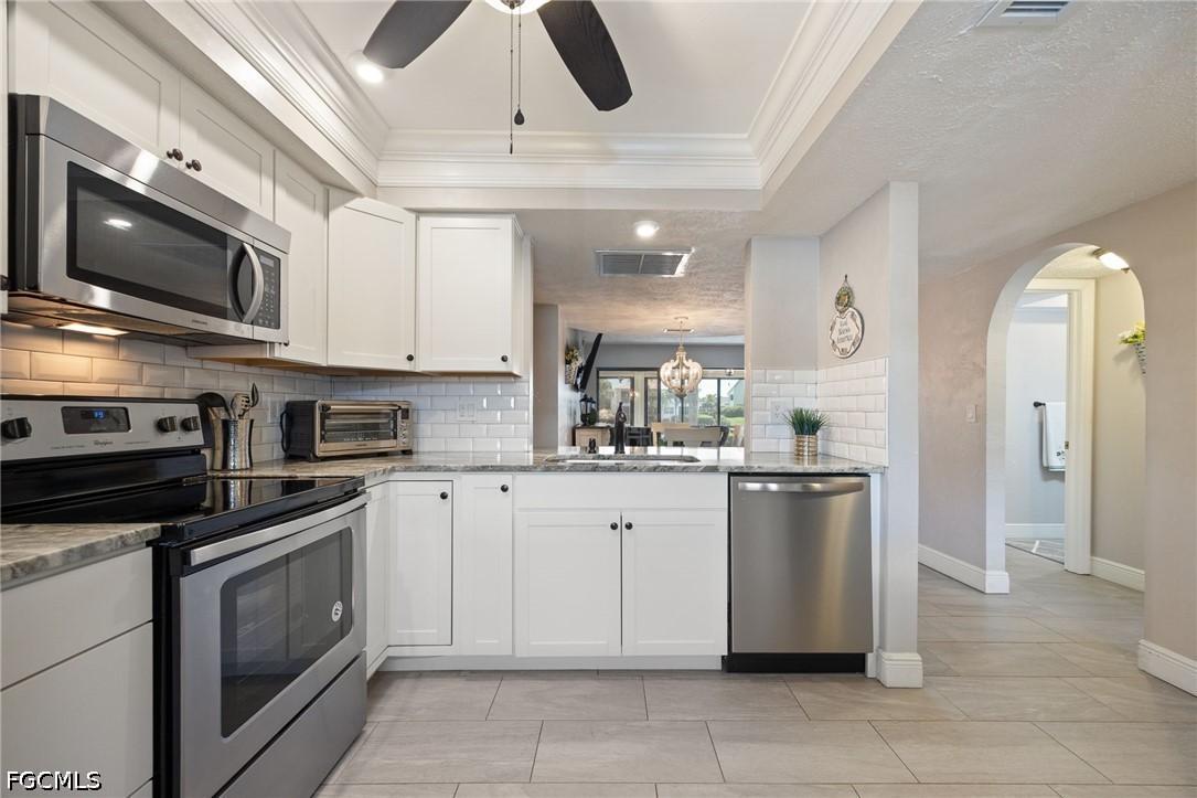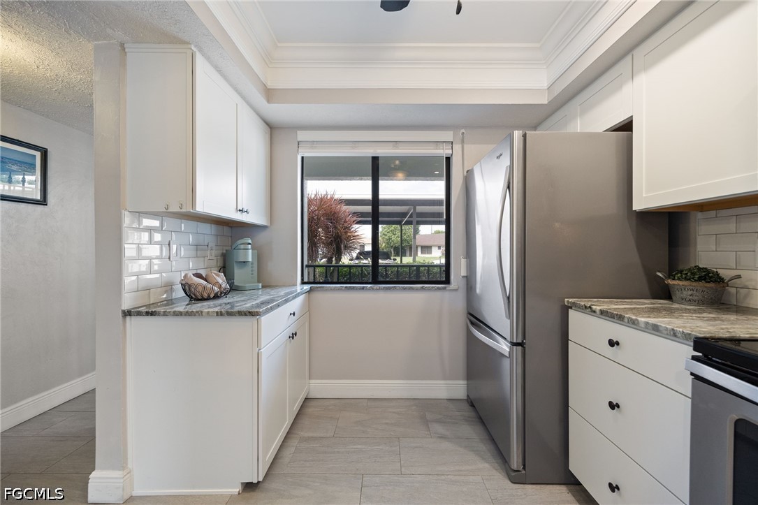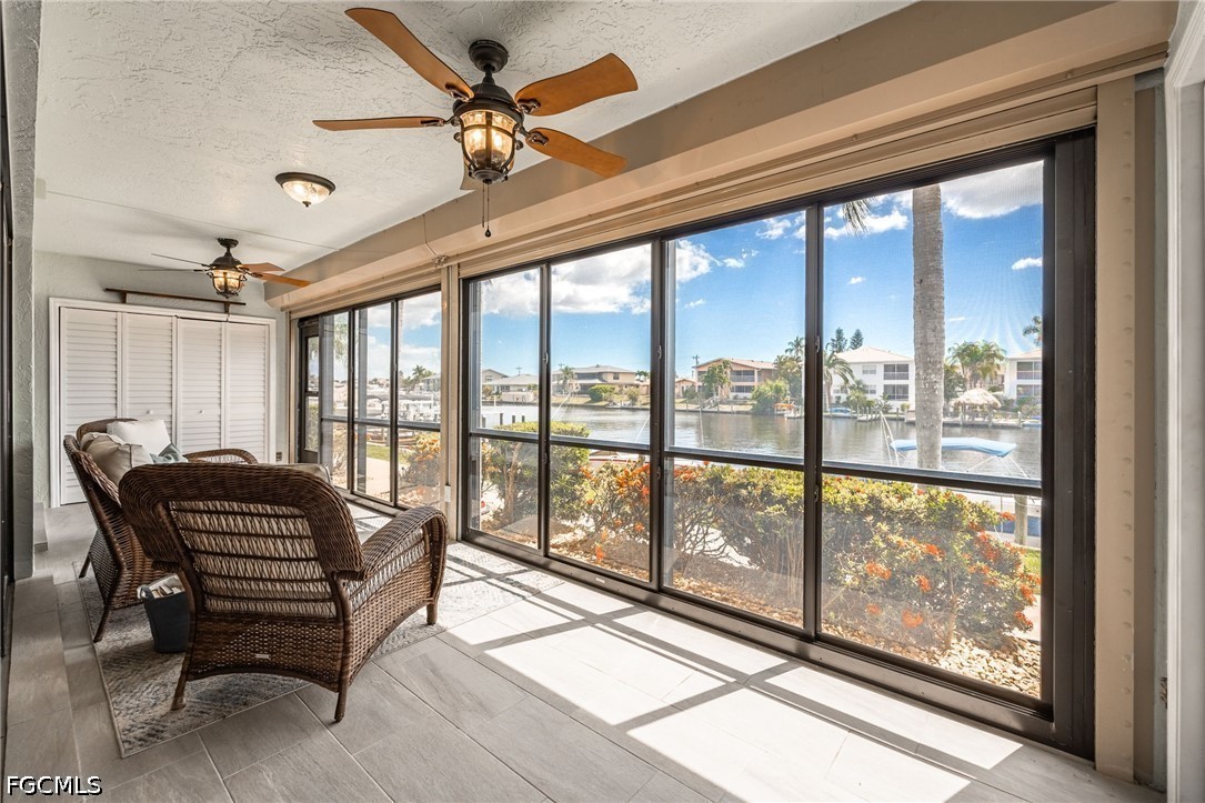 Waterfront sunsets are calling - don't miss this move-in-ready 1st-floor condo on the highly sought-after Rubicon Canal. This beautifully updated 2-bedroom, 2-bath residence offers a completely renovated kitchen with white Craftsman-style cabinetry, granite countertops, and oversized natural tile flooring throughout, creating a bright, clean, and modern coastal feel. The spacious living room opens with quad sliders to an expansive lanai measuring over 25 feet across - seamlessly blending indoor and outdoor living and drawing your eye straight to the water. This is where you'll start and end your day, taking in wide canal views and stunning southwest Florida sunsets. A dedicated dining area adds flexibility for everyday living or entertaining. The primary suite features sliding glass doors to the lanai, enhancing that easy indoor-outdoor flow, while both bathrooms have been fully remodeled and offer walk-in showers for added comfort and convenience. The oversized lanai is designed for true year-round enjoyment with electric hurricane shutters and clear vinyl enclosures, allowing you to relax in comfort while enjoying the view in every season. Located in Rubicon Vista, a highly desirable 55+ waterfront community, residents enjoy a heated pool, canal-front boat docks, and convenient storage for all your beach and boating essentials. No pets allowed. Additional features include a washer and dryer setup, assigned carport parking, and easy access to waterfront living with only one bridge away to the Caloosahatchee. Move right in and start enjoying the Florida lifestyle! Tucked into a quiet residential neighborhood, this location offers the ideal blend of privacy and accessibility. Offered furnished/turnkey if desired, making this an easy move-in or seasonal retreat. Opportunities like this on the Rubicon Canal don't last - schedule your showing and bring your offer.