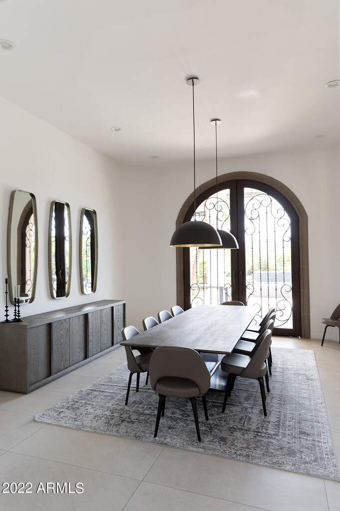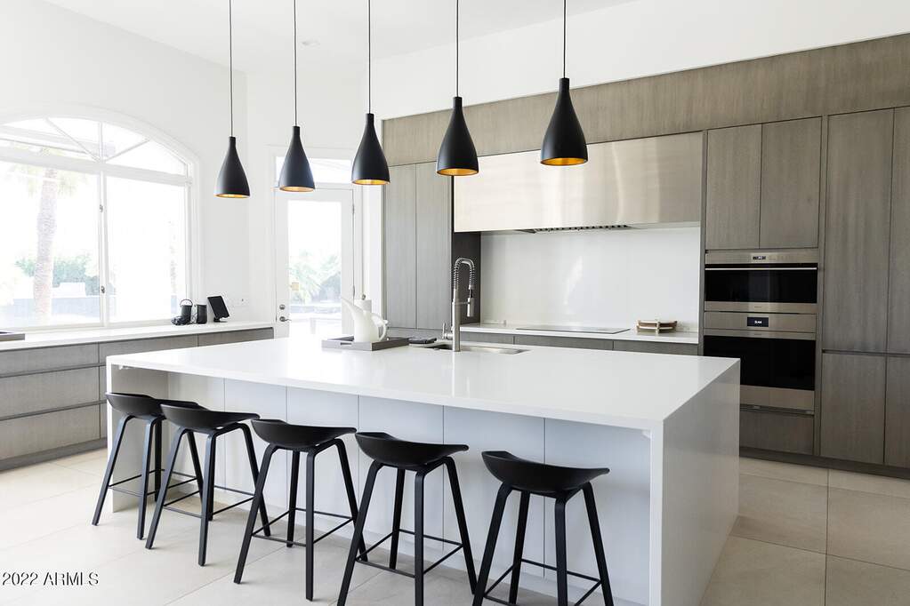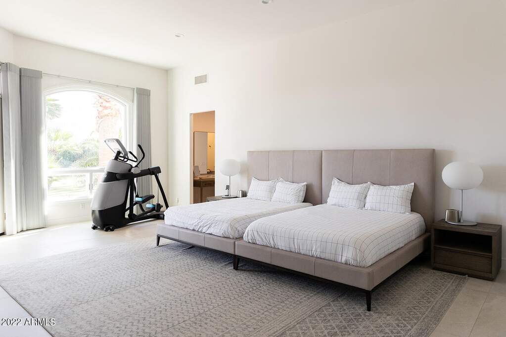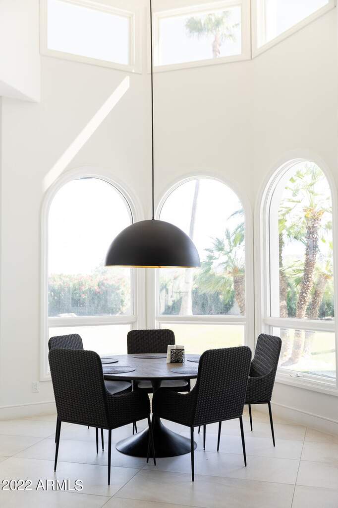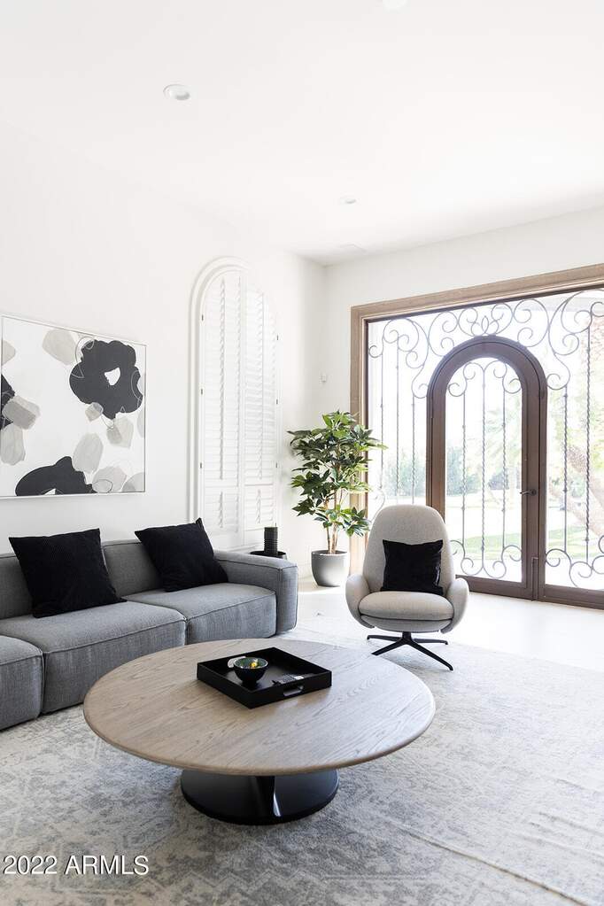 Fully furnished golf course modern with soaring ceilings and Mummy Mountain views! Newly remodeled kitchen, flooring, bedrooms, and bathrooms. Entertainers dream with new heated pool/spa and outdoor BBQ area. Located on Camelback Country Clubs Ambiante Golf course, beautiful flowers surround sidewalks and jogging/ biking paths. In the A+ rated CCC school district and moments from central Scottsdale's shops, restaurants and grocery stores. Split floorplan of primary suite with his and hers bathrooms and closets and generous bedroom on one side, office/den and two additional ensuites on the other. Large formal living and second entertaining space off of the kitchen. No interior steps and immaculacy furnished in Restoration Hardware.