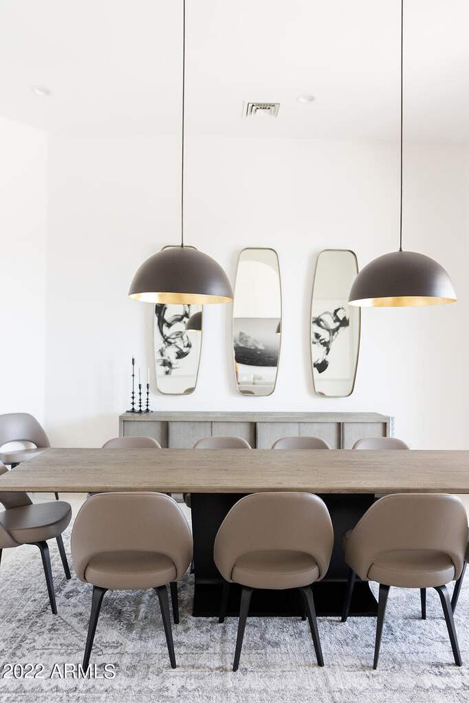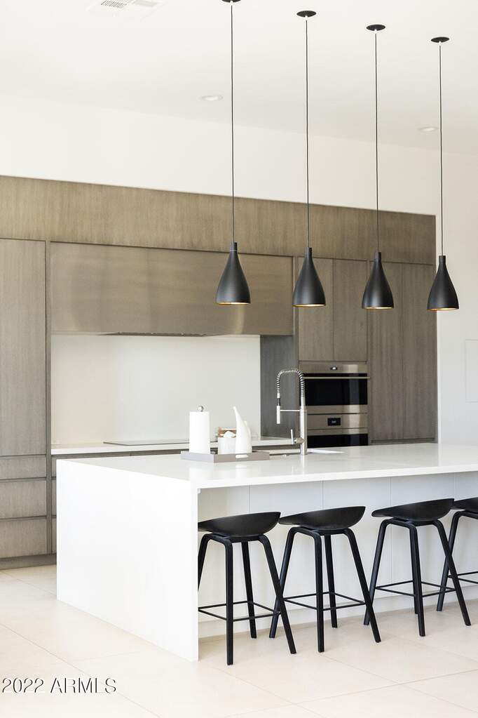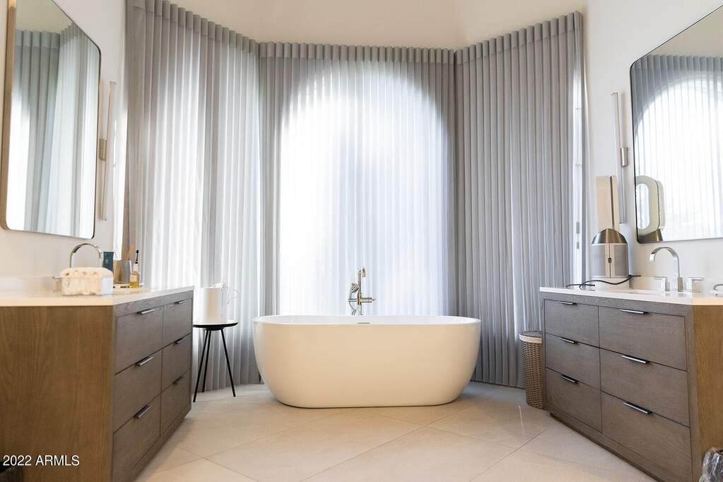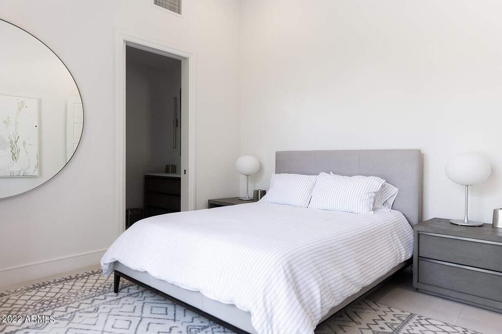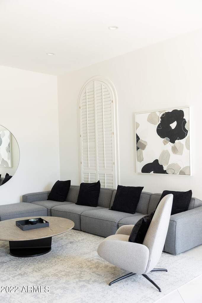 Fully furnished golf course modern with soaring ceilings and Mummy Mountain views! Newly remodeled kitchen, flooring, bedrooms, and bathrooms. Entertainers dream with new heated pool/spa and outdoor BBQ area. Located on Camelback Country Clubs Ambiante Golf course, beautiful flowers surround sidewalks and jogging/ biking paths. In the A+ rated CCC school district and moments from central Scottsdale's shops, restaurants and grocery stores. Split floorplan of primary suite with his and hers bathrooms and closets and generous bedroom on one side, office/den and two additional ensuites on the other. Large formal living and second entertaining space off of the kitchen. No interior steps and immaculacy furnished in Restoration Hardware.