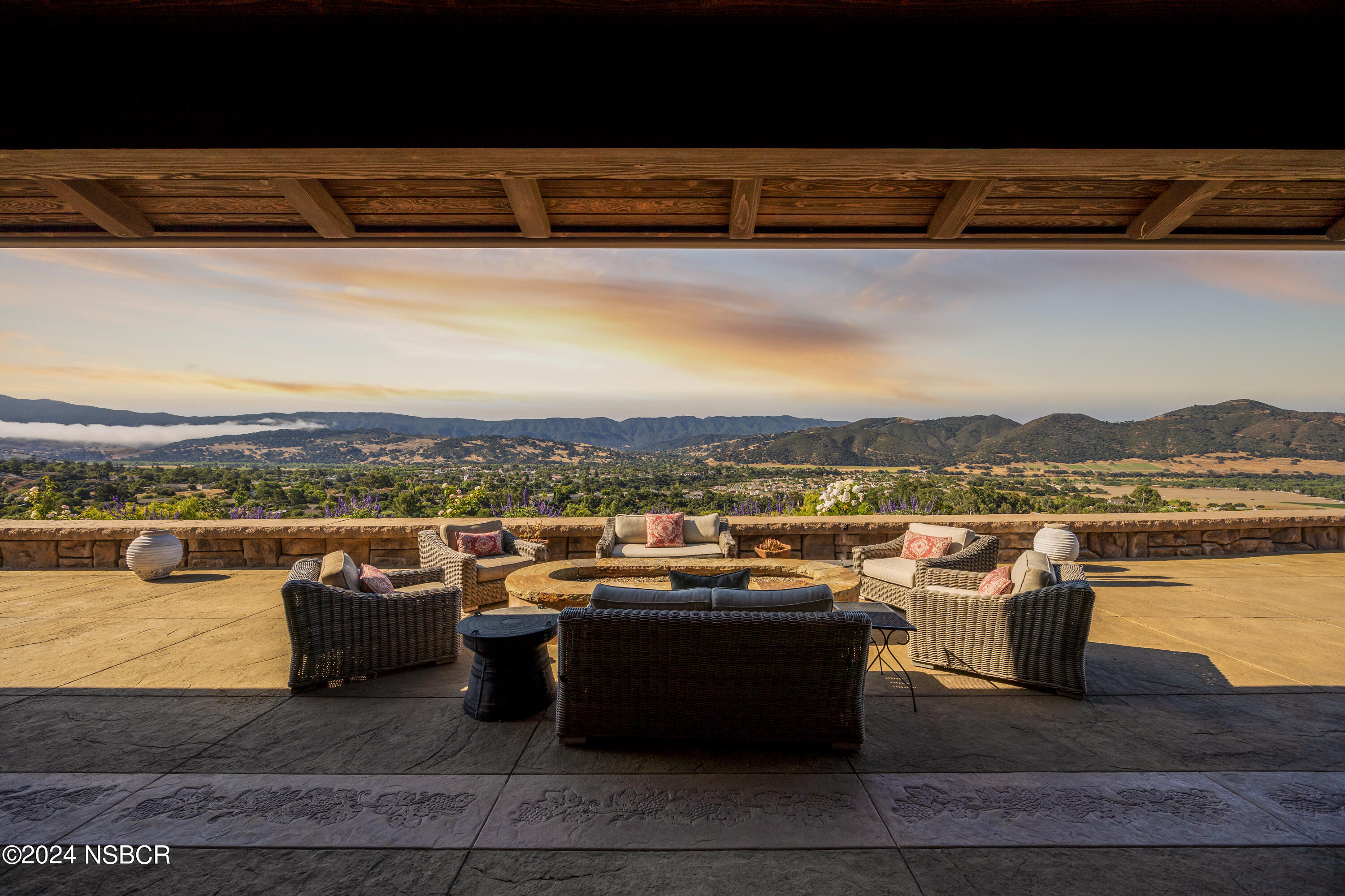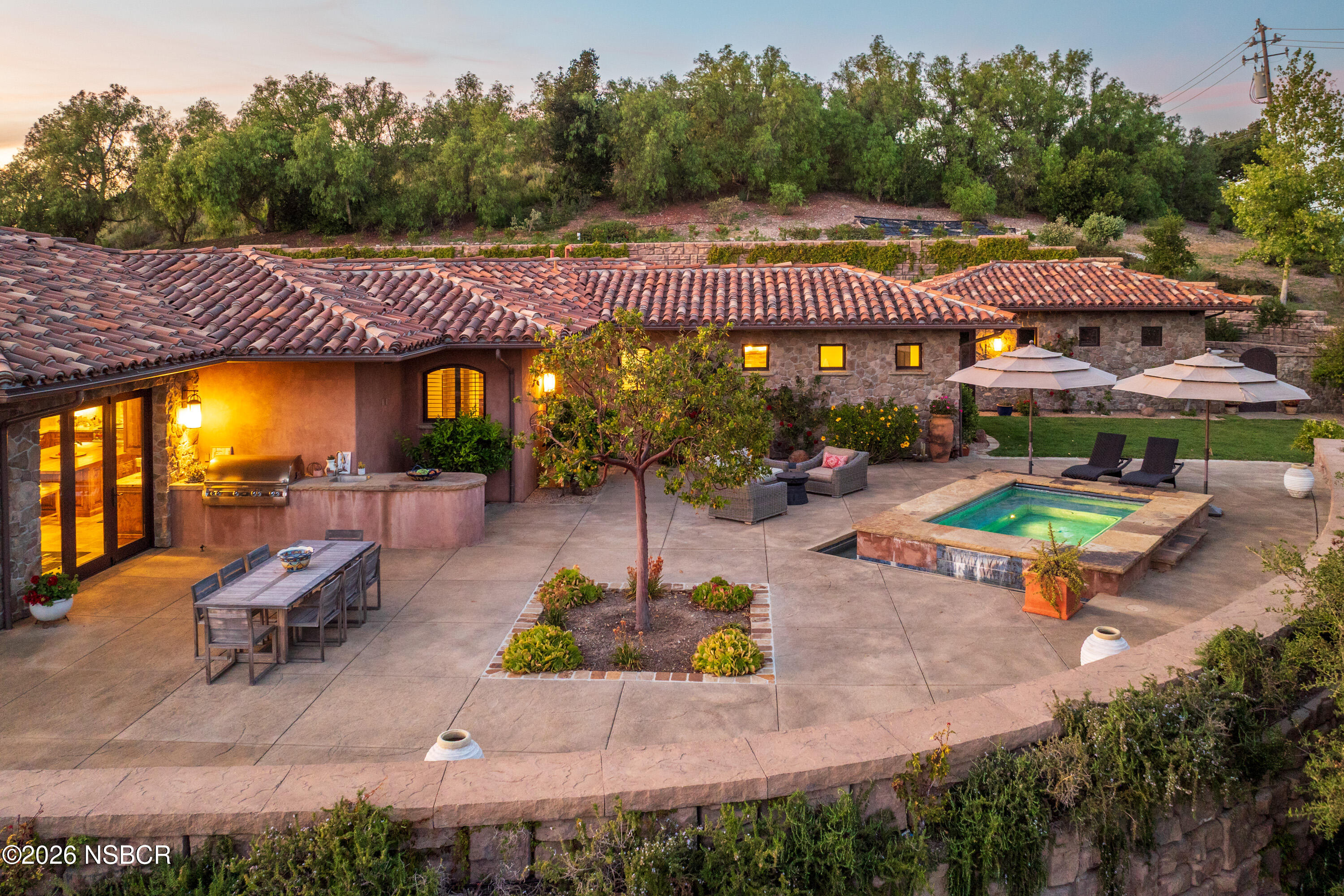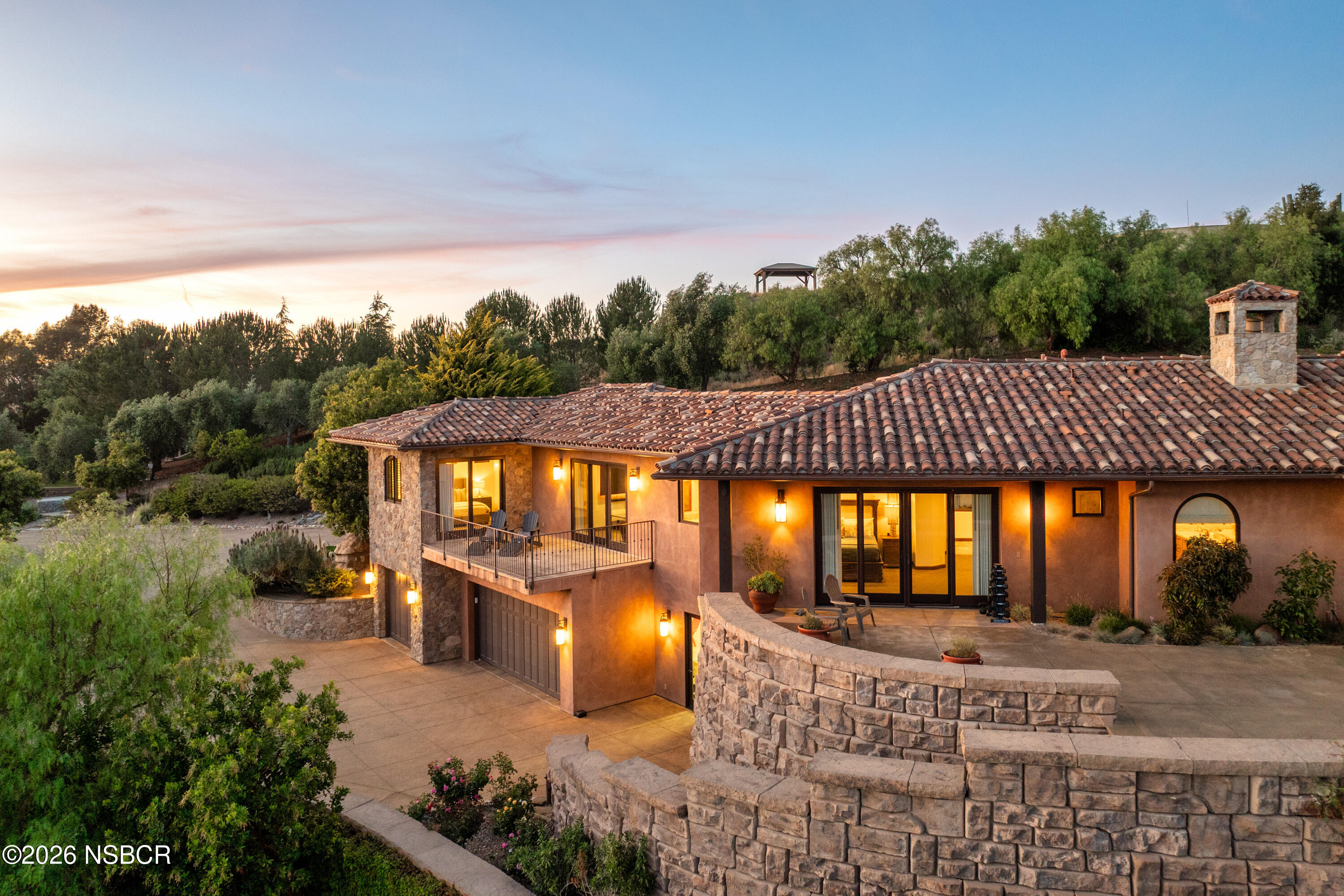 Be the first to watch as the fog slowly rolls in and cradles the Valley. Welcome to ''First Fog Ranch'', with breathtaking views and incredible sunsets! Relaxed country elegance, a stunning estate of the highest quality constructions and craftsmanship, with high end finishes that perfectly blend elegance with serene ranch living. 6.27 acres, offering both privacy and versatility, boutique Syrah vineyard, 5,456 sq. ft. of refined living space, featuring 4 spacious bedrooms and 4.5 luxurious bathrooms. The heart of the home is the impressive living room with grand stone fireplace and a wall of folding glass bi-fold doors that open entirely to the outdoor patios with umbrellas, a cozy fire pit and a splash pool. The gourmet kitchen is a chef's dream, equipped with an expansive island, breakfast bar, walk-in pantry, wine refrigerator, and a high-end Wolf range. For wine enthusiasts, the temperature-controlled wine cellar provides ample space for your collection, accommodating up to 780 bottles. Wander the many pathways that lead to magical landscaped destinations, to the charming art studio with half bath, and to the entertainment/media studio with covered porch, lawns and beautiful views. Additional amenities include an attached 3-car garage and a detached 1-car garage. Designed and originally built for a celebrity artist, come and experience the epitome of luxury and tranquility at First Fog Ranch, where every detail has been thoughtfully designed to create an unparalleled living experience.