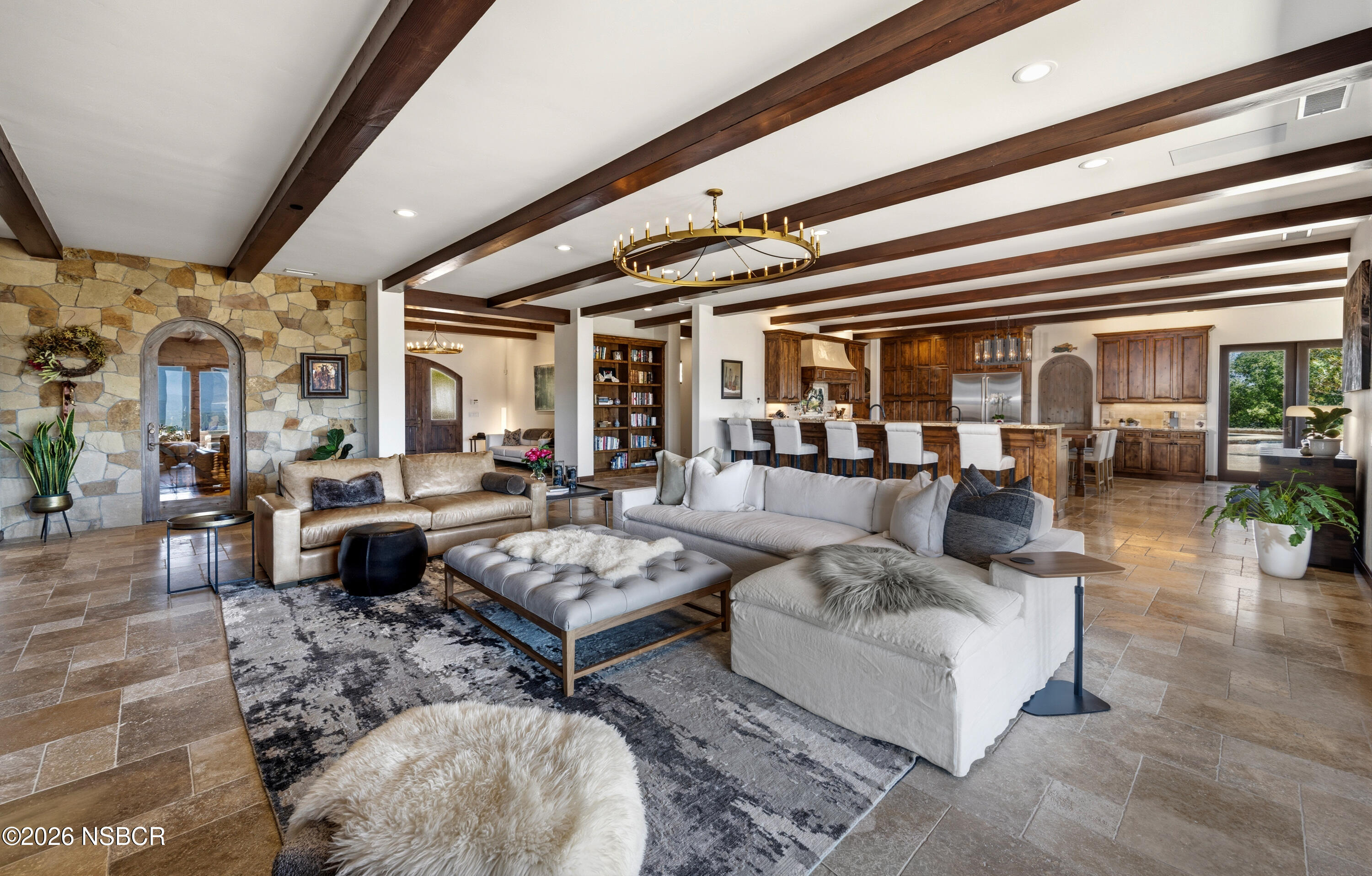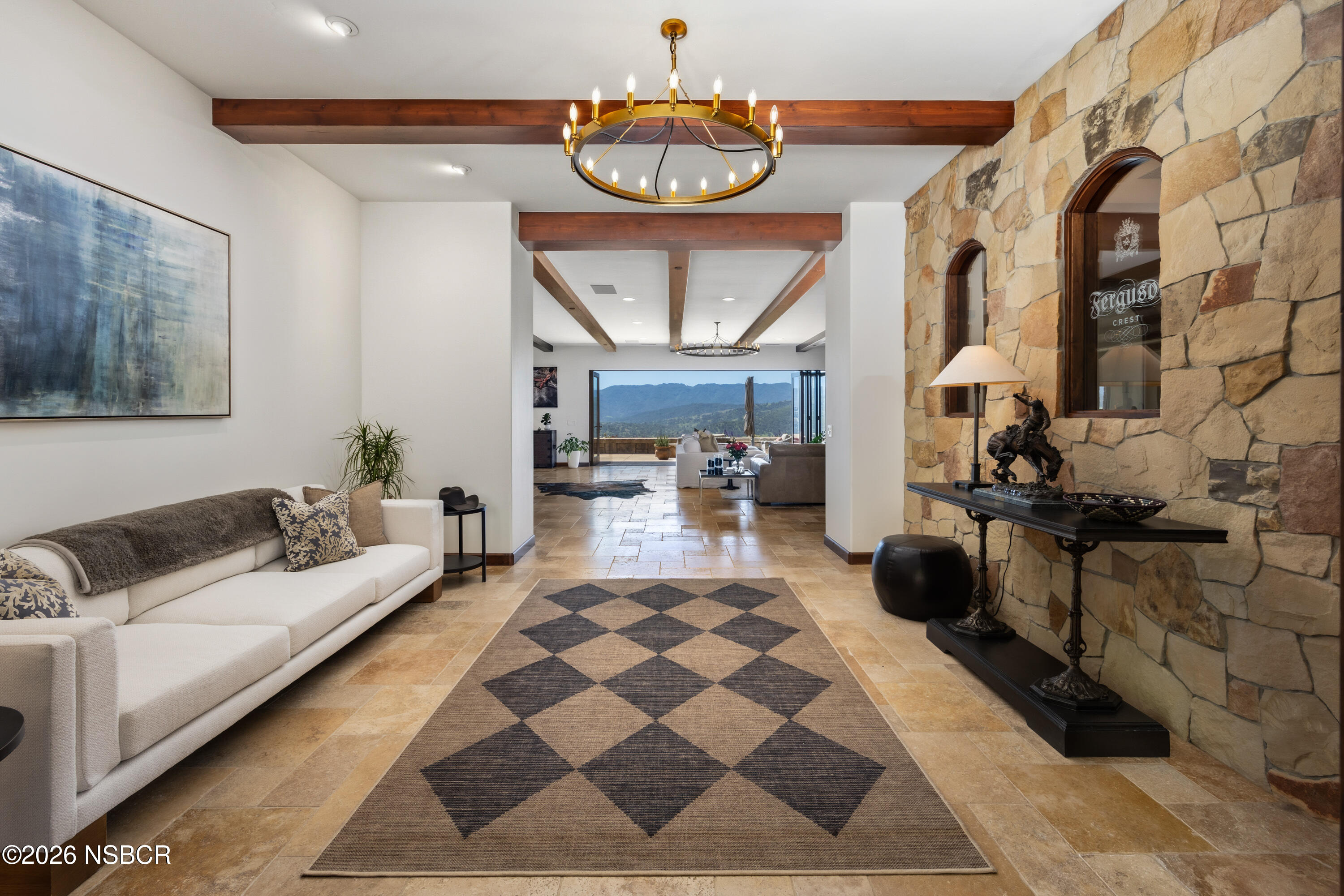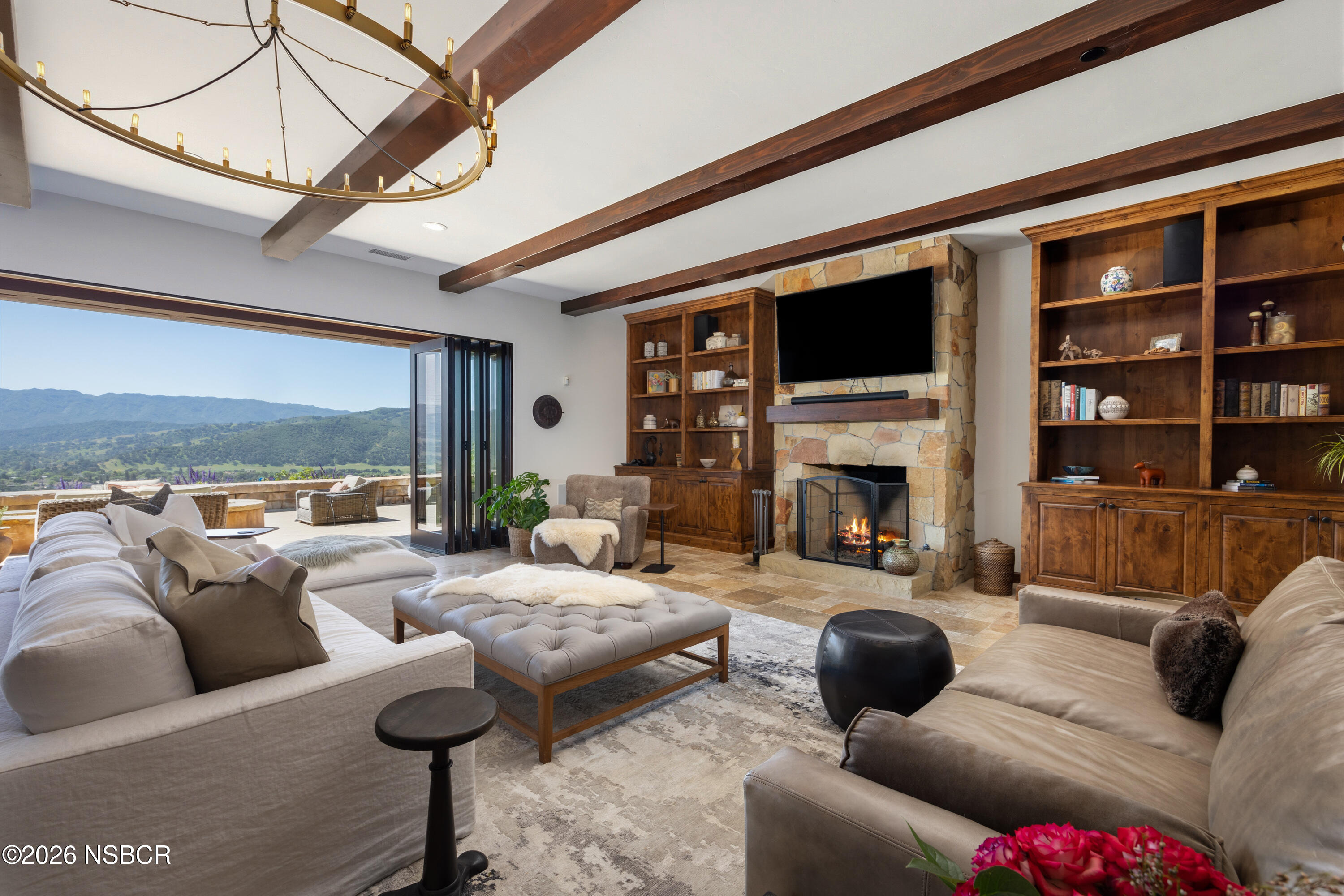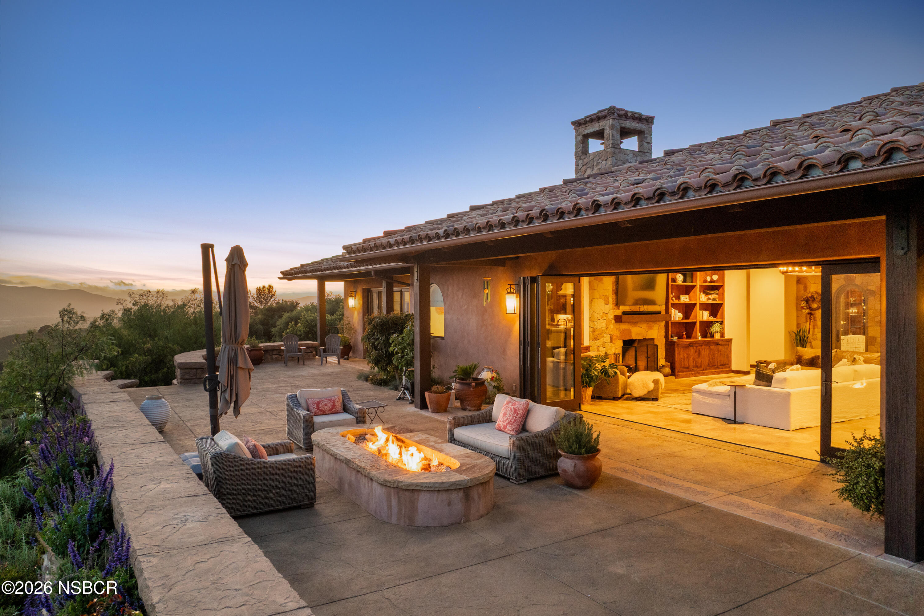 Be the first to watch as the fog slowly rolls in and cradles the Valley. Welcome to ''First Fog Ranch'', with breathtaking views and incredible sunsets! Relaxed country elegance, a stunning estate of the highest quality constructions and craftsmanship, with high end finishes that perfectly blend elegance with serene ranch living. 6.27 acres, offering both privacy and versatility, boutique Syrah vineyard, 5,456 sq. ft. of refined living space, featuring 4 spacious bedrooms and 4.5 luxurious bathrooms. The heart of the home is the impressive living room with grand stone fireplace and a wall of folding glass bi-fold doors that open entirely to the outdoor patios with umbrellas, a cozy fire pit and a splash pool. The gourmet kitchen is a chef's dream, equipped with an expansive island, breakfast bar, walk-in pantry, wine refrigerator, and a high-end Wolf range. For wine enthusiasts, the temperature-controlled wine cellar provides ample space for your collection, accommodating up to 780 bottles. Wander the many pathways that lead to magical landscaped destinations, to the charming art studio with half bath, and to the entertainment/media studio with covered porch, lawns and beautiful views. Additional amenities include an attached 3-car garage and a detached 1-car garage. Designed and originally built for a celebrity artist, come and experience the epitome of luxury and tranquility at First Fog Ranch, where every detail has been thoughtfully designed to create an unparalleled living experience.