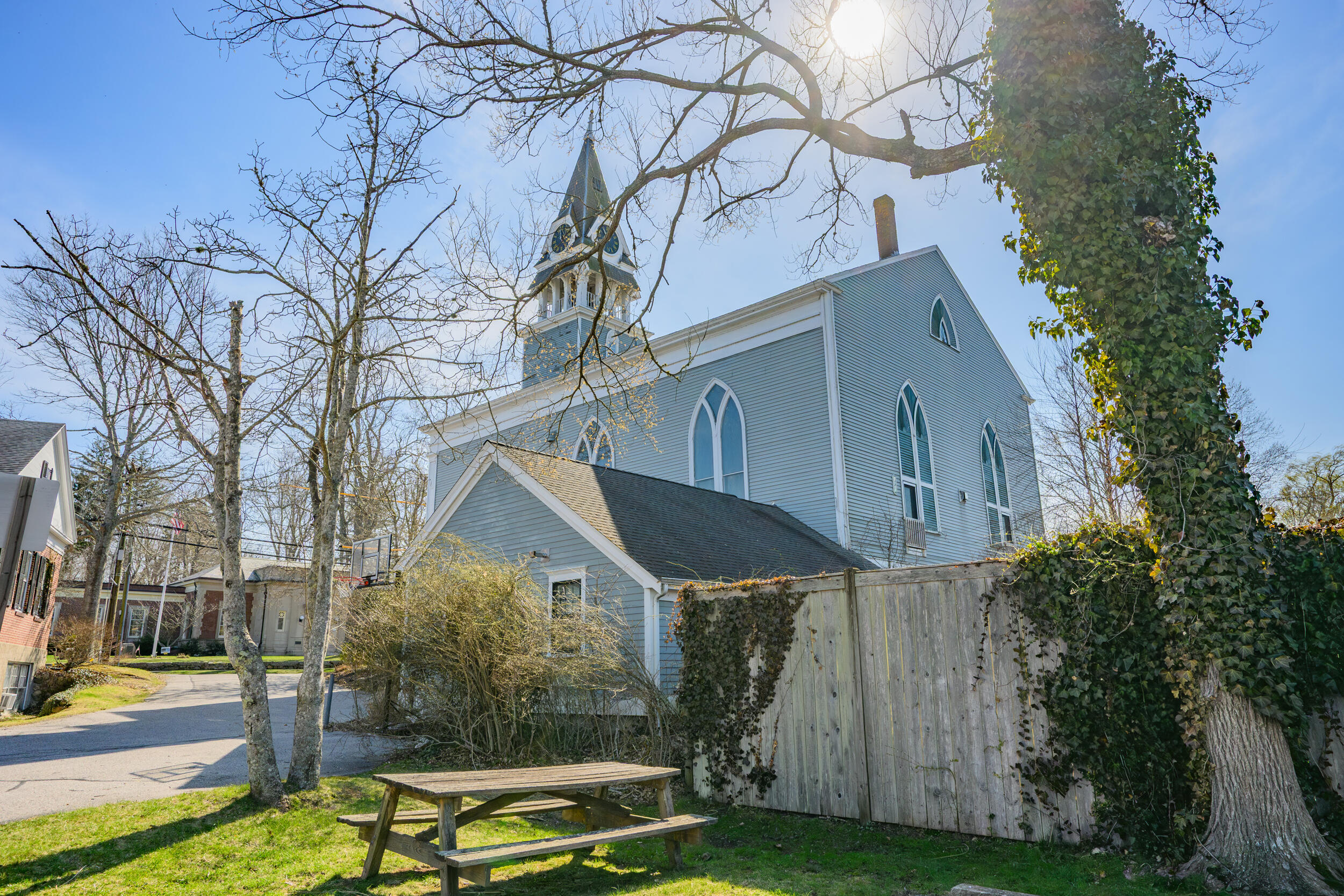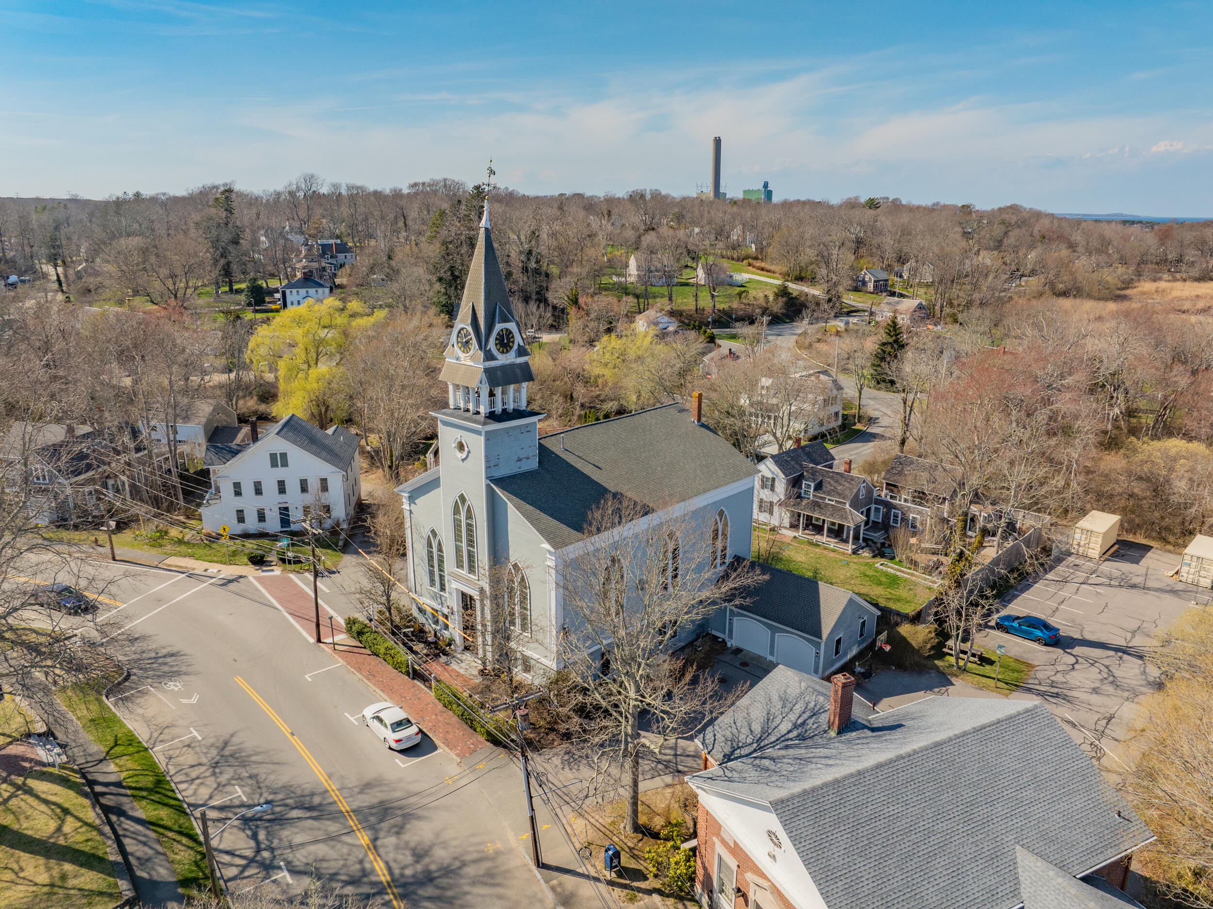 In the heart of Sandwich, Cape Cod's oldest town, stands its oldest public site--the First Parish Meetinghouse, circa 1833--now transformed into a stunning 7,270 sq. ft. light-filled residence. Designed by noted architect Whittemore Peterson, this architectural masterpiece blends Greek Revival and Gothic Revival styles. The property features five en-suite bedrooms, a soaring great room, six gas fireplaces, and a chef's kitchen with Thermador appliances. Historic elements include a restored clock-tower steeple, granite foundation, and mahogany library, complemented by modern conveniences such as an elevator, central air, heated two-car garage, and street-level art gallery with private entrance. Ideally located on Main Street, just steps to shops, dining, Heritage Museums & Gardens, and under a mile to the Sandwich Boardwalk and Town Neck Beach. Explore the many allowable uses of this truly unique property.