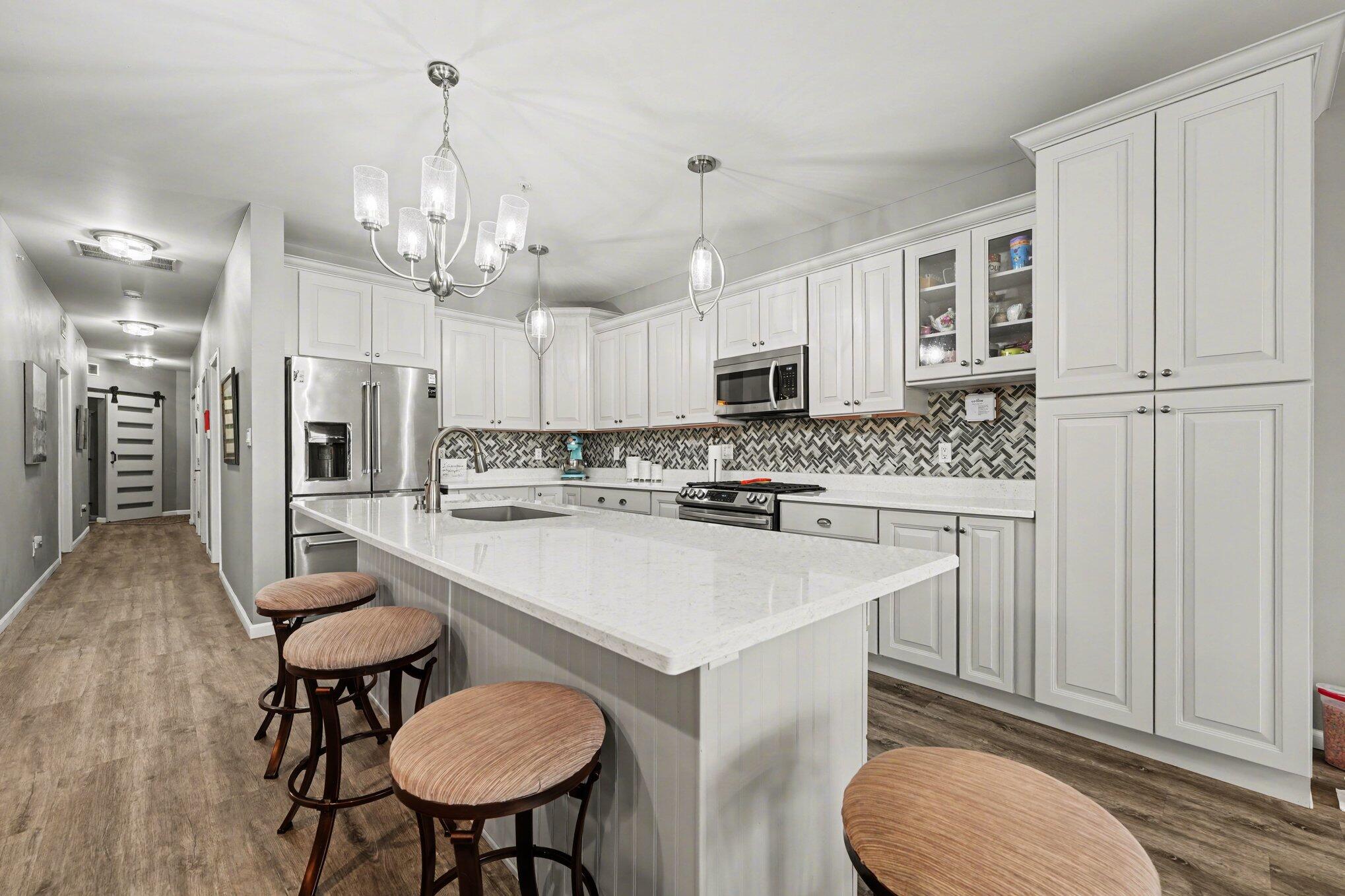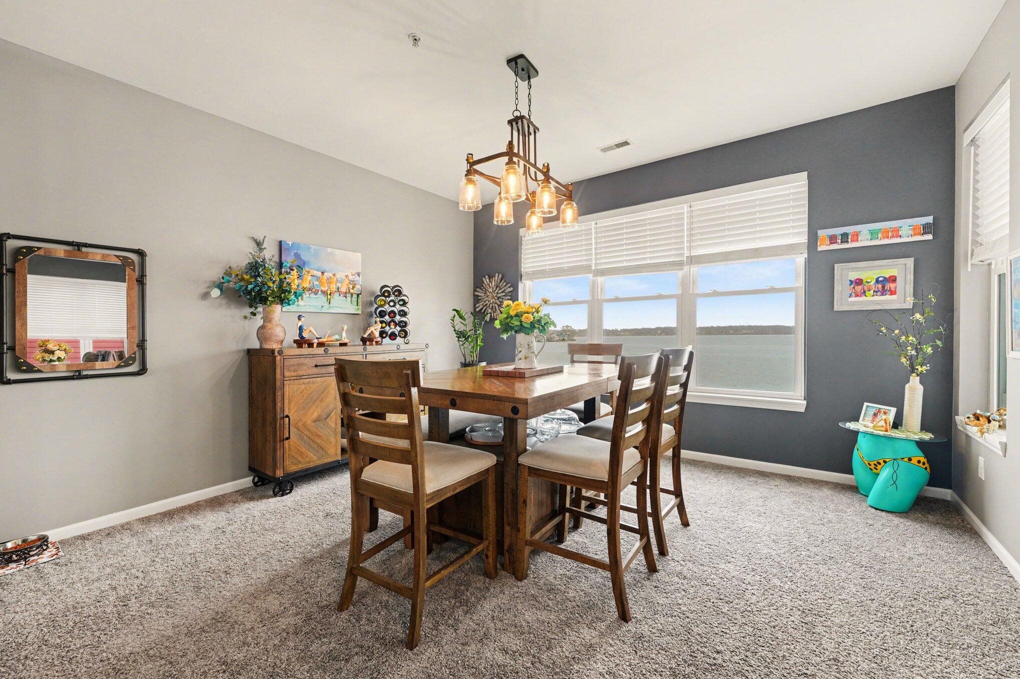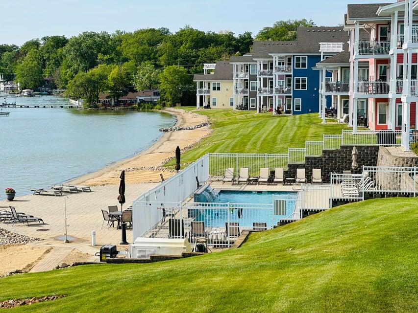 LOCATION! LOCATION! LOCATION! Enjoy maintenance free, year round resort style living in this beautifully remodeled 3 bedroom, 2 bath lake front Condo located close to swimming pool and boat slip. Open concept living room, dining room and kitchen is great for entertaining. The dream kitchen, all redone in 2022, offers a huge island, an abundance of cabinets, quartz counters, tile backsplash, and stainless appliances. The living room and dining room have been archtecturally designed to maximize the lake views and gives access to a covered balcony that overlooks the lake. The spacious master bedroom has a walk-in closet and large ensuite that was remodeled with double sink vanity flanked by cabinets and drawers for plenty of storage. The full guest bath has also been remodeled. Laundry/utility room has a laundry sink. The garage can be easily accessed from the main floor hallway and there is an elevator for added convenience. The carpet (2023) and luxury vinyl flooring (2025) has all been replaced. Windows were replaced in 2024. Garage floor was epoxied by Level 10. Gas fireplace was professionally cleaned and checked. All updates were made within the last 1-4 years. Luxury amenities include gated entrance, lakeside heated in-ground pool, large pier with your own boat slip, and a work out room. THIS IS LAKE FRONT LIVING AT ITS BEST!