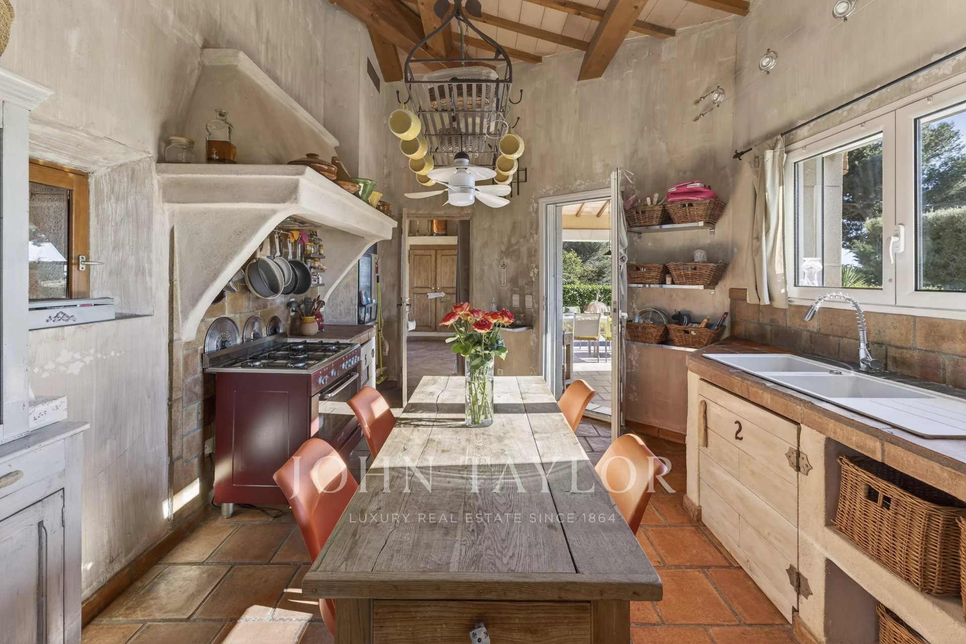 JOHN TAYLOR Sanary/Bandol presents this charming single-storey Provençal villa offering approximately 190 sqm of living space, set within beautifully landscaped grounds of around 5,000 sqm, providing a peaceful and private environment.From the entrance, an elegant patio sets the tone and leads into a spacious living area enhanced by high ceilings, traditional terracotta flooring and a fireplace insert, creating a warm and inviting atmosphere. The living space naturally opens onto the garden, offering a seamless indoor-outdoor lifestyle. The fully equipped Provençal-style kitchen blends harmoniously with the character of the home.The sleeping area is designed for comfort and privacy, featuring two bedrooms with built-in storage, as well as a master suite with its own shower room, WC and mezzanine. A bathroom with both bathtub and shower completes the layout, along with a separate WC. Underfloor heating ensures year-round comfort.Outside, the property reveals its full Mediterranean appeal. The landscaped garden hosts a recently renovated chlorine swimming pool, complemented by an independent pool house with sleeping area, shower room and WC, ideal for hosting guests.A terrace offers partial sea views, enhancing the sense of escape and connection with the surrounding natural environment.An independent one-bedroom apartment (T2), with its own entrance, terrace, equipped kitchen and shower room with WC, provides additional accommodation or rental potential.This property offers a rare balance between authenticity, comfort and potential, making it ideal as a primary or secondary residence in a sought-after Mediterranean setting.To arrange a viewing or for further information, please contact Alexis Kouvaris, Real Estate Consultant, on +33 6 31 15 11 28.