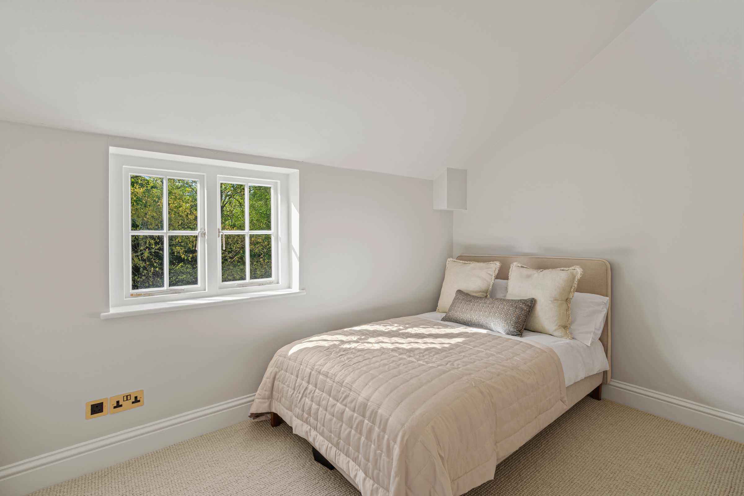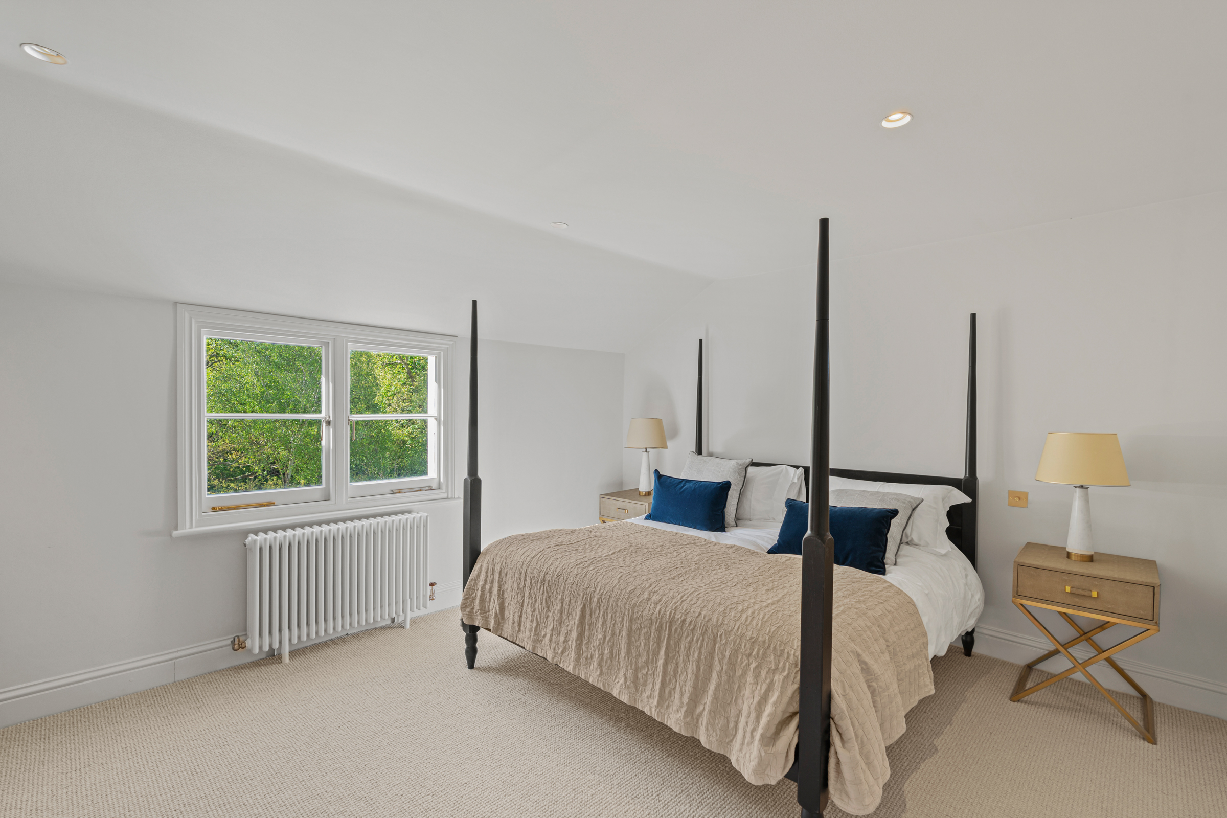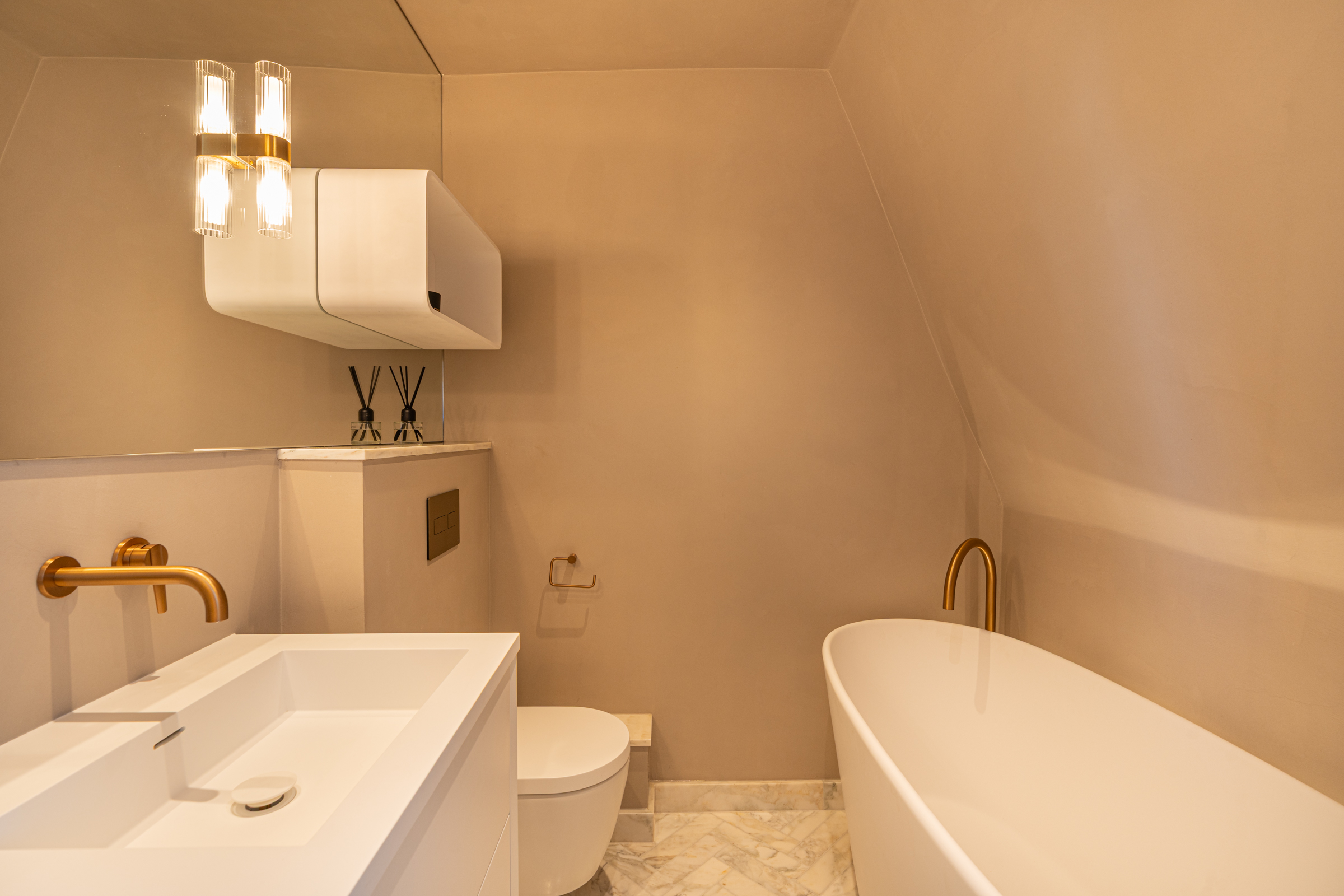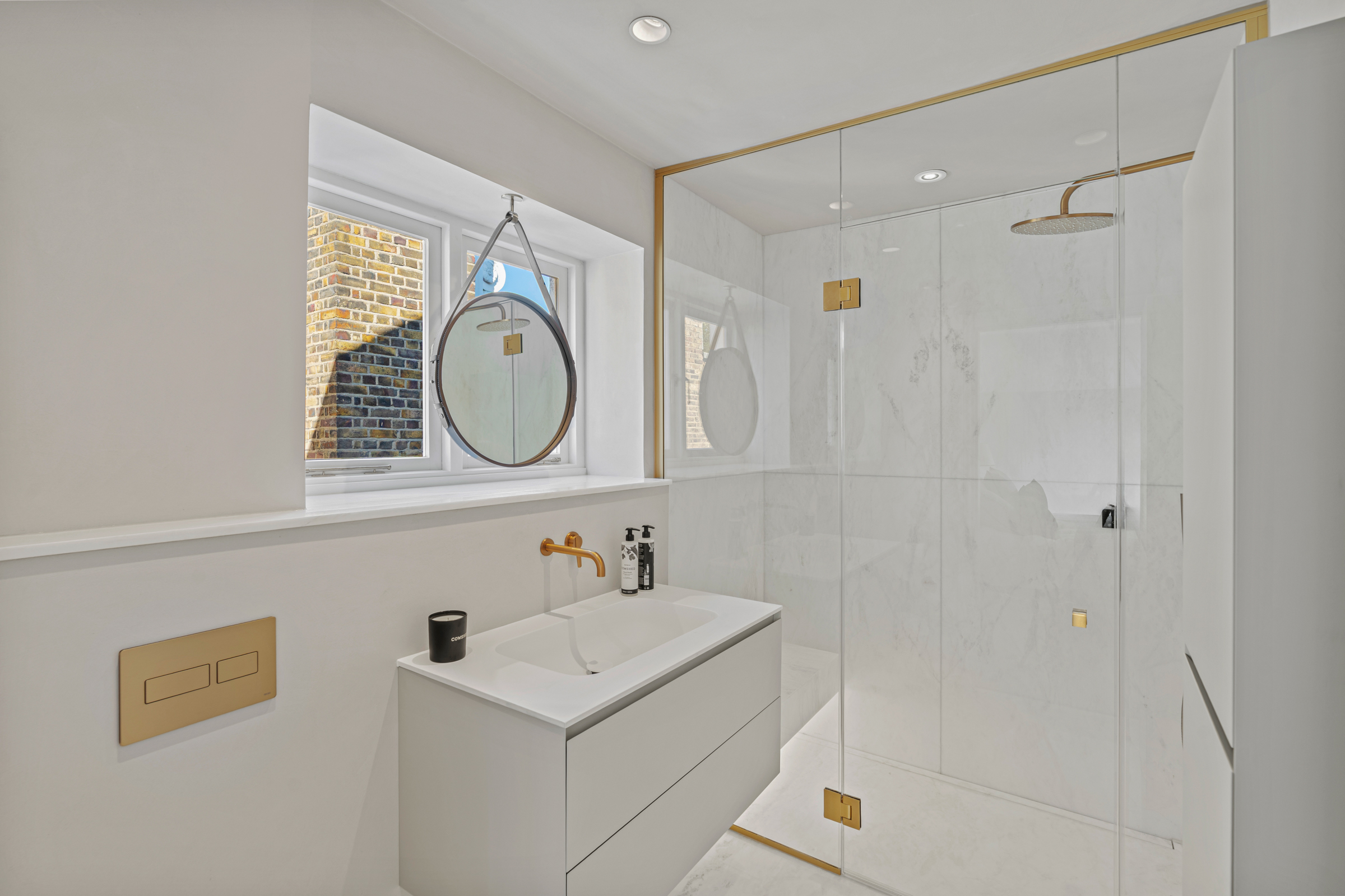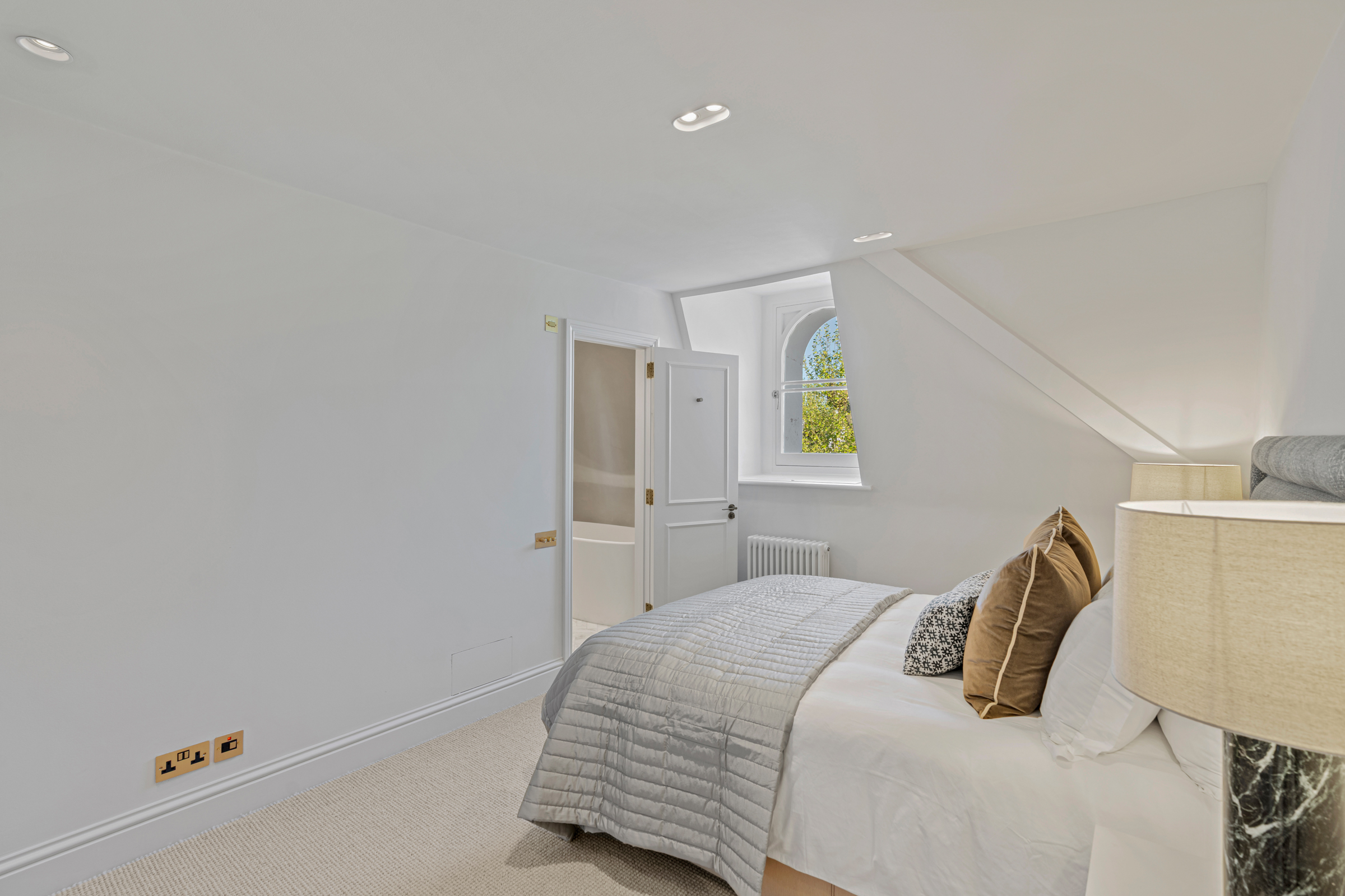 The principal bedroom suite is well-proportioned, with bespoke wardrobes and a dedicated study area subtly integrated into the design. Its ensuite bathroom is a shower and steam room finished in bookmatched marble. A second bedroom also benefits from its own ensuite, complete with a full-sized bath, while the third bedroom, currently arranged as a study, is served by a separate shower room. Comfort cooling has been introduced to both principal bedrooms and the reception space, ensuring year-round comfort.