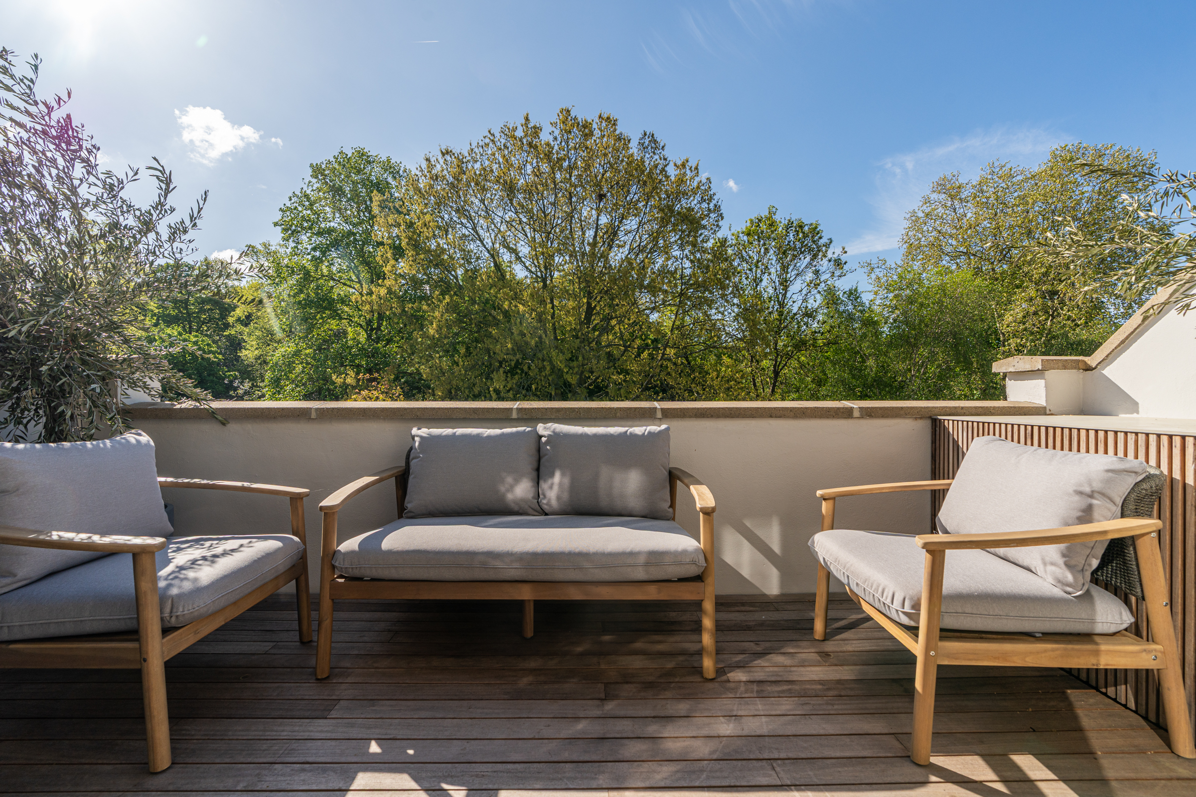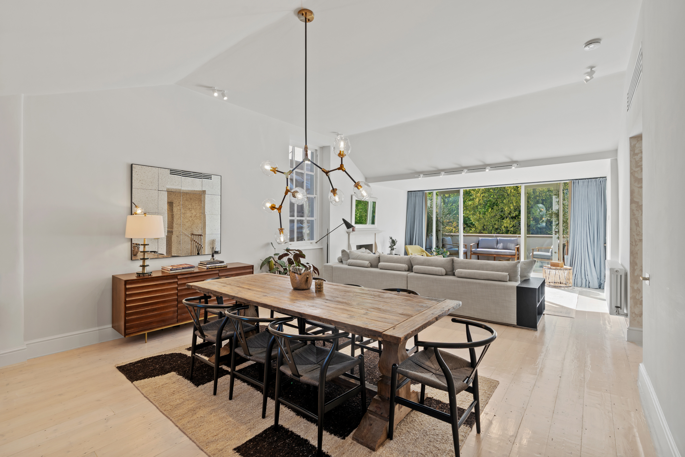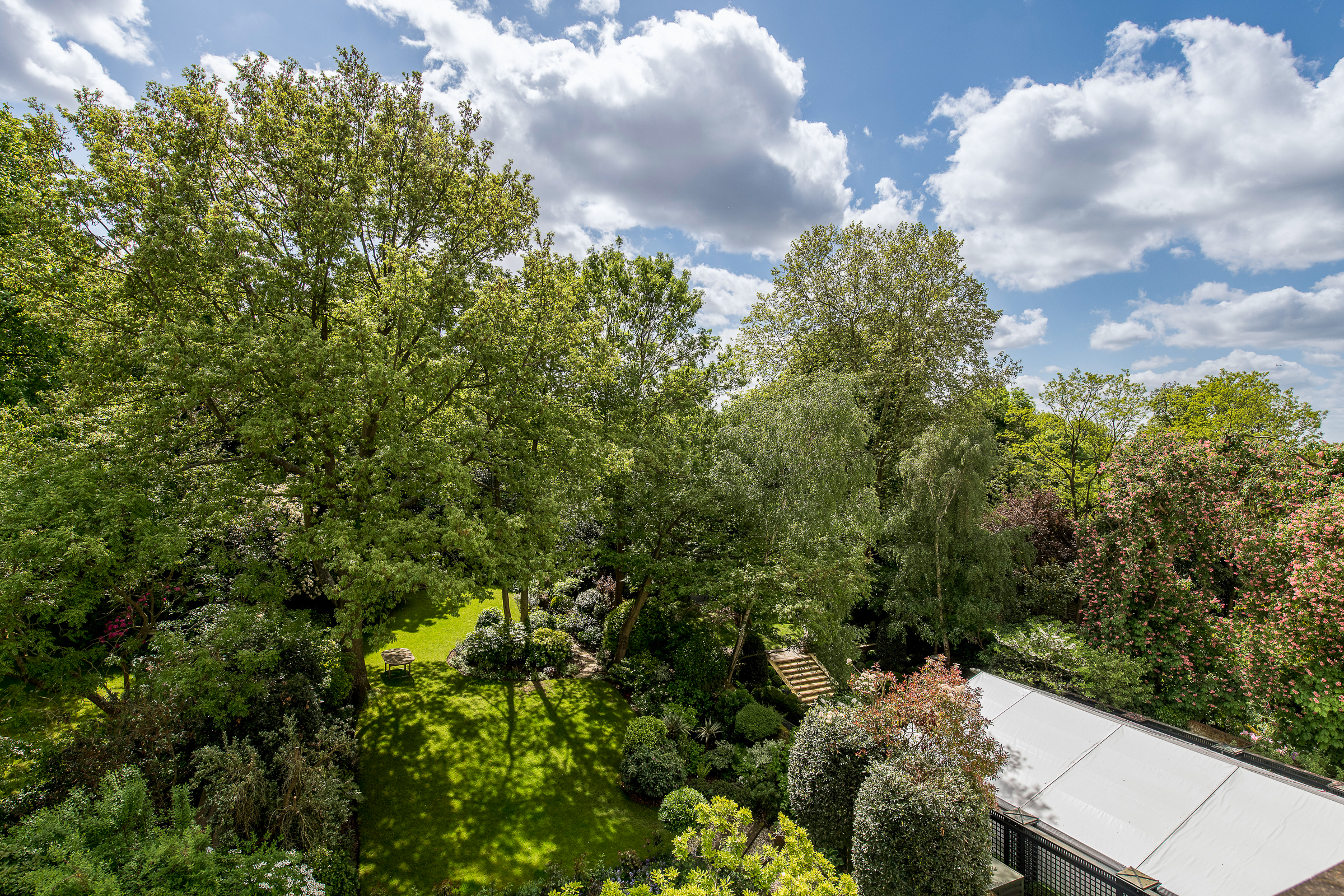 Entry is on the second floor and stairs lead the the third floor, where the apartment unfolds with a sense of drama and scale. The principal reception room is particularly striking: a vast, double-height space where ceiling heights soar and light pours in through expansive glazing. Measuring over 32 ft in length, it is a room designed as much for entertaining as it is for everyday life. Full-height doors open onto the terrace, where the view is uninterrupted, stretching across the manicured communal garden and into the treetops of the park beyond. The orientation ensures sunlight throughout the day, making the terrace a natural extension of the living space.