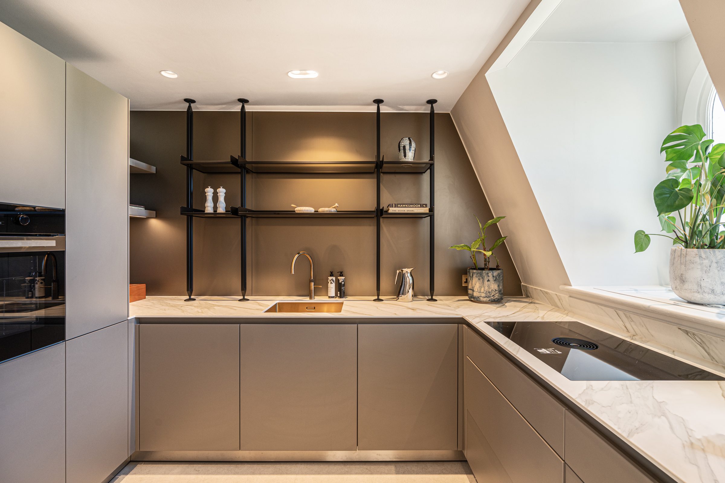 The kitchen sits just off the main living area, finished in Bulthaup cabinetry and equipped with a Bora hob and Miele appliances. Porcelain worktops and matte black detailing lend a quiet precision to the space, balancing practicality with a refined, architectural aesthetic.