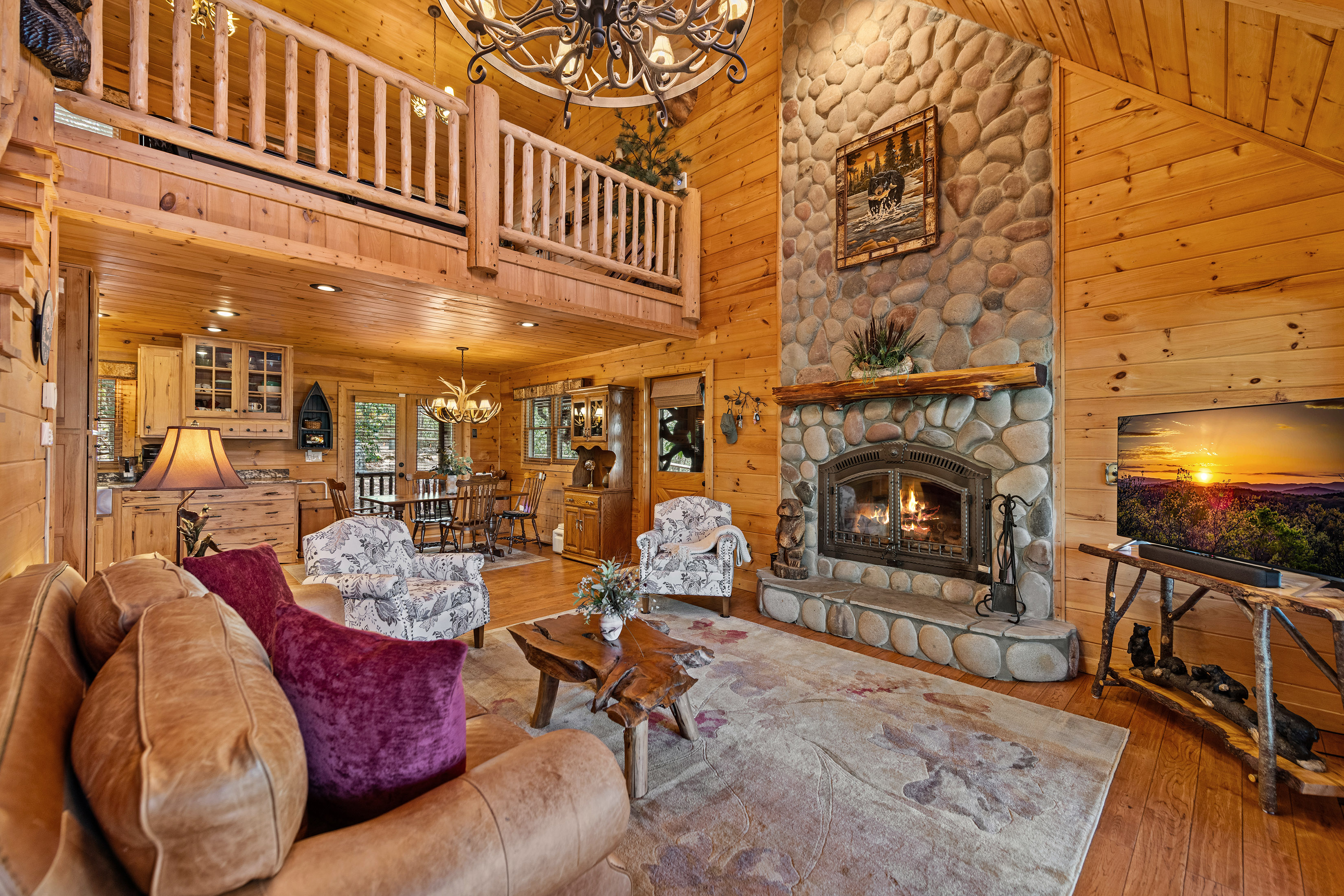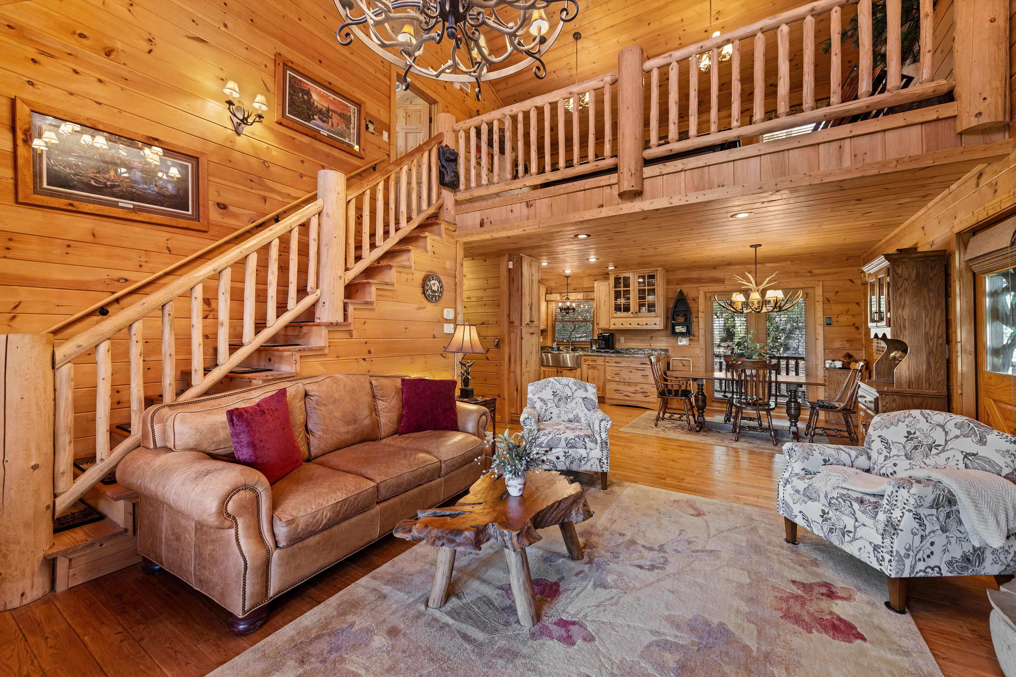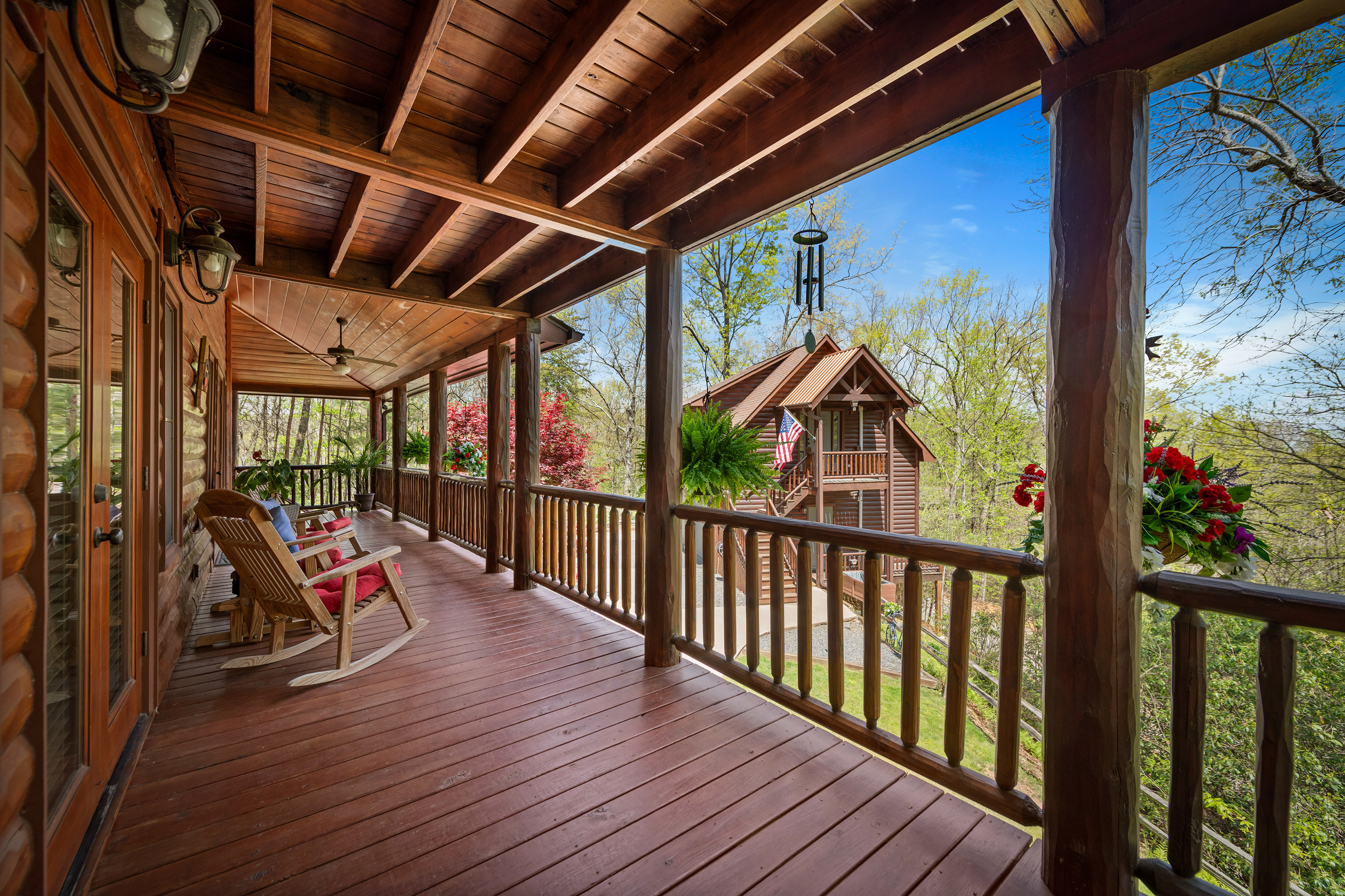 Located in the heart of the coveted Aska Adventure Area, this meticulously maintained four-bedroom, four-bath mountain retreat offers the very best of Blue Ridge living. Privately nestled on 1.6 acres with all-paved access from town, this property reflects true pride of ownership throughout. Just minutes from tubing and kayaking on the Toccoa River, Lake Blue Ridge boat launch, and premier hiking and biking trails , all while a short drive to downtown Blue Ridge. The main level welcomes you with soaring ceilings, a stunning river rock fireplace, and an open kitchen and dining area. Three sets of doors extend to a wraparound covered porch with fireplace and grilling station perfect for year-round enjoyment. A guest bedroom and full bath complete the main level. Upstairs, a spacious loft (currently a billiards room) leads to a private primary suite with its own covered porch and existing long-range mountain views. The terrace level offers a den, flex room, bunk bedroom, and full bath, with French doors opening to a level, private yard ideal for pets or gardening. A detached oversized two-car garage with epoxy floors and workspace includes a large finished room with full bath above perfect for a gym, office, or guest suite. Currently, long-range views are enjoyed from the upstairs bedroom and loft, and with thoughtful vista pruning, those views could be opened from the main and terrace levels. Move-in ready with a rare blend of impeccable care, privacy, and potential. Flat, usable yard and proximity to town make it ideal as a full-time home, private getaway or high-performing rental investment