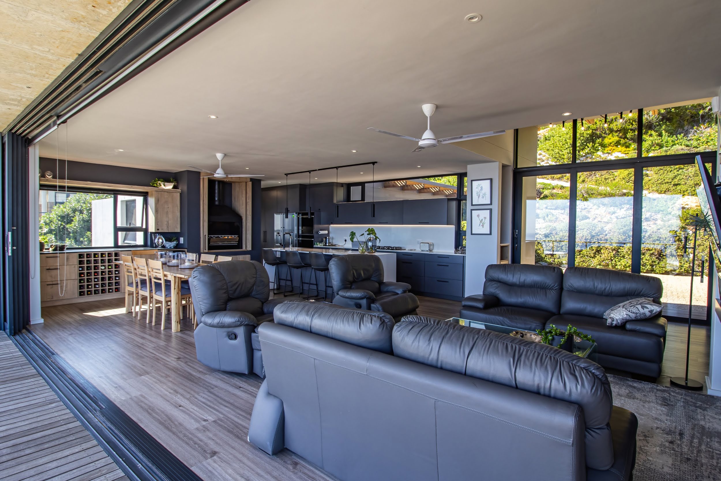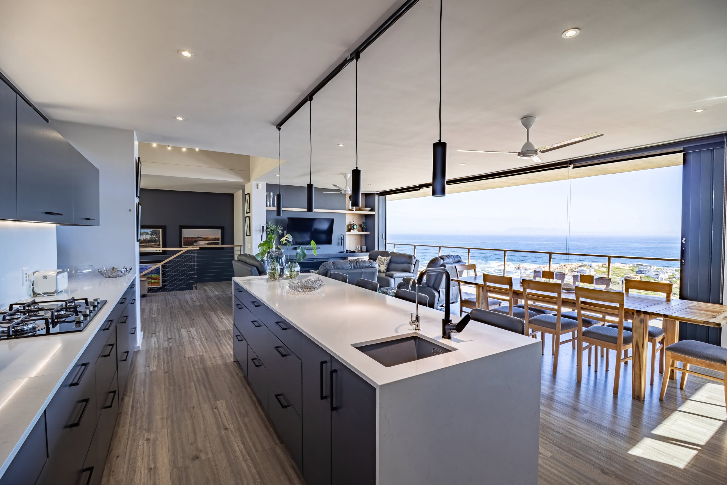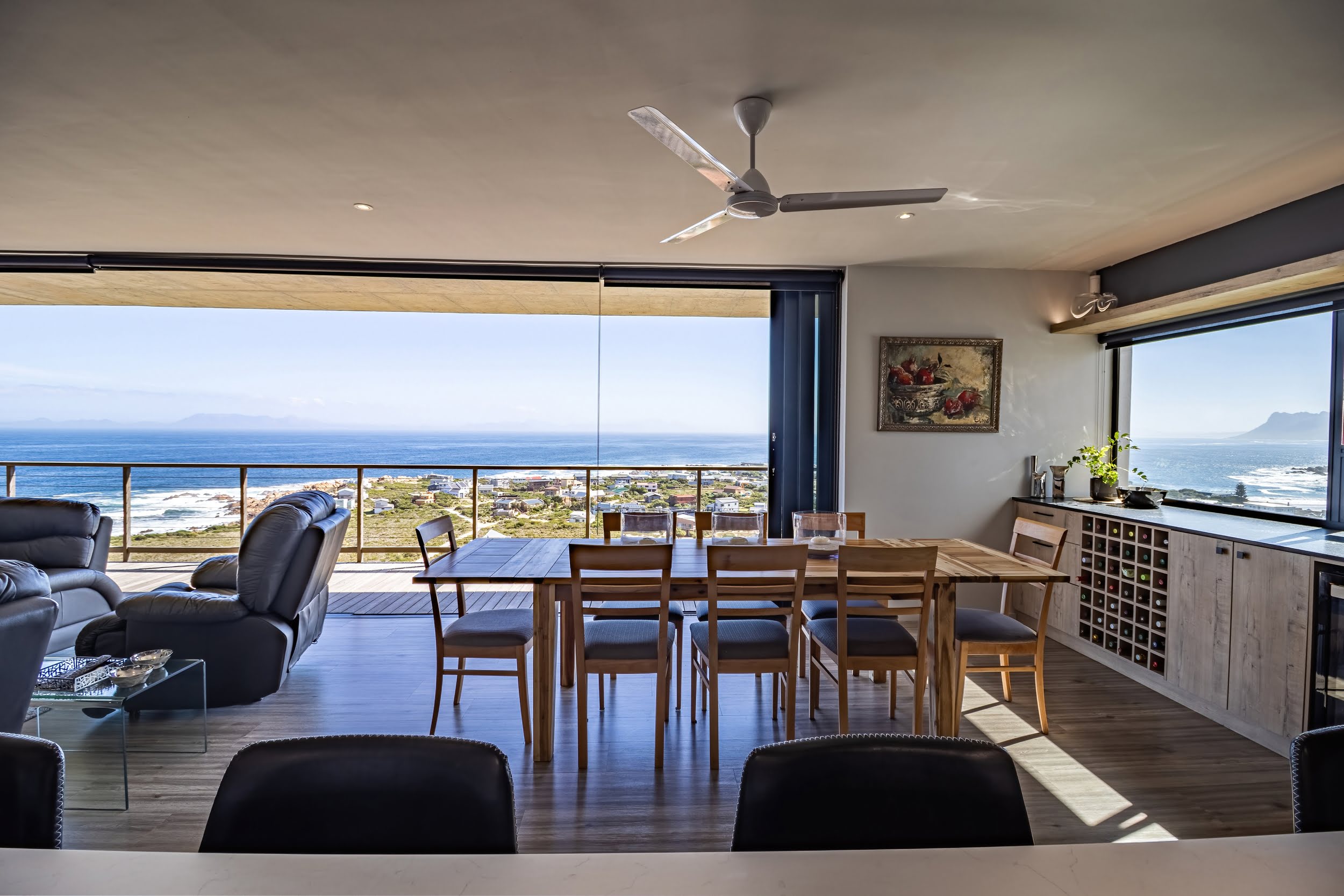 Mornings unfold with the scent of indigenous fynbos and the distant sight of whales breaching in the bay below. Thoughtfully designed, the home’s clean, minimalist architecture allows the surrounding landscape to take centre stage, while the open-plan living and dining areas, complemented by a gourmet kitchen, create a seamless flow that naturally draws the eye toward uninterrupted ocean views.