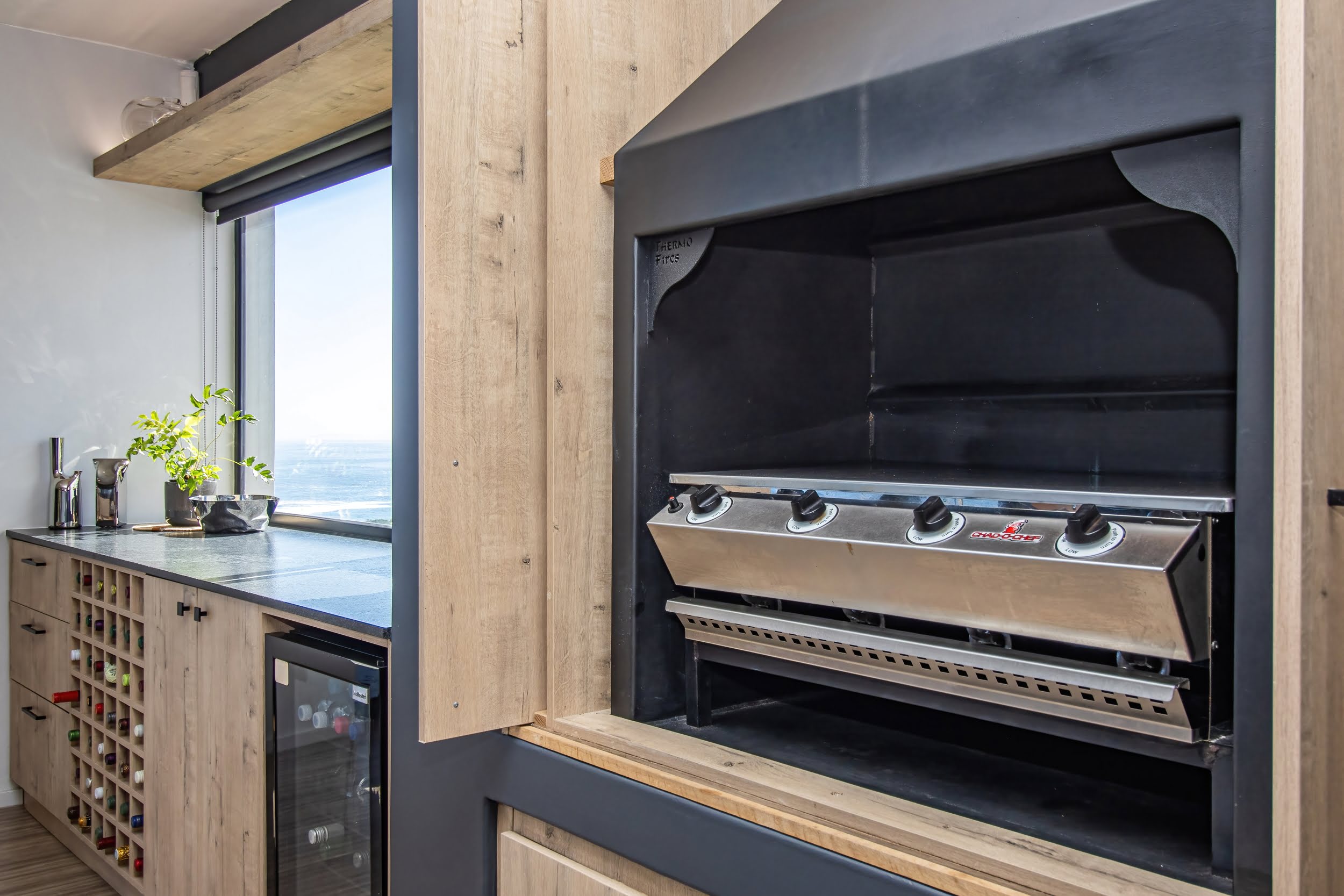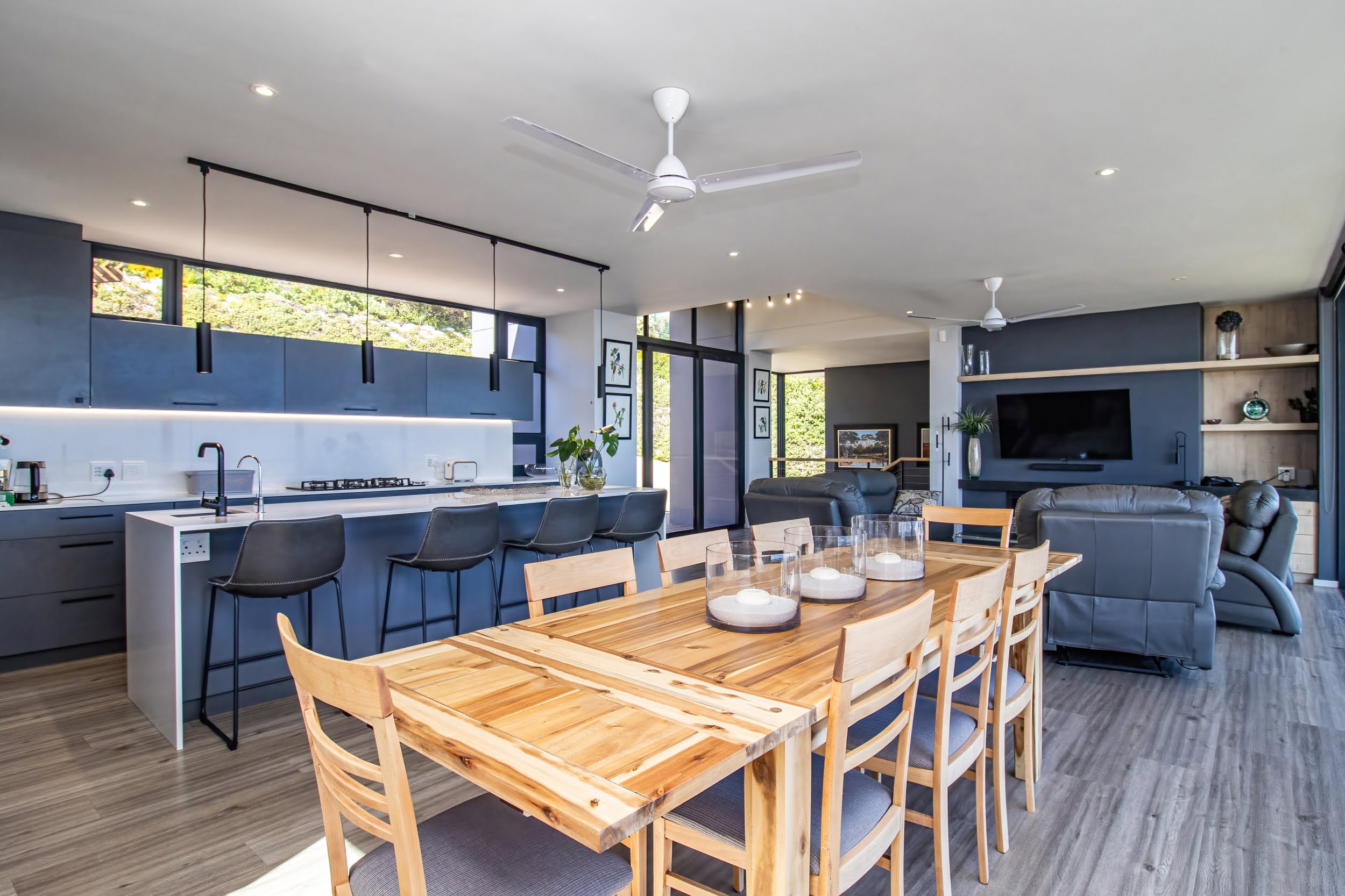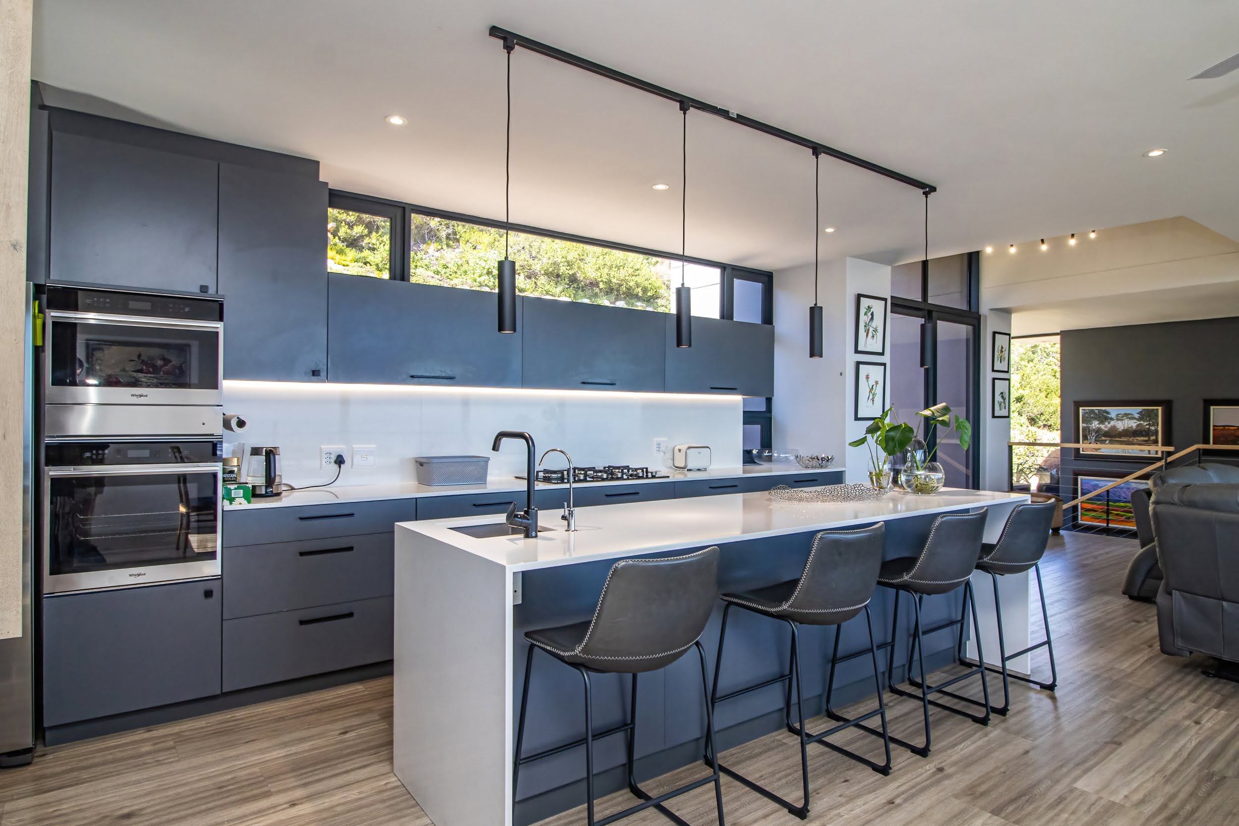 Mornings unfold with the scent of indigenous fynbos and the distant sight of whales breaching in the bay below. Thoughtfully designed, the home’s clean, minimalist architecture allows the surrounding landscape to take centre stage, while the open-plan living and dining areas, complemented by a gourmet kitchen, create a seamless flow that naturally draws the eye toward uninterrupted ocean views.