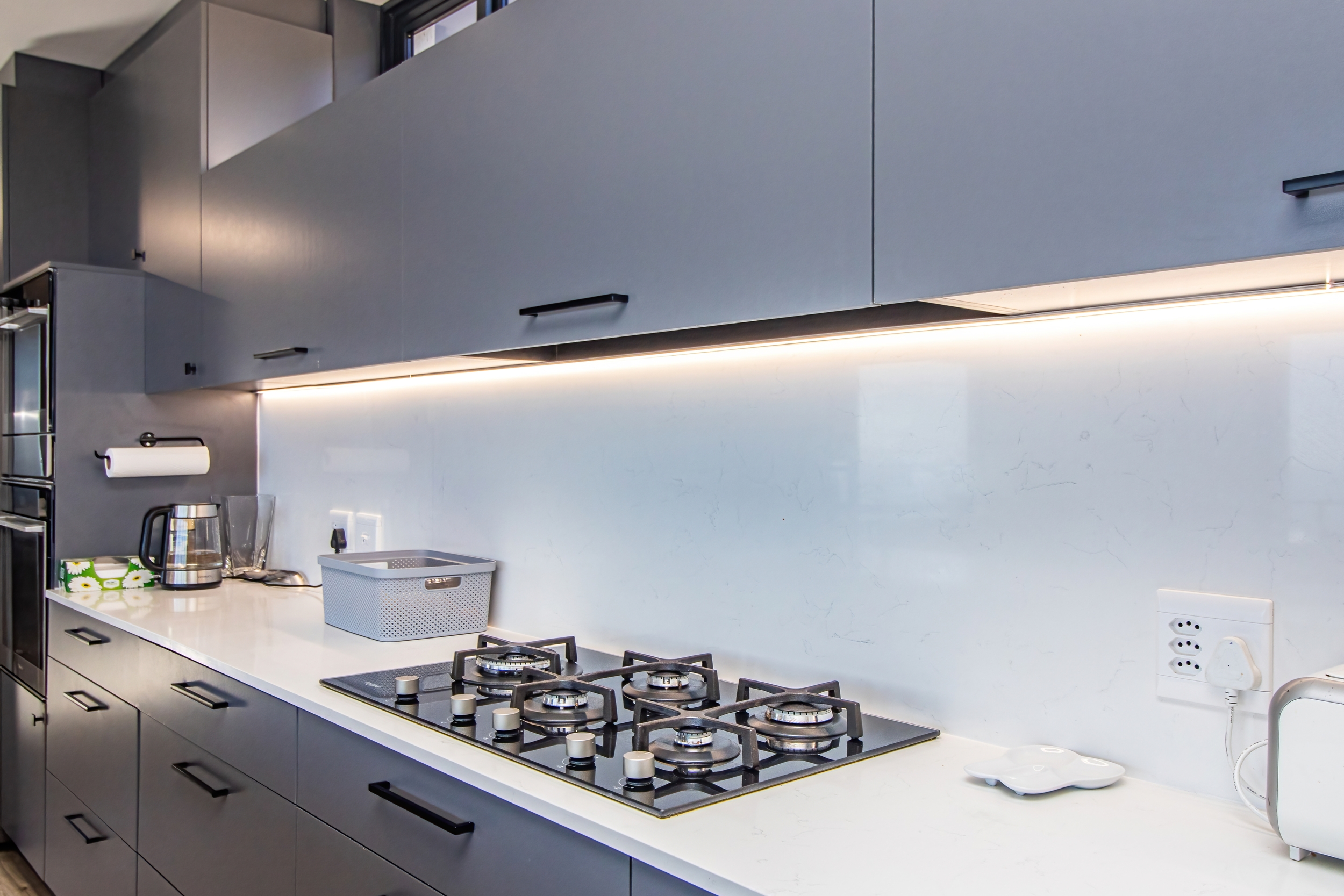 The property includes a comprehensive range of features and fixtures, such as air conditioners, bathroom cabinets and mirrors, blinds, a burglar alarm, ceiling fans, kitchen island chairs, remote and biometric access, curtains and curtain rails, an extractor fan, fireplace, decorative planters, garage door remote and shelving, gas cylinder, geysers, HD TV cabling, hob and oven, inverter system with batteries, prepaid electricity meter, satellite dish, security beams, towel rails, a water filtration system, as well as all lighting and fittings.