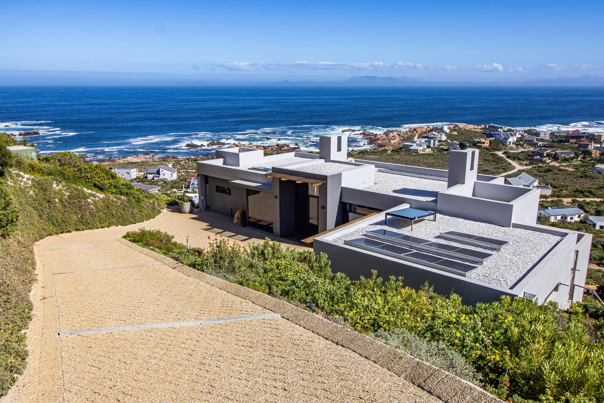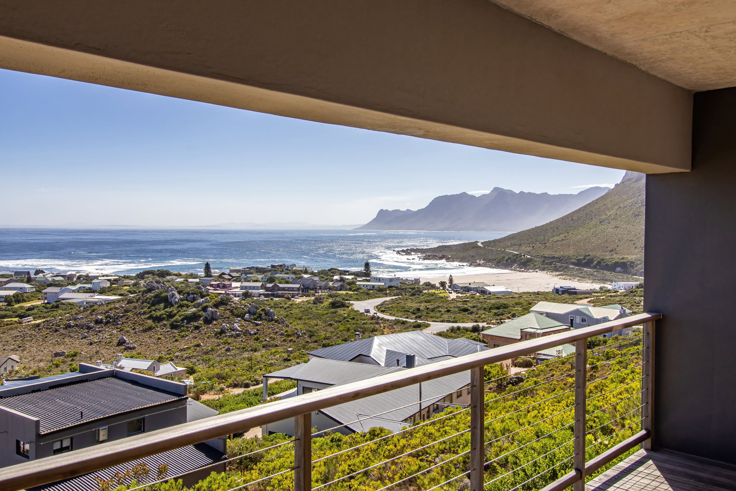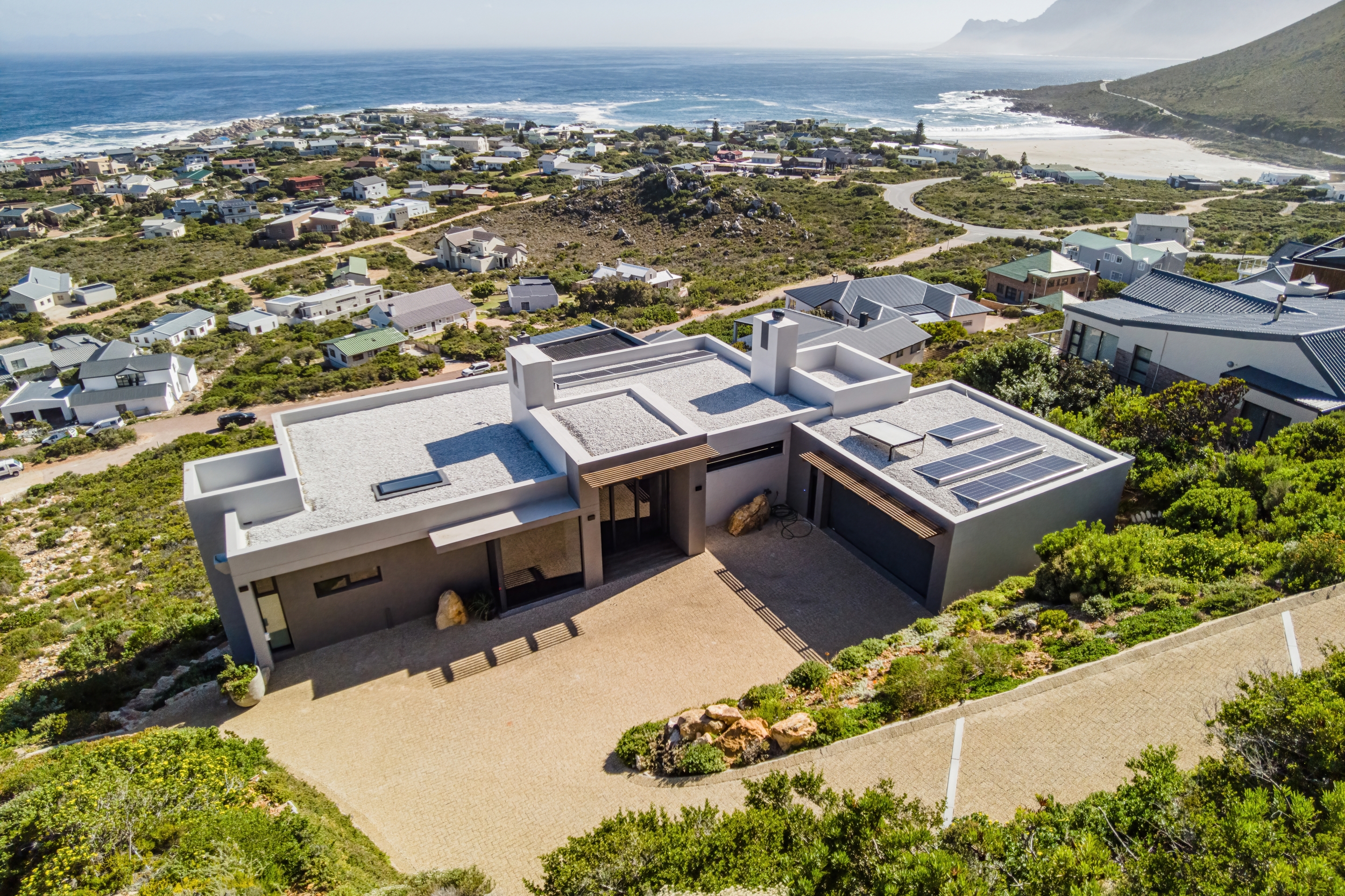 Nestled in the pristine coastal village of Rooiels , this contemporary residence presents a rare opportunity to live in harmony with one of the world’s most biodiverse regions. Elevated along the slopes of the Klein Hangklip Mountain , the home offers a refined vantage point over the breathtaking Kogelberg Biosphere —a UNESCO-recognised natural sanctuary.