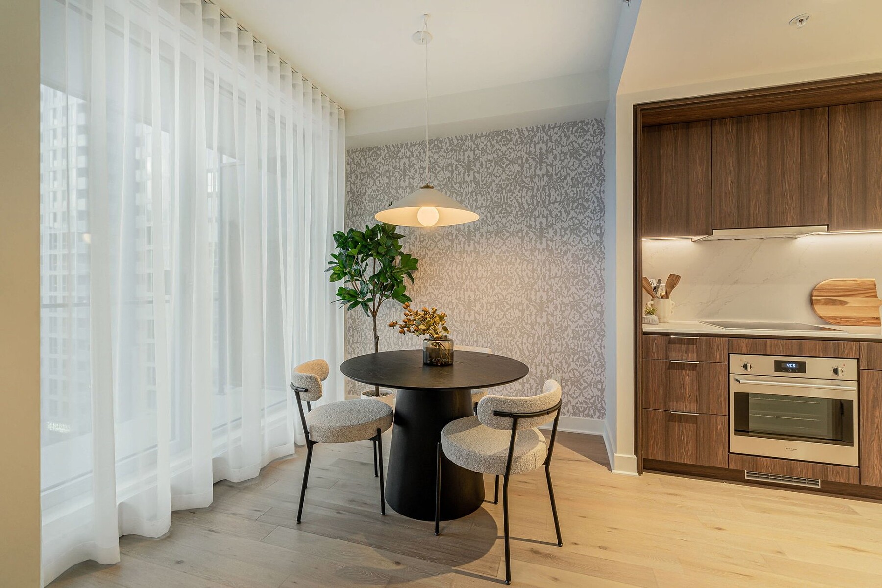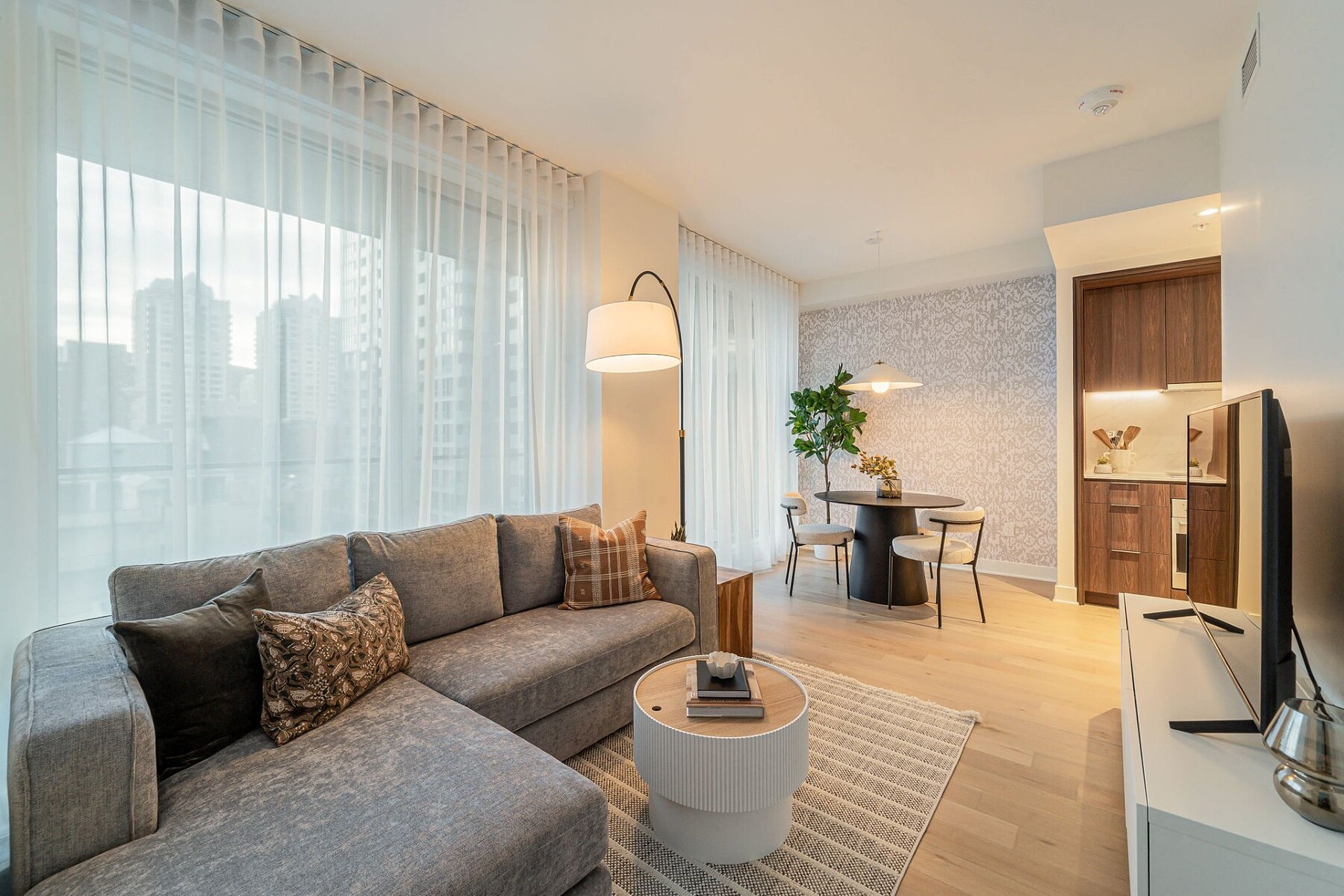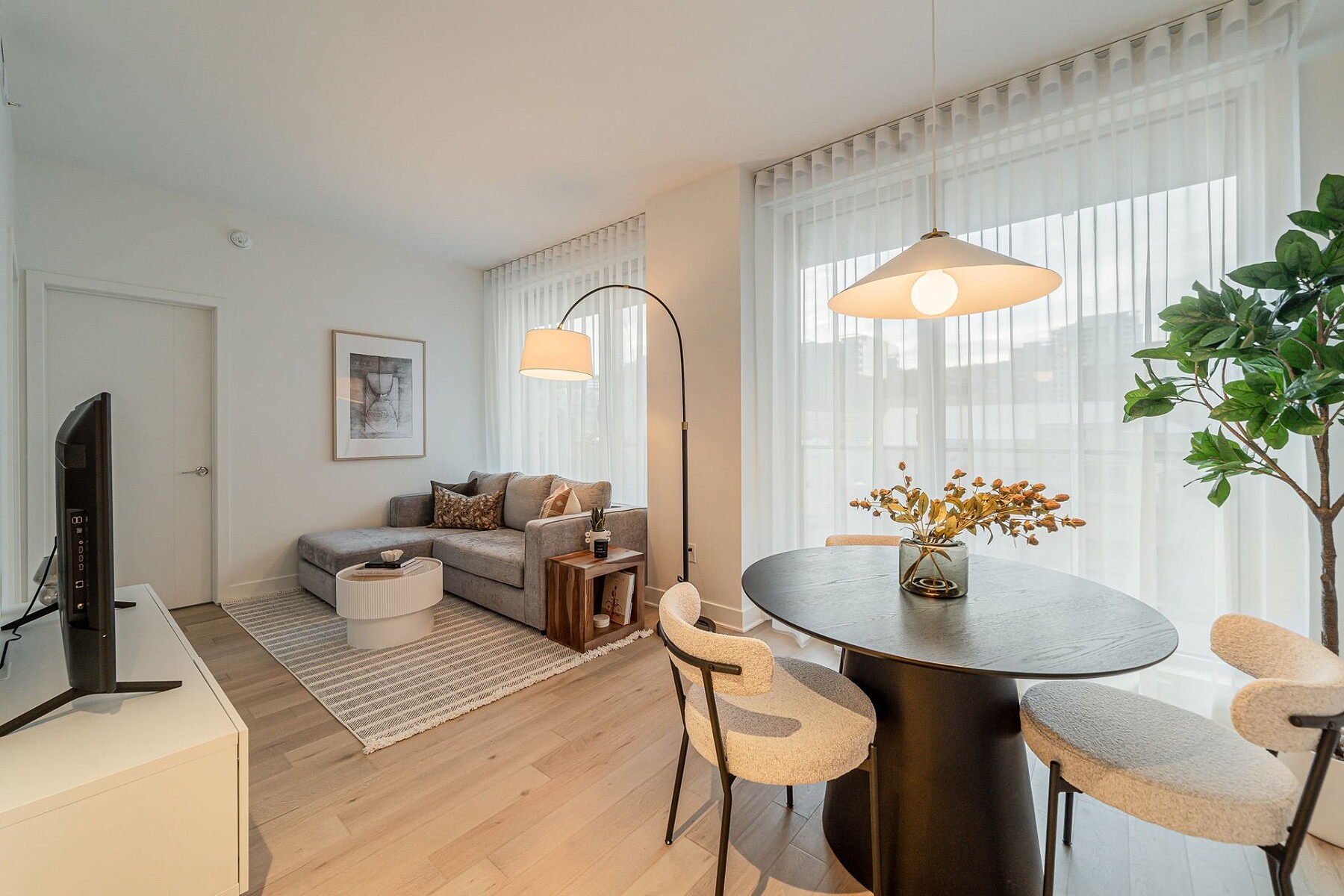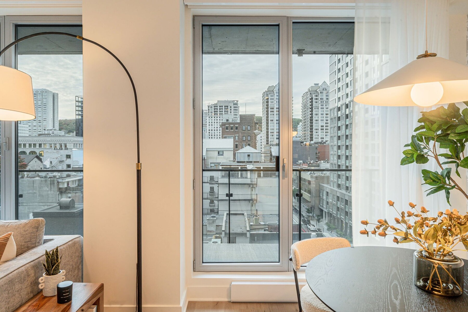 Furnished apartment for rent in the heart of downtown Montréal, featuring one bedroom, an open-concept living area, and five appliances. The stunning windows provide a panoramic view of Mount Royal. Gatsby Condominiums invites you to discover a contemporary layout within this elegantly designed building. The residence offers exceptional services and top-level security. A storage space is included. Ideally located between Peel and Guy-Concordia metro stations, with numerous amenities and services nearby. Easy access to major highways.