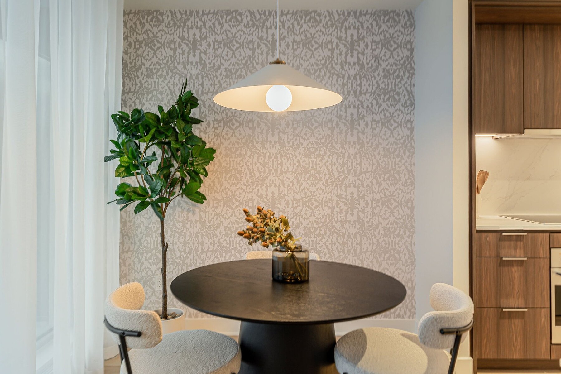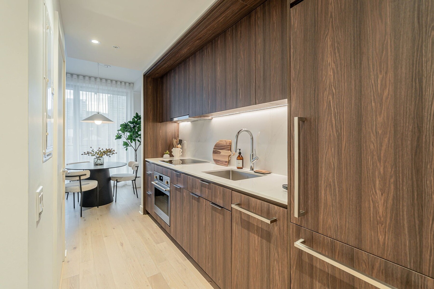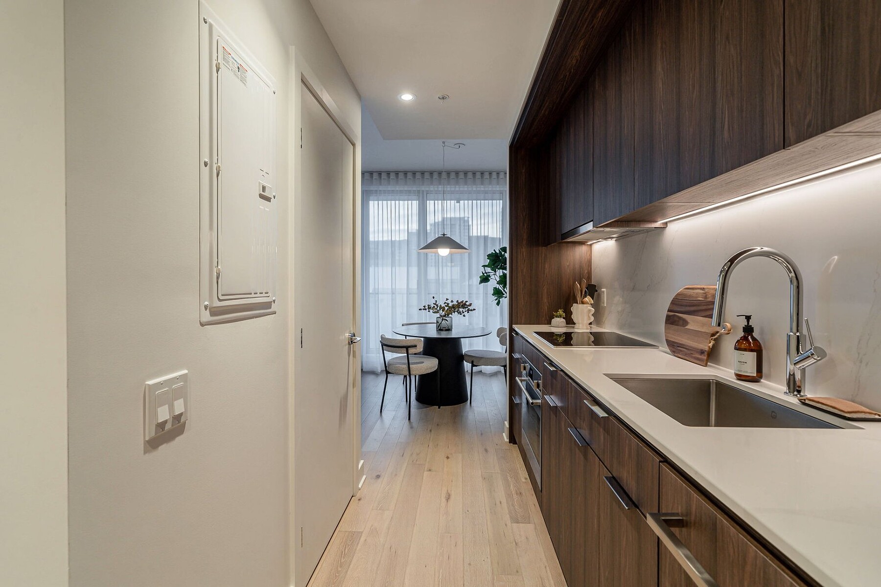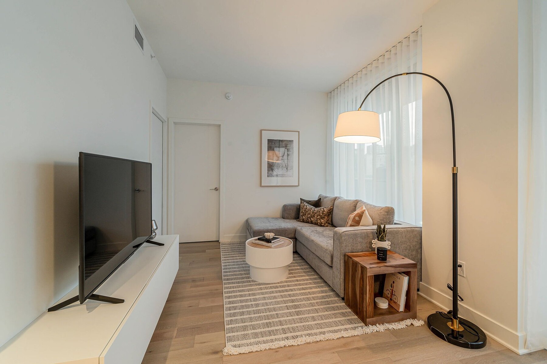 Furnished apartment for rent in the heart of downtown Montréal, featuring one bedroom, an open-concept living area, and five appliances. The stunning windows provide a panoramic view of Mount Royal. Gatsby Condominiums invites you to discover a contemporary layout within this elegantly designed building. The residence offers exceptional services and top-level security. A storage space is included. Ideally located between Peel and Guy-Concordia metro stations, with numerous amenities and services nearby. Easy access to major highways.