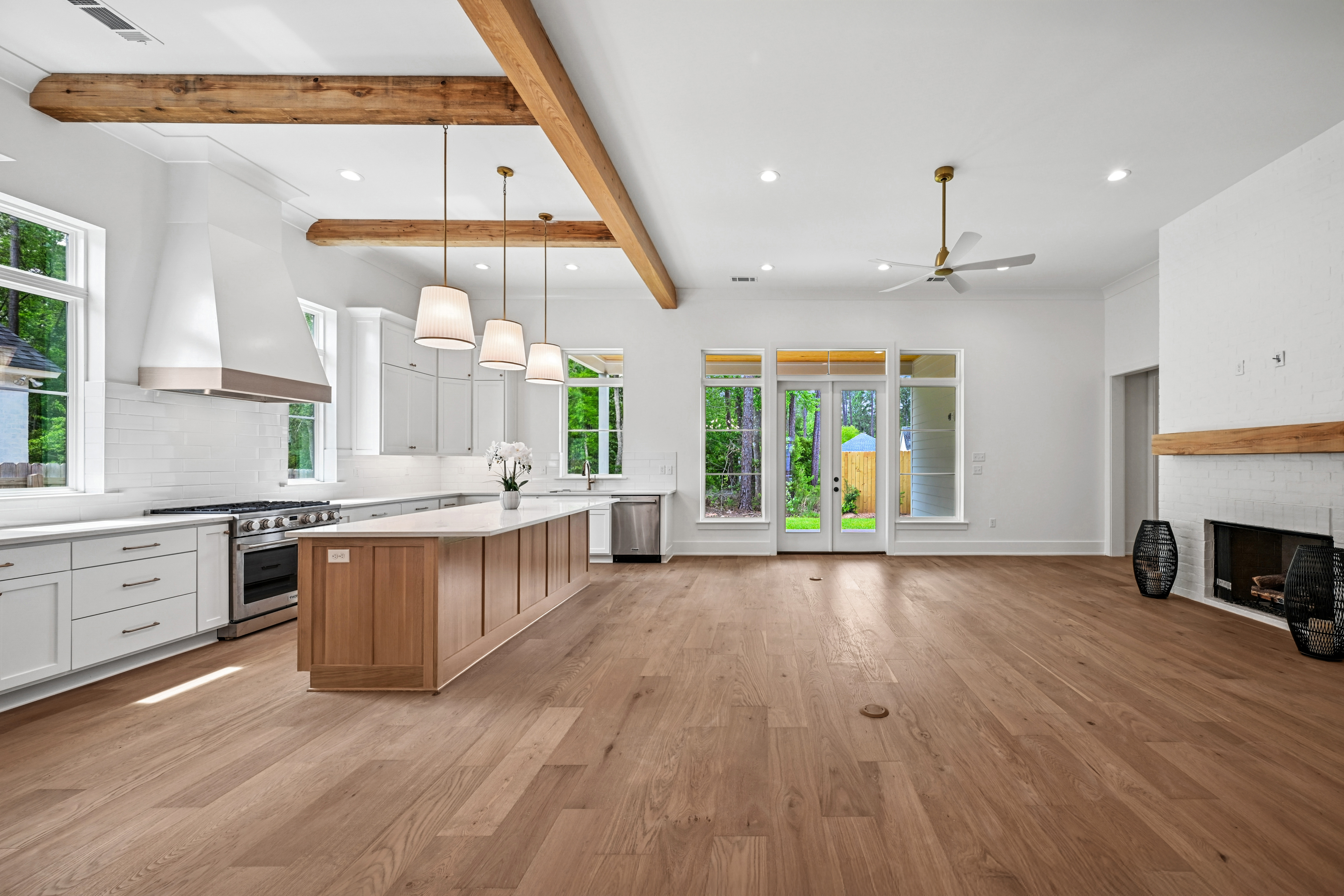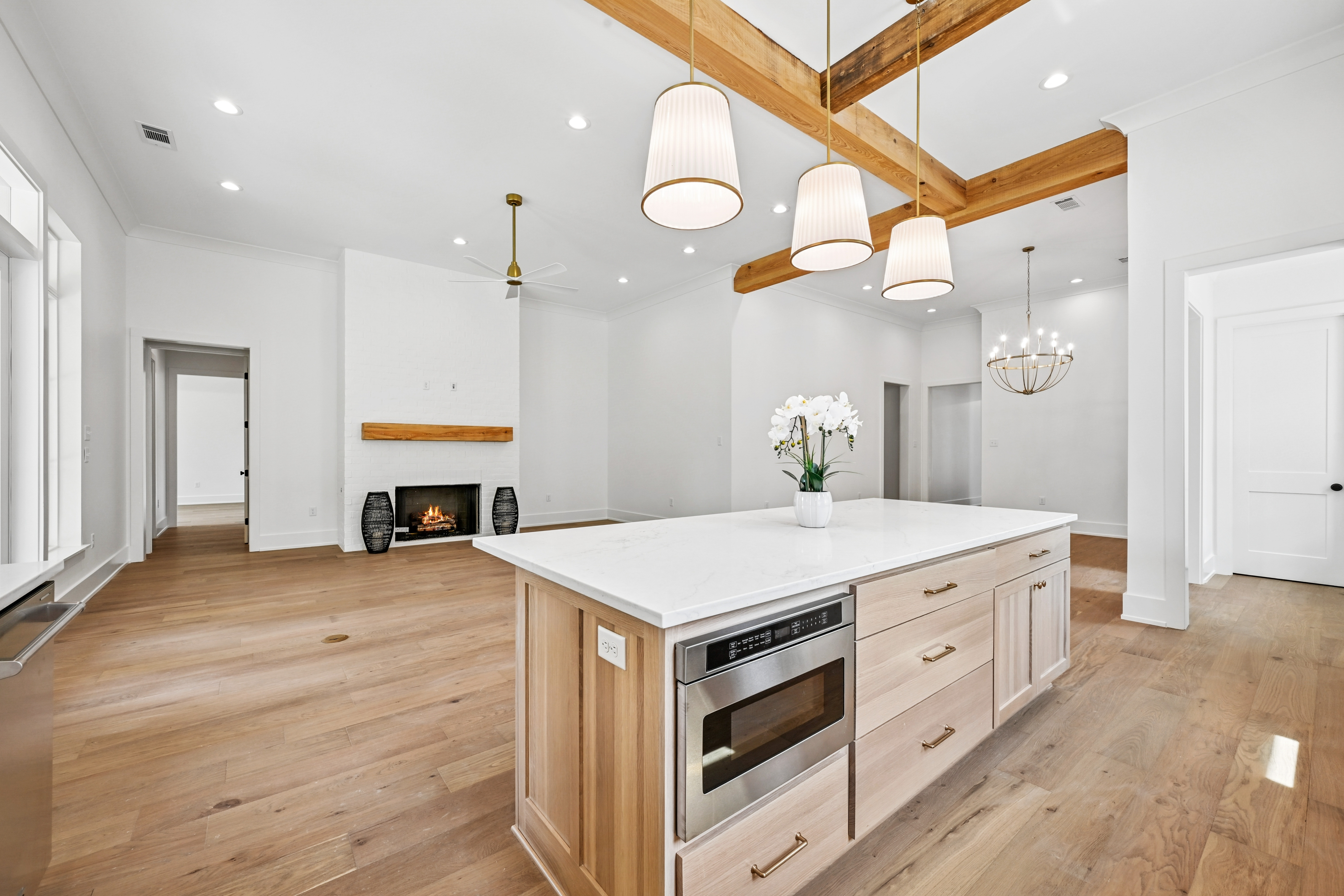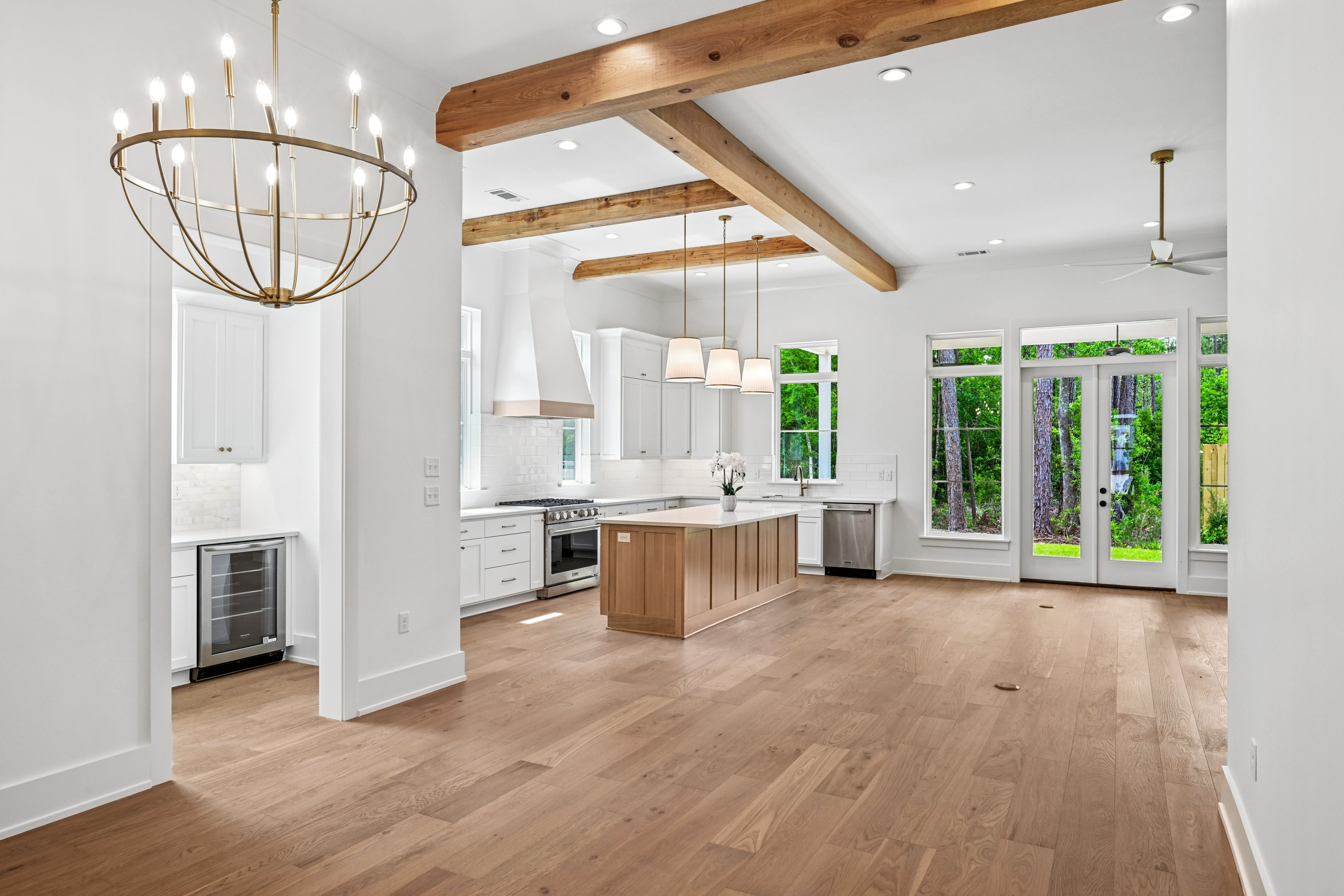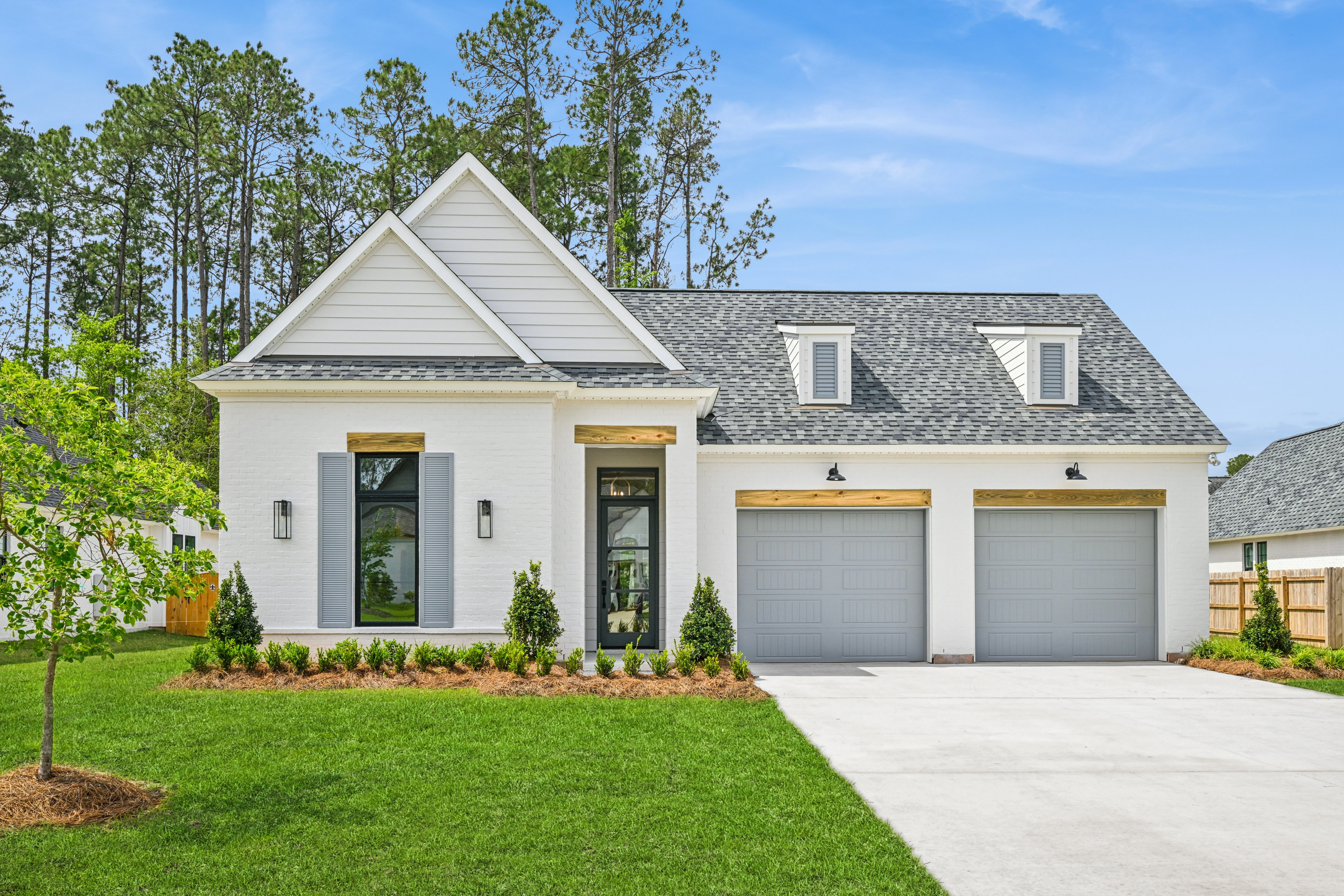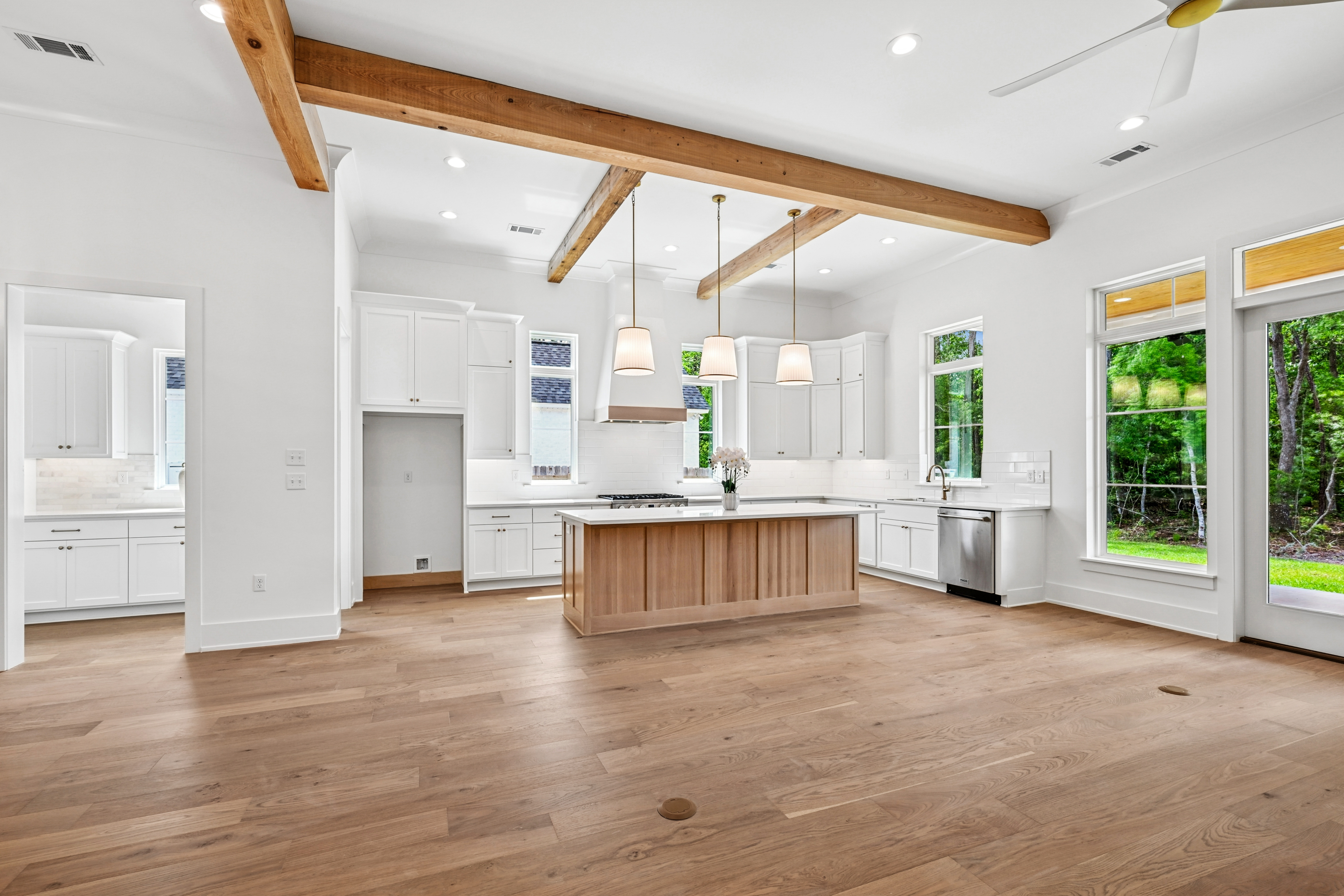 The final phase of the desirable Grande Maison community is here, with only a few new construction homes remaining. This traditional 4-bedroom, 3.5-bath home offers a thoughtfully designed layout with abundant closet space, bright and airy interiors, and beautiful exposed beams throughout. The 12 foot ceilings expand throughout the living, kitchen and dining. The kitchen is both functional and elegant, featuring Thor appliances and a convenient butler’s pantry—perfect for storing small appliances and keeping the main space uncluttered—along with an oversized walk-in pantry that provides exceptional storage. The primary suite is a true retreat, highlighted by a serene bathroom with a freestanding soaking tub and stunning floor-to-ceiling tile. Bedroom 2 has access to a full bath, while Bedrooms 3 and 4 share a well-appointed Jack-and-Jill bathroom with ample cabinetry. A Designated office/ extra room is near the painted mudroom w storage for shoes, bags and coats. Step outside to a covered back porch, already plumbed for a future outdoor kitchen, offering the perfect opportunity to create your ideal entertaining space. Enjoy peaceful evenings overlooking the rare green space behind the home—a unique and desirable feature.
