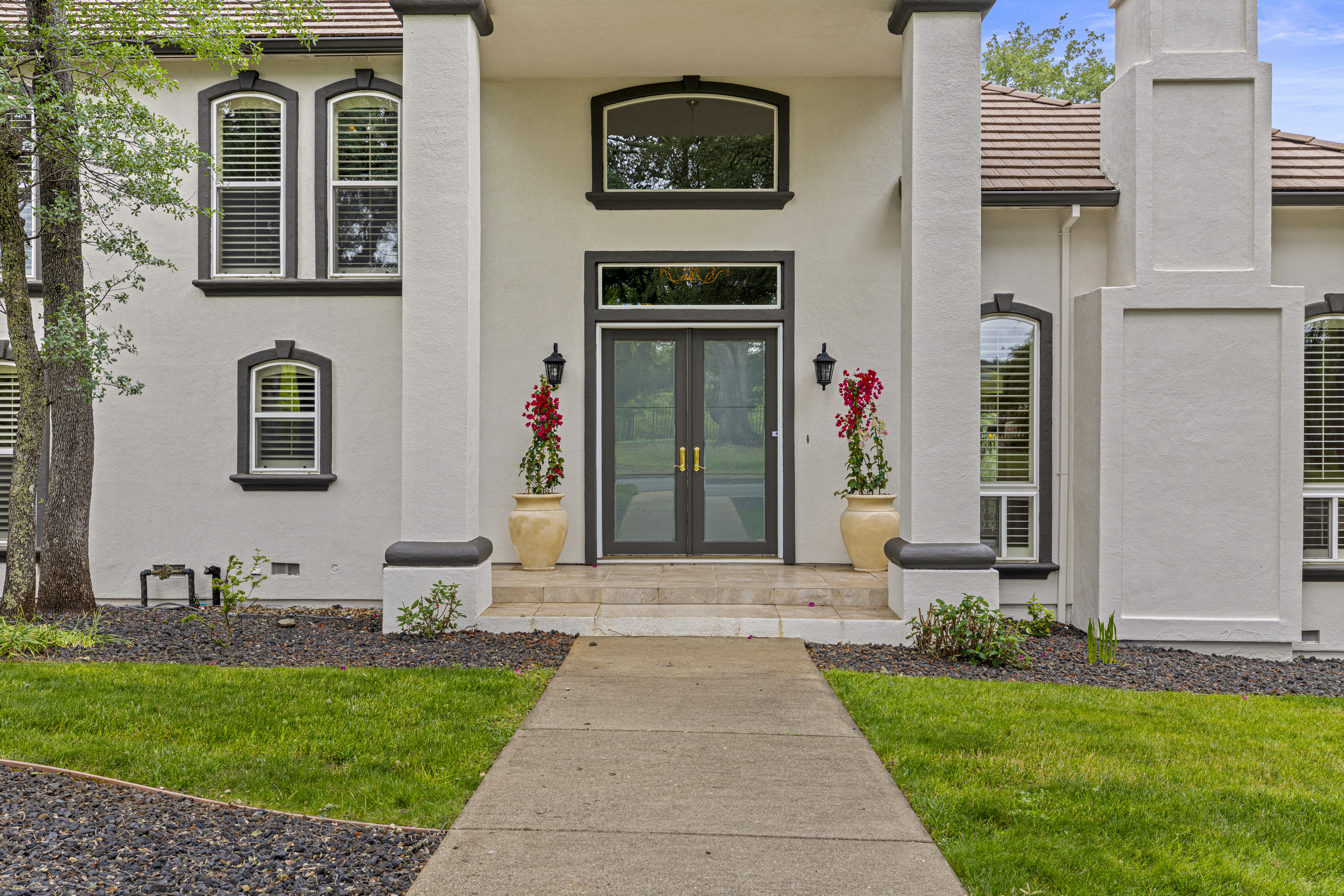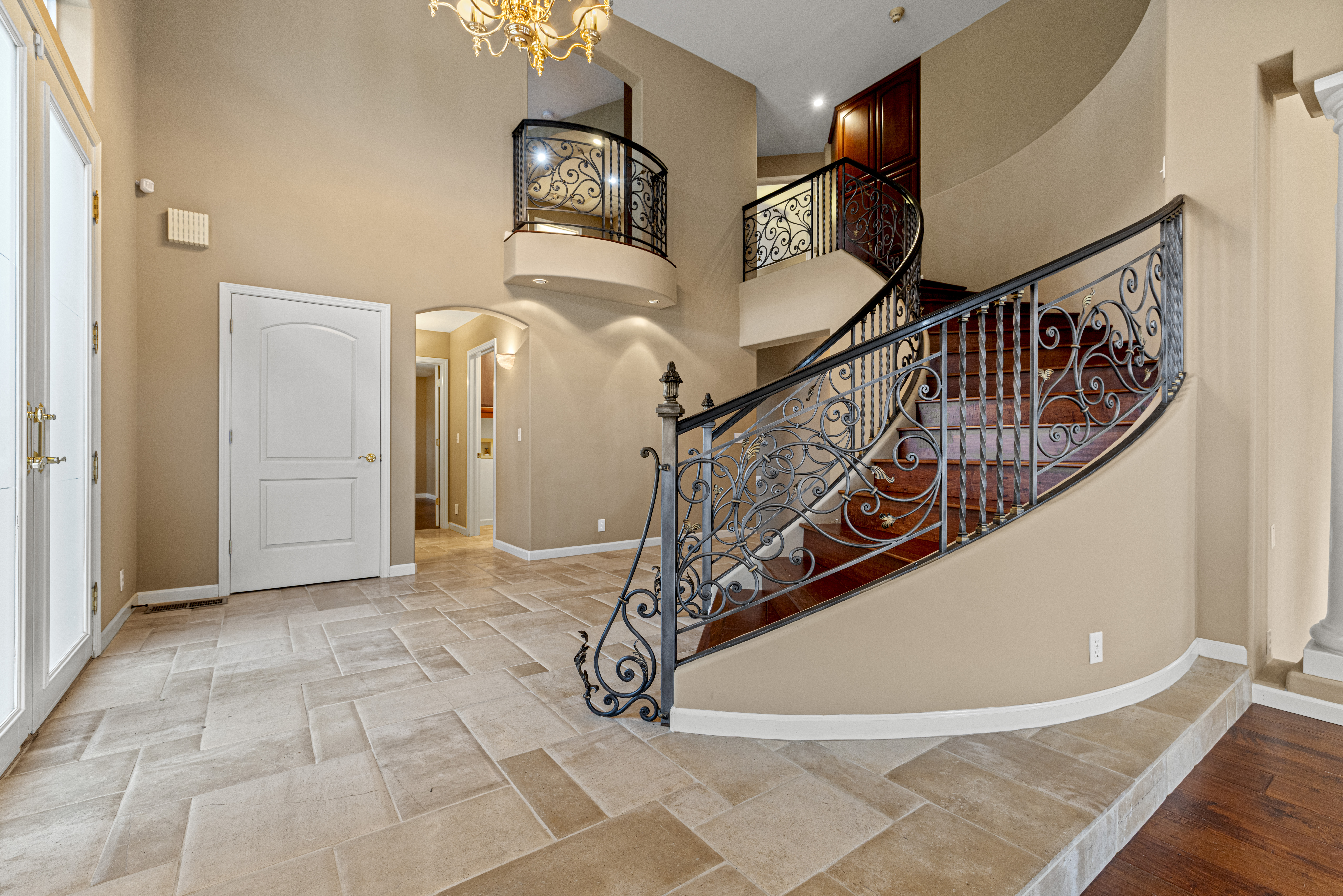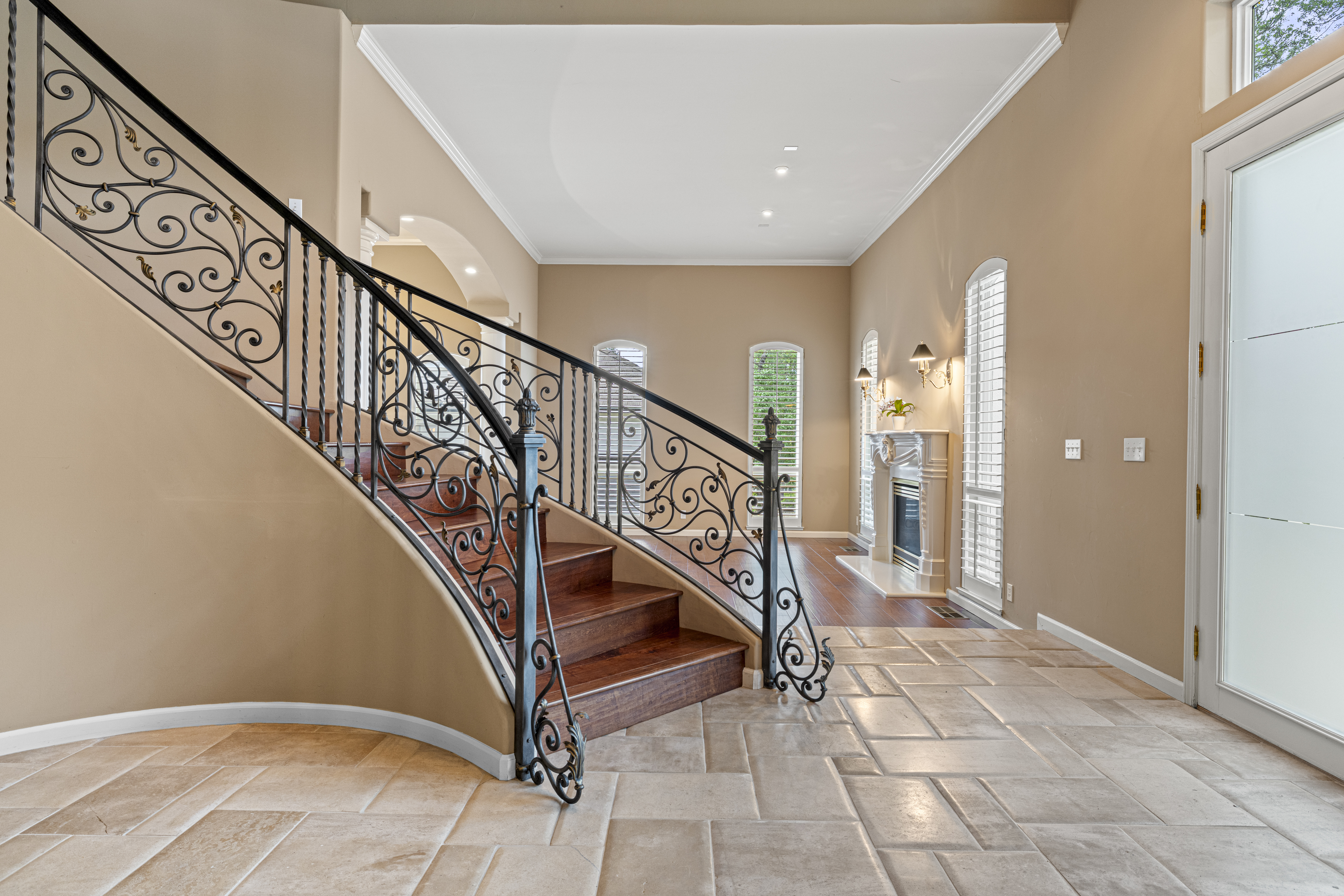Set on over 3/4 of an acre in the prestigious Sterlingshire community, this custom-built home blends timeless French-inspired architecture with thoughtful, modern functionality. Designed by an award-winning designer, every detail was carefully considered- from the classic exterior presence to the curated finishes throughout. Ideally located directly across from a beautiful community park, this home offers the perfect balance of privacy and connection- with open green space, walking paths, and additional play areas just steps from your front door. Inside, the home is both elegant and livable. Imported pillowed limestone flooring, rich woodwork, and custom details create a warm, refined feel. The kitchen is built for both everyday use and entertaining, featuring a Sub-Zero refrigerator and freezer, a Wolf cooktop with integrated BBQ, Thermador oven and ample space to gather. The main level offers a rare combination of comfort and flexibility, including a full bedroom with en suite- ideal for guests or multigenerational living. Two fireplaces downstairs create an inviting atmosphere, perfect for cozy mornings or relaxed evenings at home. Upstairs, the primary suite serves as a private retreat with its own fireplace, alongside an additional bedroom and a spacious loft or office that could easily function as a fourth bedroom or flex space. One of the standout features is the six-car tandem garage with a second-story attic- offering extensive storage or potential for a future ADU conversion. Whether you're a car enthusiast, need space for recreational toys, or simply want room to grow, this is a rare find. The backyard is designed for privacy and ease, with peaceful views of a creek and walking trail just beyond the property- creating a quiet, natural backdrop without the burden of heavy maintenance. The exterior & interior are also newly painted for added convenience. Located within a prime neighborhood, this home offers a level of privacy and security that's hard to come by, all while maintaining a classic, understated sense of luxury.