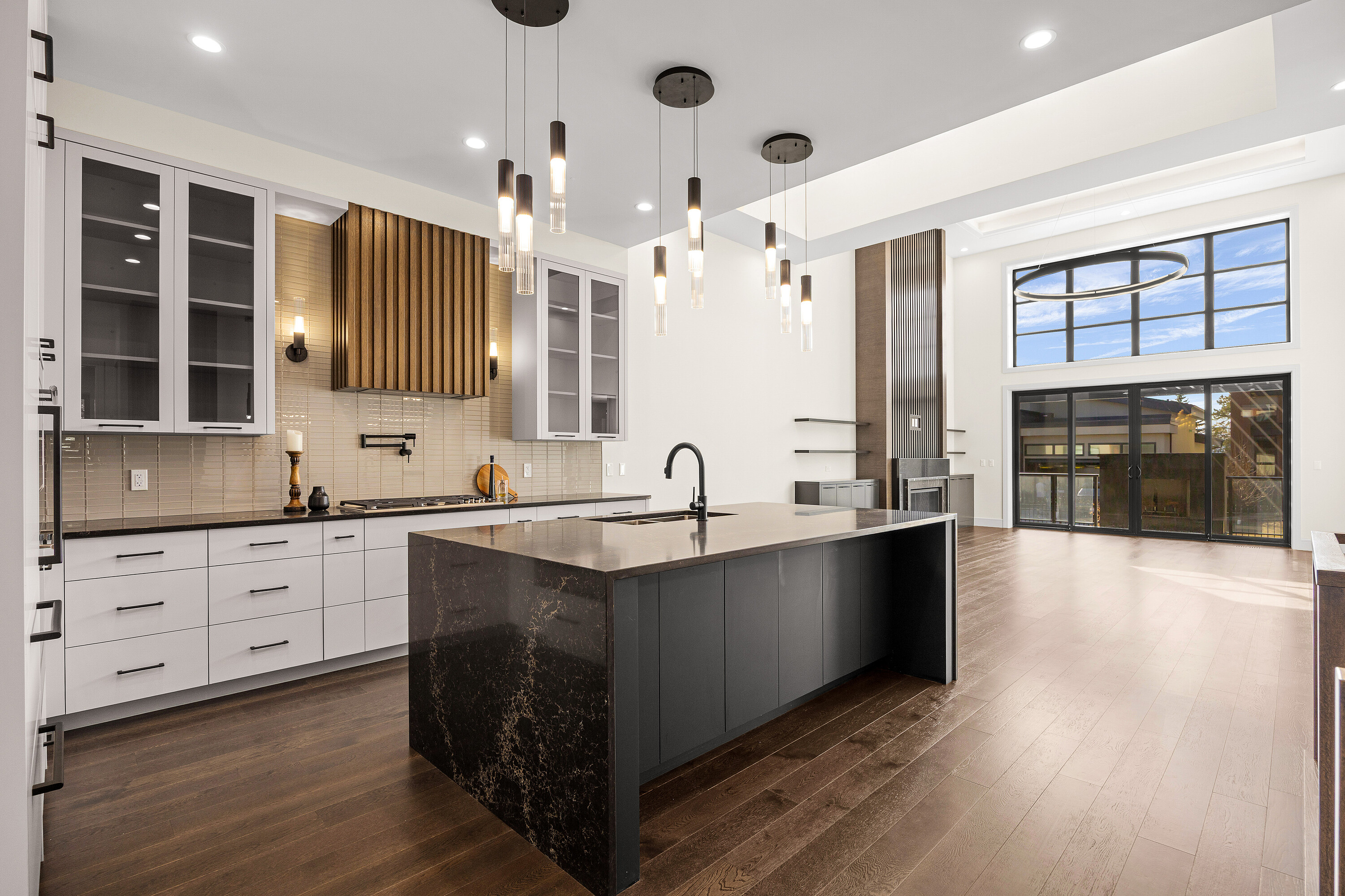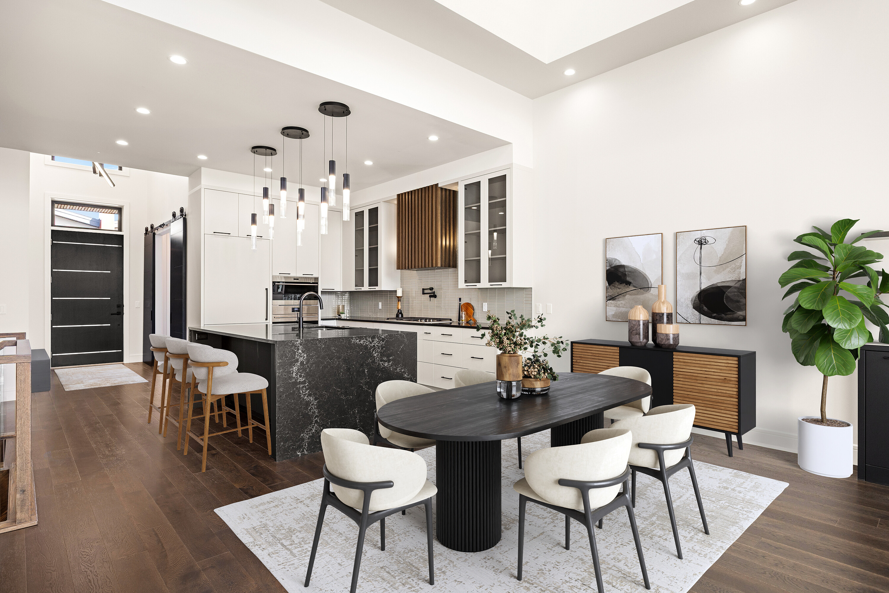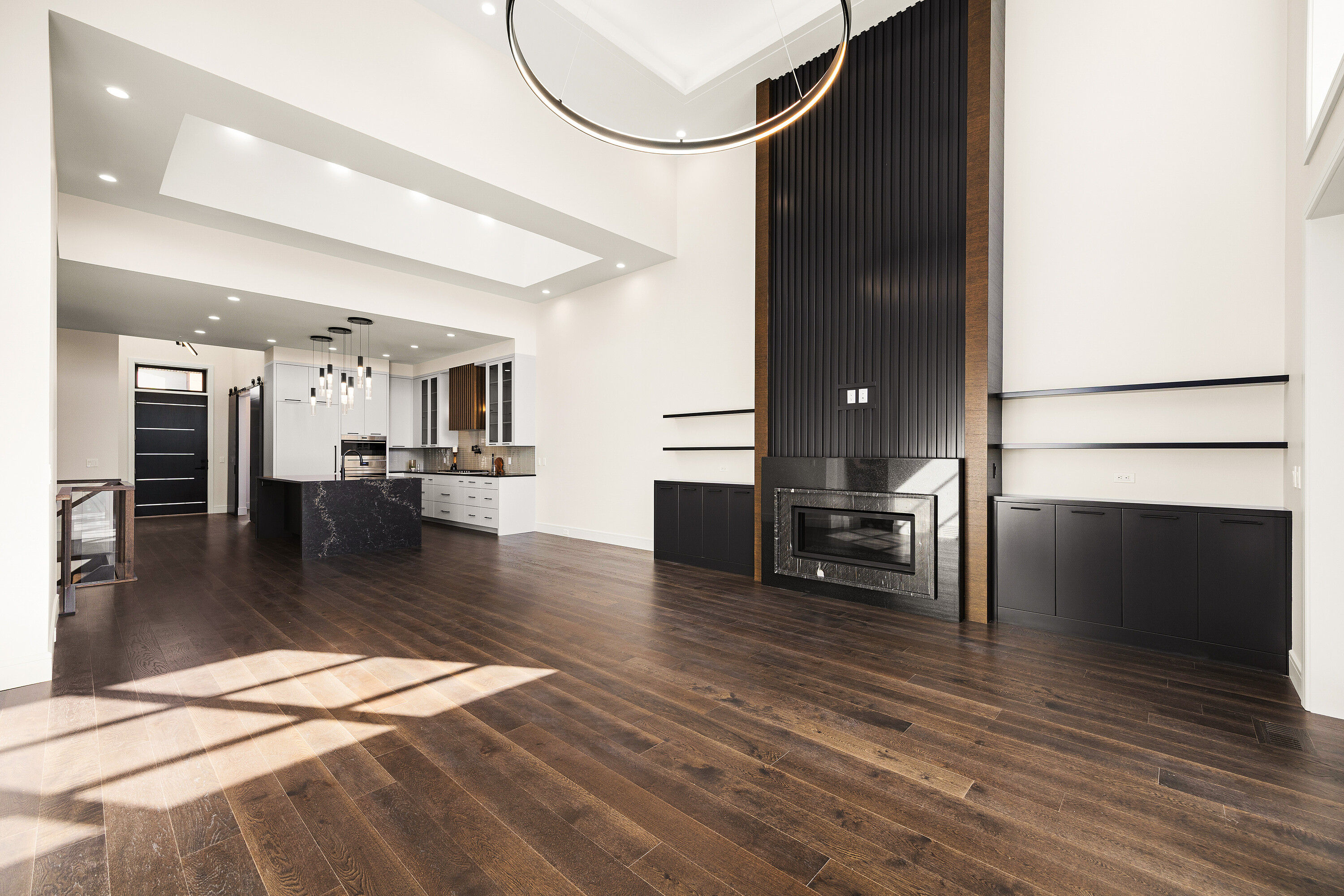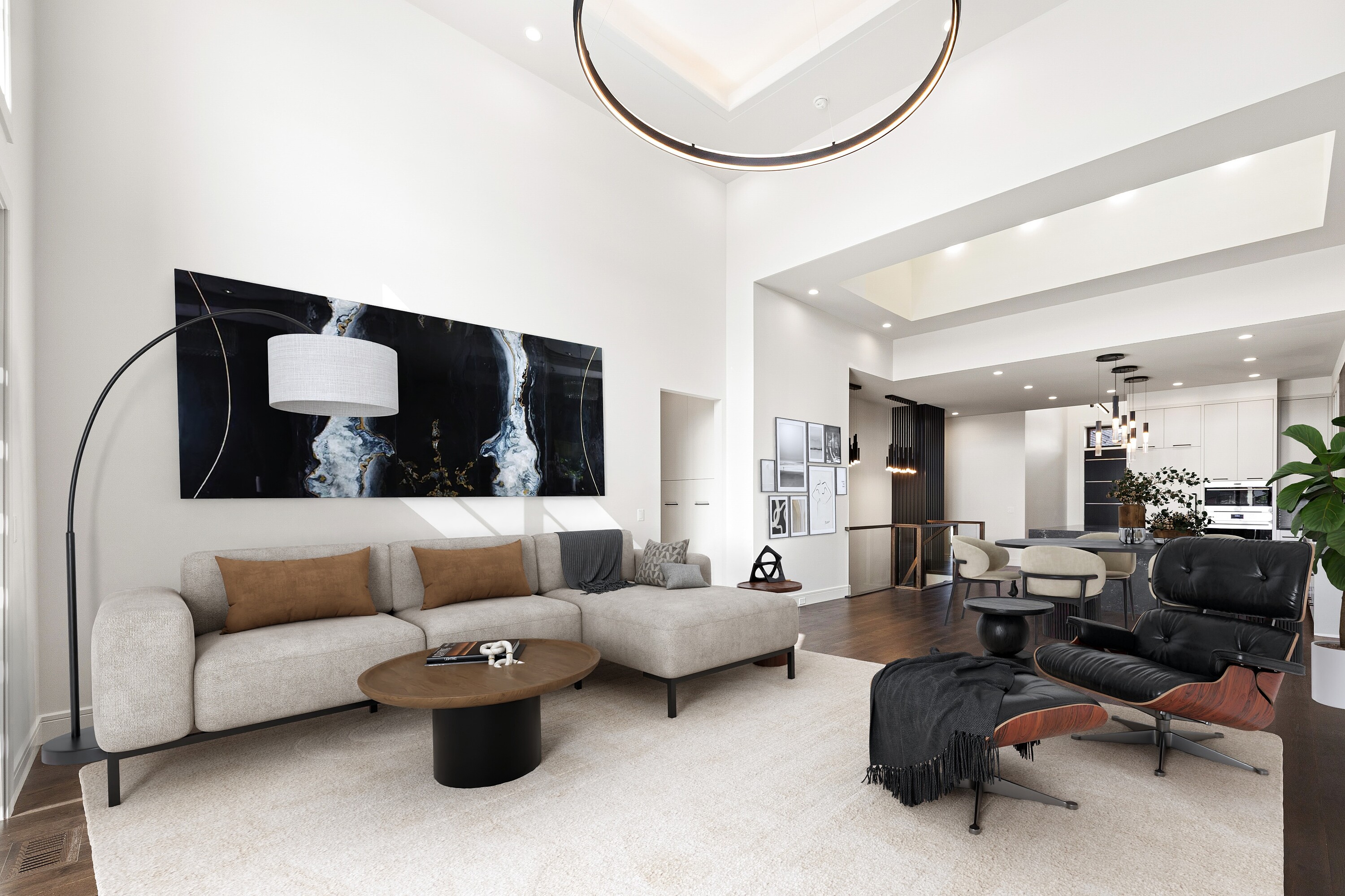 Presenting an opportunity to own a never-lived-in residence in Elveden Court, a prestigious and sold-out community of only 26 bungalow villas on Calgary’s west side. This luxury home represents the pinnacle of "smartsizing," specifically designed for discerning homeowners who refuse to compromise on quality while seeking the ultimate lock-and-leave lifestyle. Whether you are spending your winters south or your weekends in the mountains, this home offers the peace of mind and maintenance-free ease you’ve been looking for without sacrificing bespoke finishes and premium construction. The interior is a masterclass in modern elegance, defined by a high-contrast palette where dark elements meet crisp gallery walls and gleaming floors. The open-concept main level features soaring ceilings, multiple skylights, and expansive windows that flood the space with natural light. A custom fireplace surround reaching the 16’ ceilings anchors the great room creating a chic focal point in the home, while large doors transition seamlessly to a west-facing patio. This outdoor oasis extends the living space and is elevated by a built-in gas fireplace and a remote-controlled louvred pergola, allowing customized sun exposure or protection from the elements while entertaining. The kitchen is a flawless blend of style and utility, featuring premium, integrated Wolf and Sub-Zero appliances, custom cabinetry, plenty of counter space and a commanding island wrapped in deep, inky quartz that provides a sophisticated contrast to the light cabinetry. The main floor continues to impress with a primary suite that serves as a true sanctuary, boasting a walk-in dressing room and a spa-inspired ensuite with in-floor heat, dual vanities, a sizeable shower and a freestanding soaker tub. A private den with sleek barn door access, a mood-filled powder room featuring bold designer wallpaper and a statement pendant light, and a well-appointed laundry room complete the main level, ensuring all your daily essentials are accessible on one floor. The fully developed lower level, with nine-foot ceilings and a second fireplace, is engineered for lifestyle flexibility and hosting. A generous recreation area features a designer wet bar with custom glossy millwork and dual refrigeration, while two additional bedrooms provide ideal accommodations for guests or teens. A flex room offers the perfect footprint for a home gym or hobby space. The spacious lower patio leads directly to the fenced, private west facing yard. The oversized double garage boasts a heated slab, transom windows and ceiling height to accommodate a car lift. Built to an exceptional standard with full Insulated Concrete Form (ICF) construction to the soffit line and triple-glazed windows, this home offers superior sound attenuation and thermal efficiency. Located just minutes from Aspen Landing and the Rocky Mountains, this villa offers an unparalleled blend of privacy and convenience for the next chapter of your life. (Please note: Some images are virtually staged - furniture & decor only)