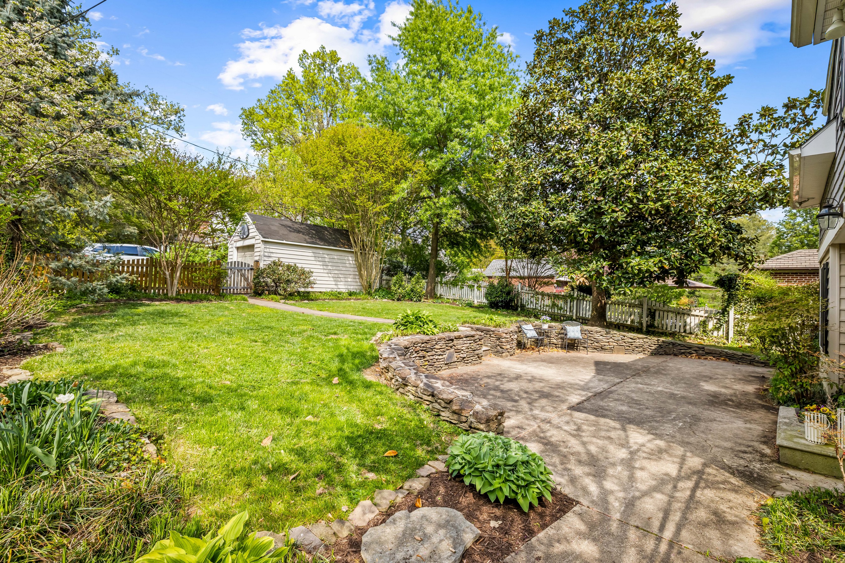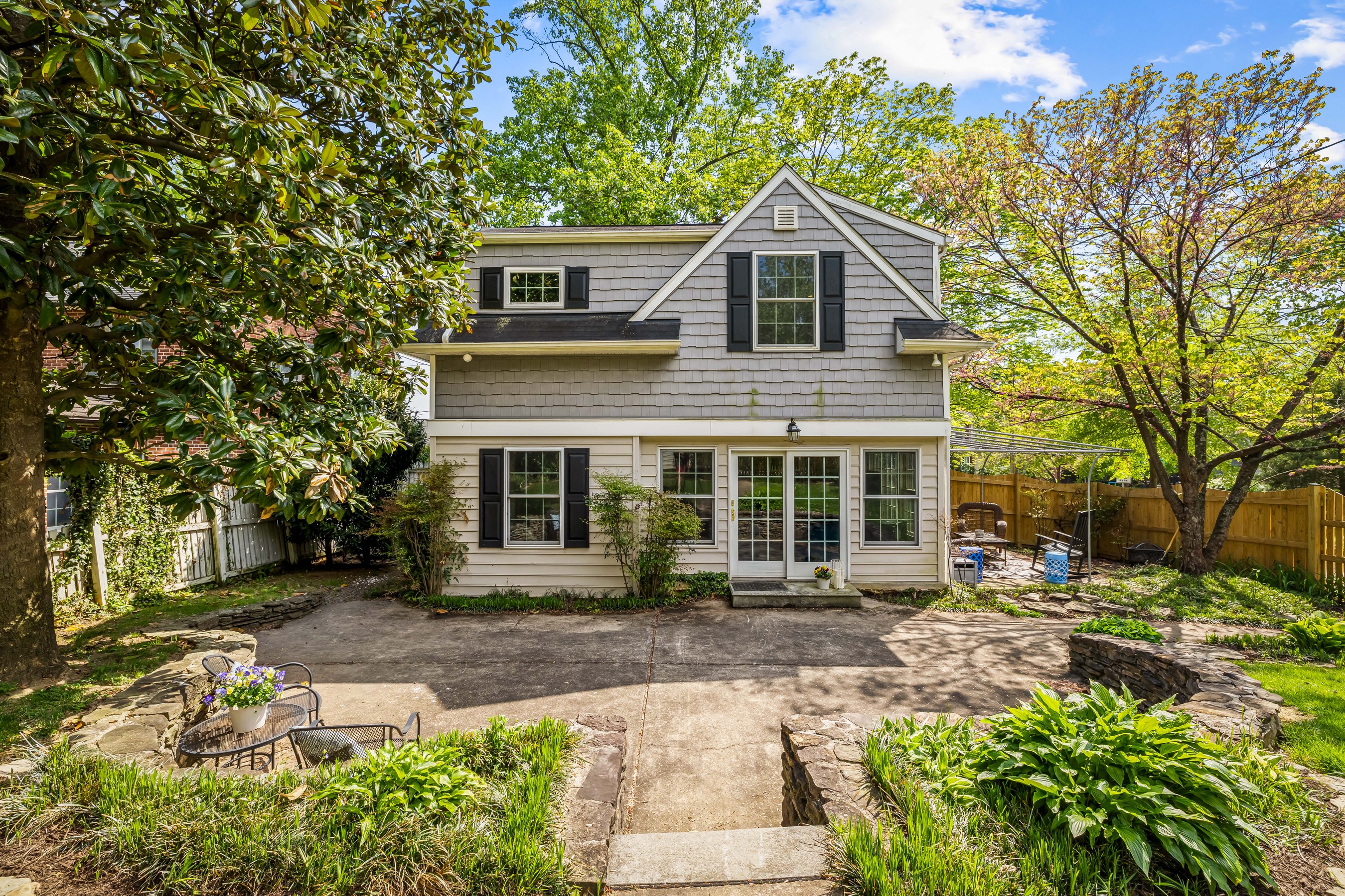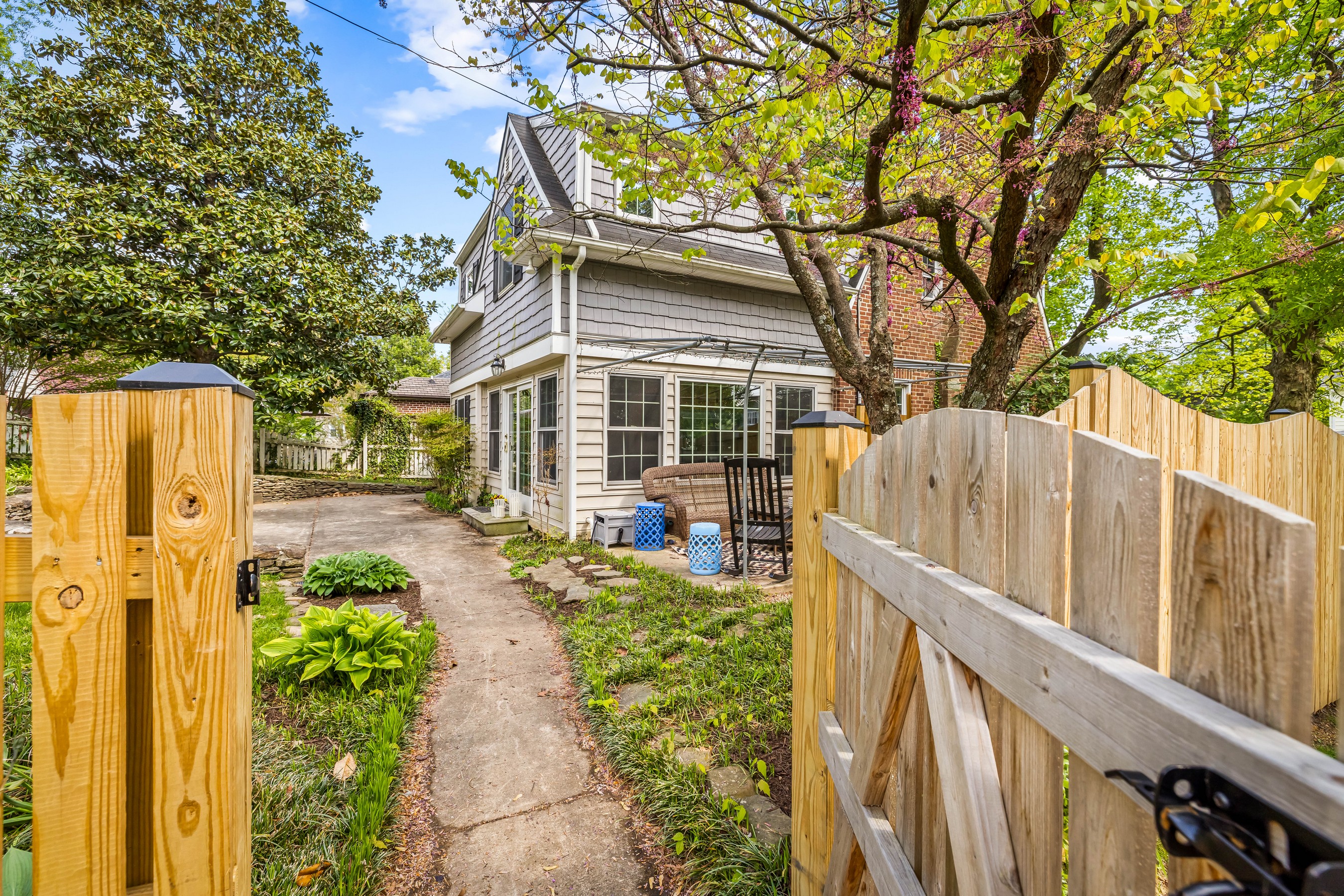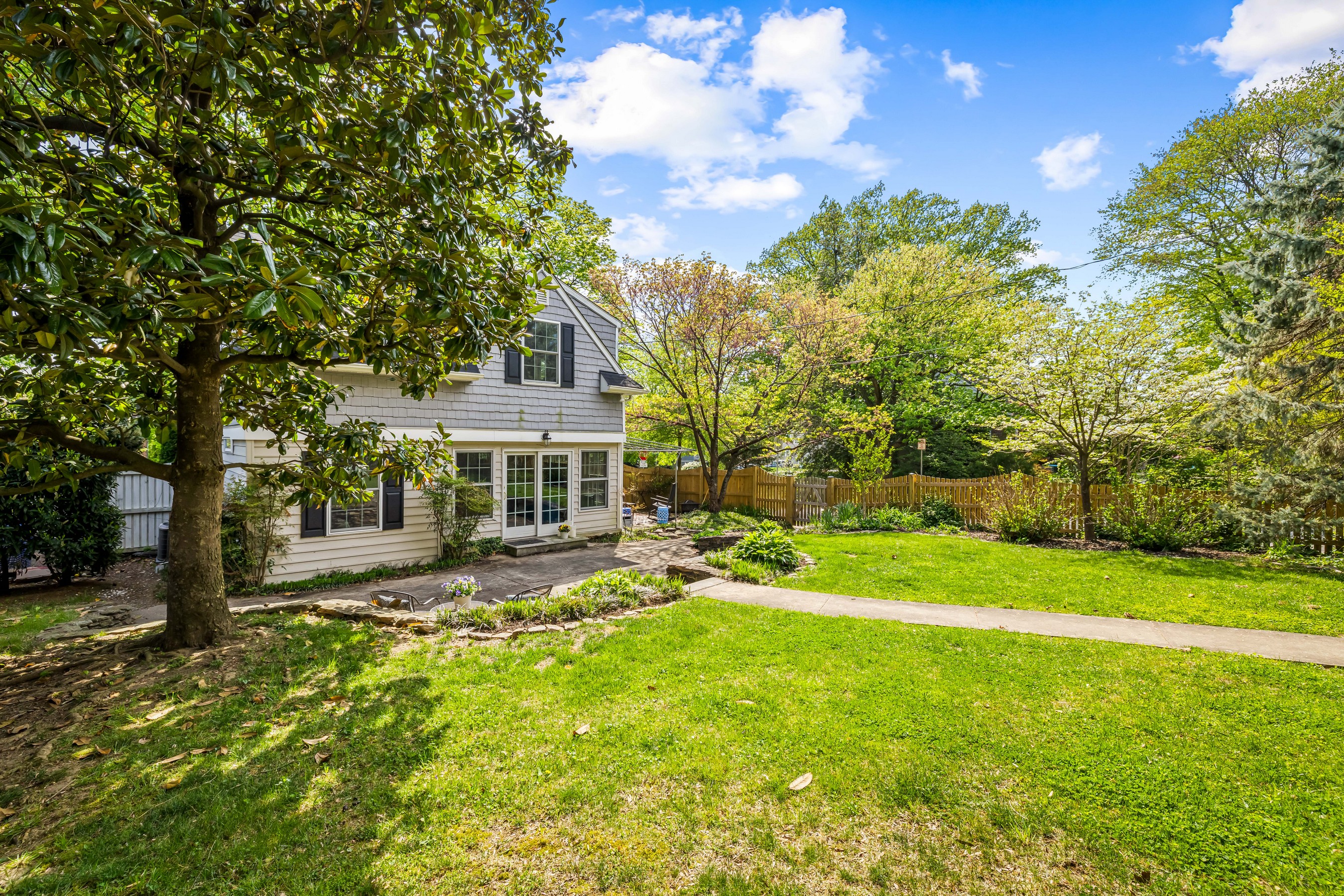 Oozing Stoneleigh charm and beckoning spending relaxing time outdoors, 700 Regester Avenue is well-sited at the intersection of Regester Avenue and Copeleigh Road, perched on a gentle knoll surrounded by stone walls and eight-foot privacy fencing. Plenty of off-street parking is available with the three-car parallel parking pad as well as the driveway and garage. Enter via the side gate into the oasis of green grass, flowering trees and shrubs, and patios. Relax in the evening on the awning-covered side patio. Through the back door, enter the family room which perfectly fits a large sectional. The breakfast room is next, with added closets and pantry. Cook wonderful meals in the kitchen, complete with breakfast bar. Textured stucco walls in the living room and dining room are authentic to the home, and are characteristic of many Stoneleigh homes. Upstairs find three large bedrooms including a recent primary suite addition adding a huge bedroom, walk-in closet and gigantic primary bath. There is also a renovated hall bath. The lower level features another bedroom with full bath. Or use the room as a guest room. There is a four-foot egress window in the room. Storage and laundry complete the other portion of the lower level. You'll love this location, just three blocks to the elementary school and a short walk to the Stoneleigh Pool. Come live the Stoneleigh Experience.