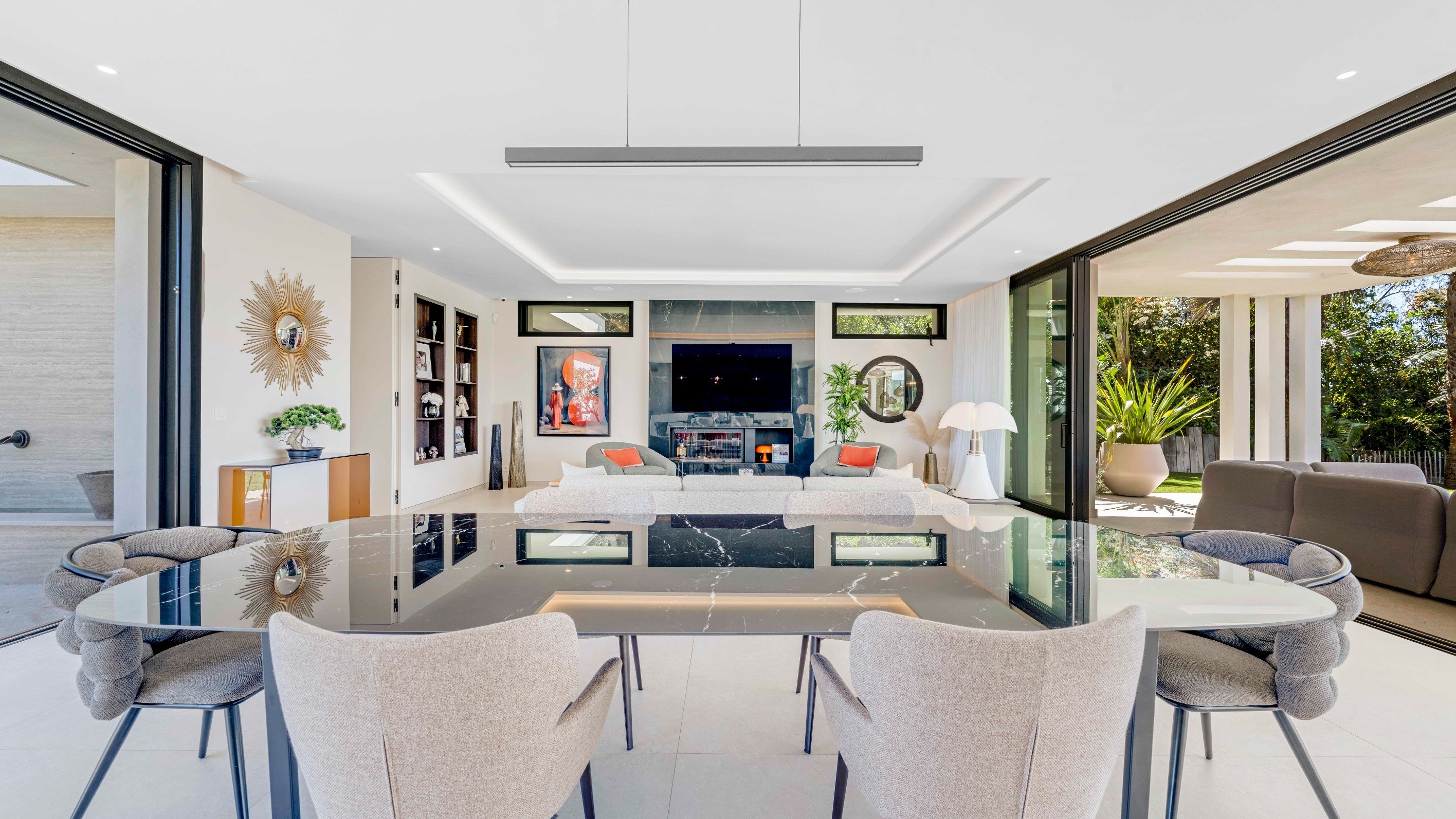 Located in the prestigious Sémaphore district in Sainte-Maxime, this newly built contemporary villa completed in 2025 offers approximately 420 sqm of living space on a landscaped plot of 1,980 sqm, with panoramic sea views over the Gulf of Saint-Tropez. The property benefits from a dominant position and a rare dual aspect, providing open views towards both the Mediterranean Sea and the Esterel hills. The main level of approximately 274 sqm features a spacious 80 sqm open plan living area including lounge, dining room and fully equipped kitchen, opening onto large terraces with sea views. A separate utility kitchen completes this space. The villa offers five bedrooms, including two master suites with sea views, dressing rooms and bathrooms, as well as three additional bedrooms with terraces and en suite facilities. The lower level, accessible by elevator, includes a closed garage for three cars, multiple outdoor parking spaces, a wine cellar carved into the rock, a leisure room and a laundry room. Outdoor amenities include landscaped gardens, a pétanque court and a heated 12 x 3 meter swimming pool with relaxation areas. High end features include full home automation, perimeter alarm system and video surveillance. This contemporary villa in Sainte-Maxime near Saint-Tropez represents a rare opportunity for international buyers seeking a modern luxury property with sea views on the French Riviera, suitable as a primary residence, second home or investment. For further information or to arrange a private viewing, contact Côte d’Azur Sotheby’s International Realty, specialist in luxury villas for sale in Sainte-Maxime and the Gulf of Saint-Tropez.