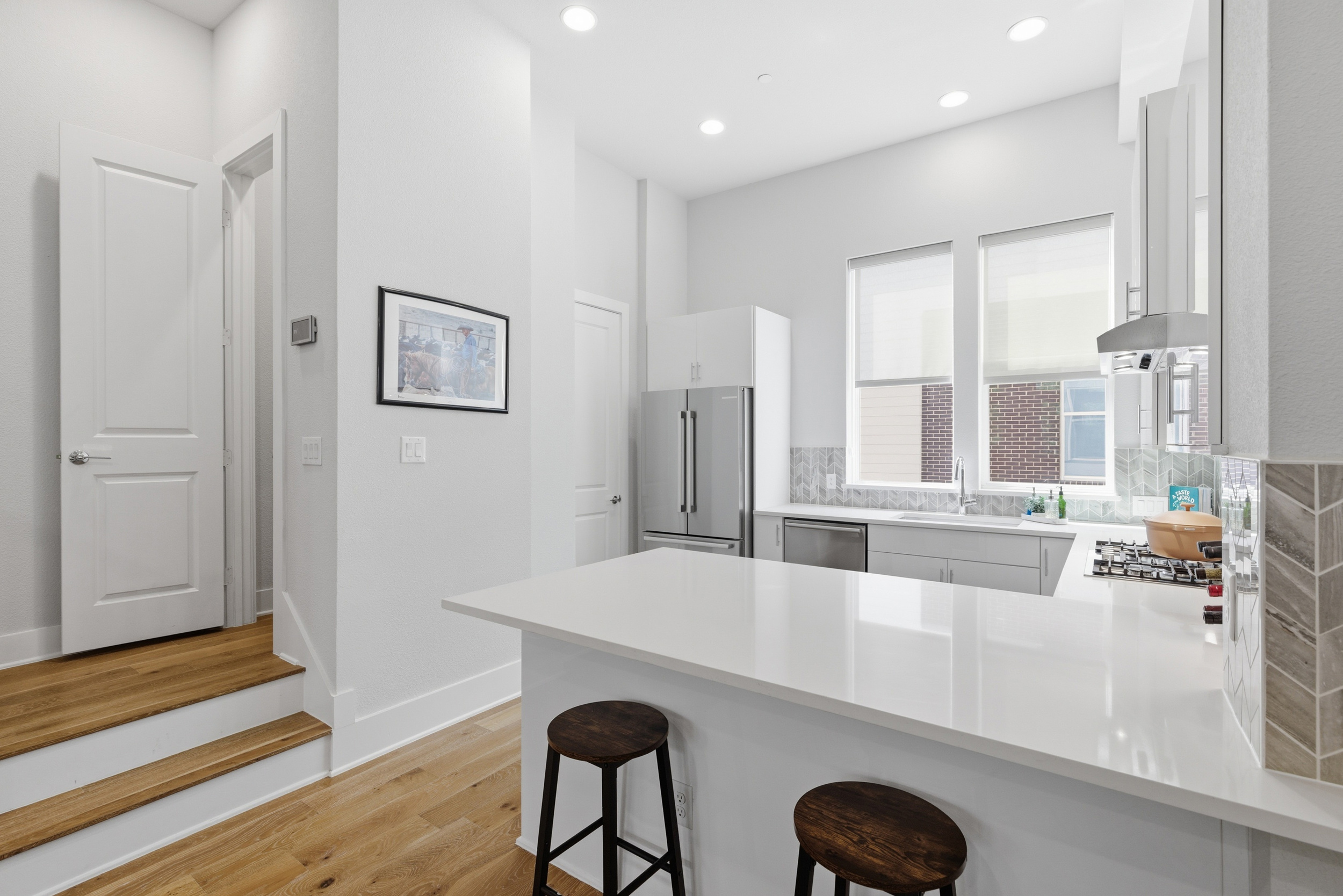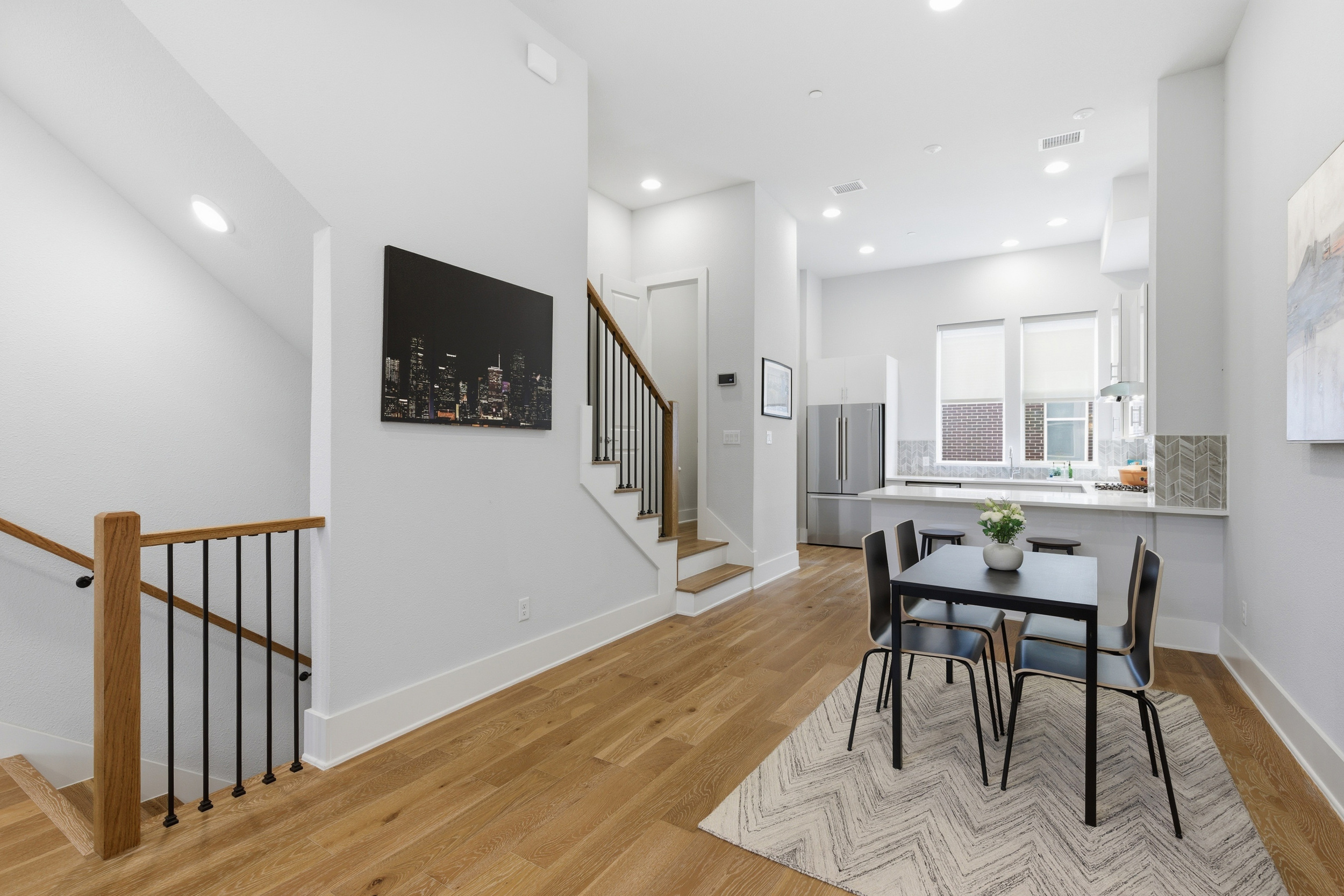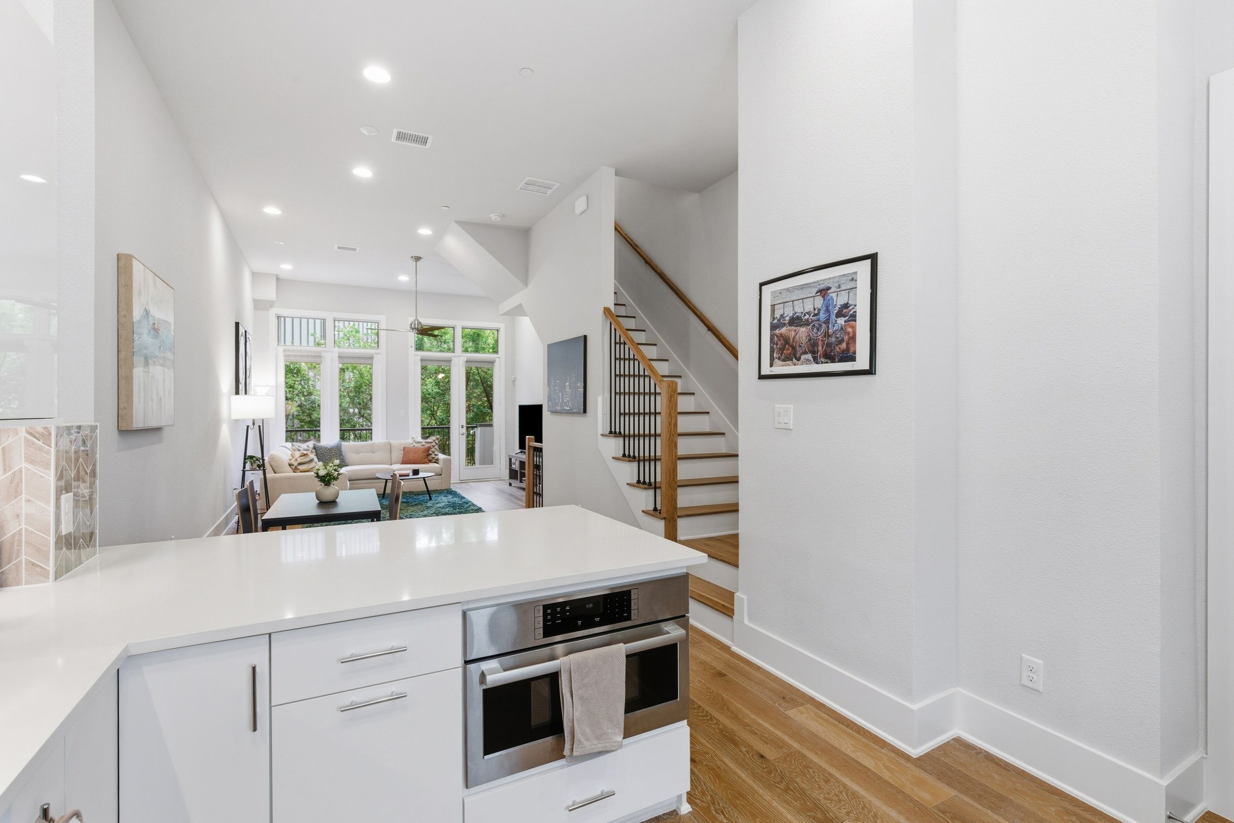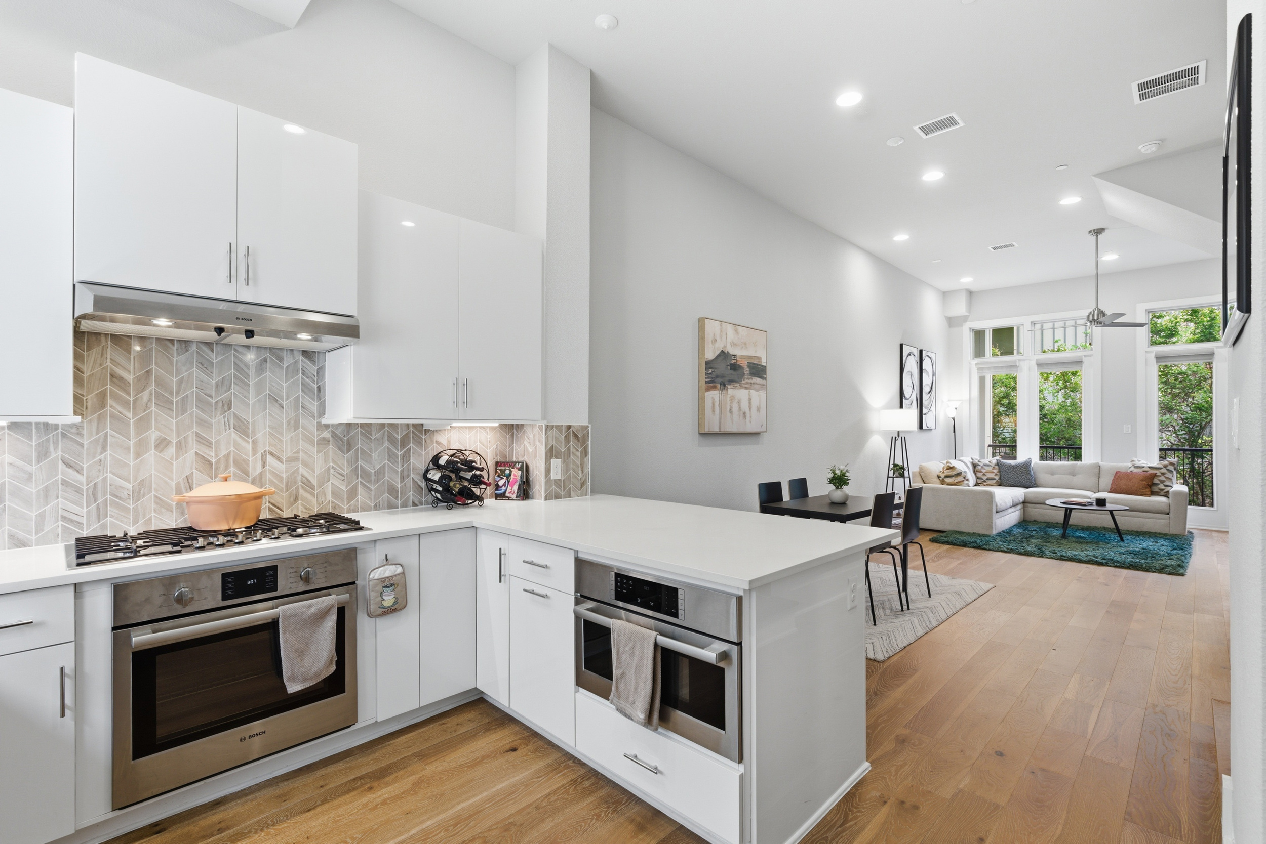 Welcome to Trinity Bluffs, nestled along the Trinity River just on the other side from downtown Dallas. This stunning 3 story townhome offers the perfect blend of modern luxury and urban convenience. Unit 1002 at 381 E. Greenbriar is a beautifully appointed 2 bedroom, 2.5 bath residence built in 2023, offering 1,414 square feet of thoughtfully designed living space in one of Oak Cliff's most coveted and quaint gated communities. Step inside to discover high ceilings, rich oak-style wood floors, and an open concept second floor where the living, dining, and kitchen areas flow seamlessly together. The kitchen features Bosch appliances, including a gas stove and built-in microwave, complemented by quartz countertops and designer lighting. A convenient powder bath completes the main living level.Upstairs, two spacious split bedrooms each offer privacy and en suite baths. The primary suite includes a generous walk in closet. Two private balconies provide a serene canopy of tree lined shade and in the winter months, enjoy unobstructed views of the iconic Reunion Tower. Residents enjoy resort style amenities including a sparkling community pool and secure gated entry. Ideally located near the scenic Trinity River trails, the vibrant Bishop Arts District, and an abundance of dining and entertainment options, this home puts the best of Dallas right at your doorstep and easy access to major highways.