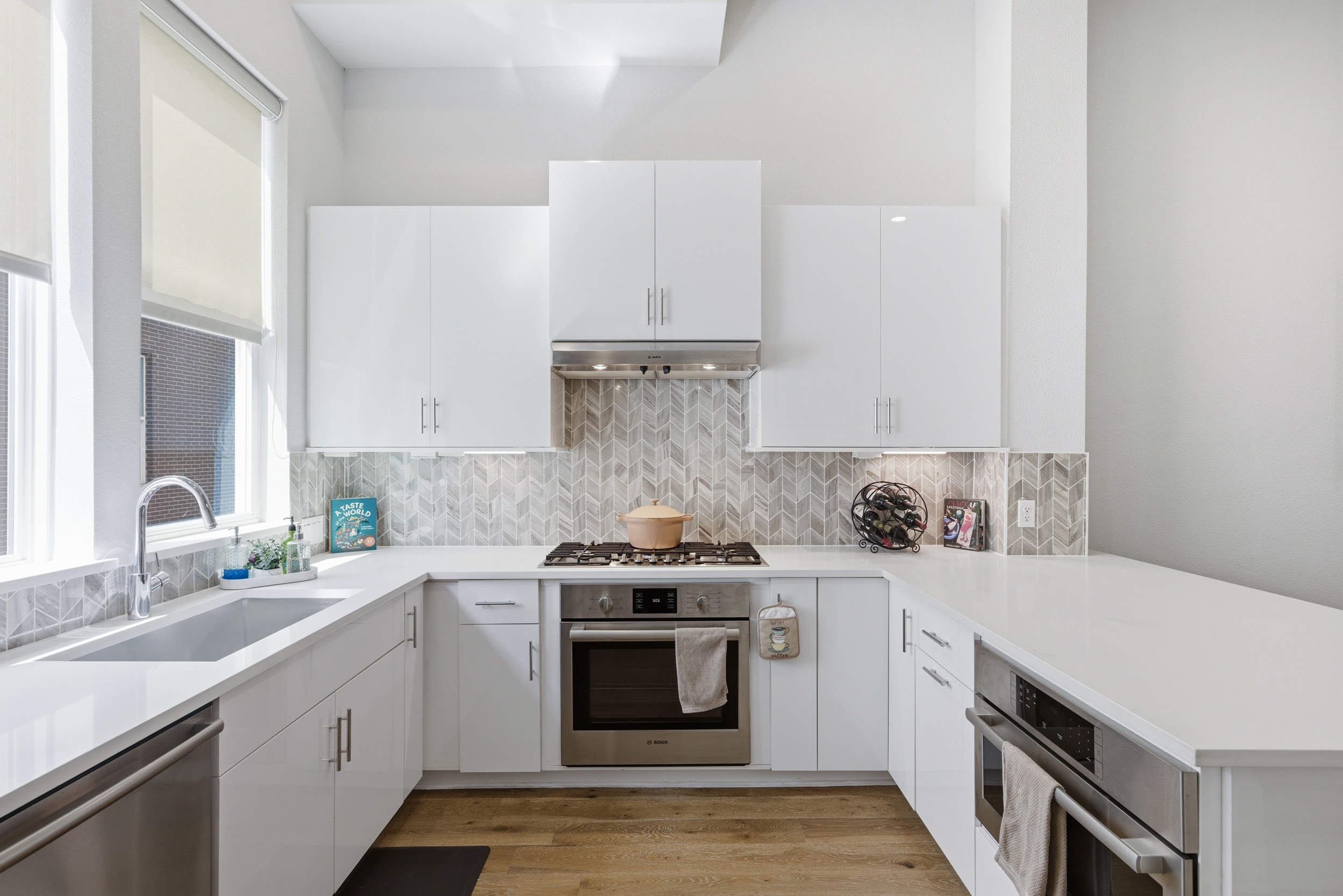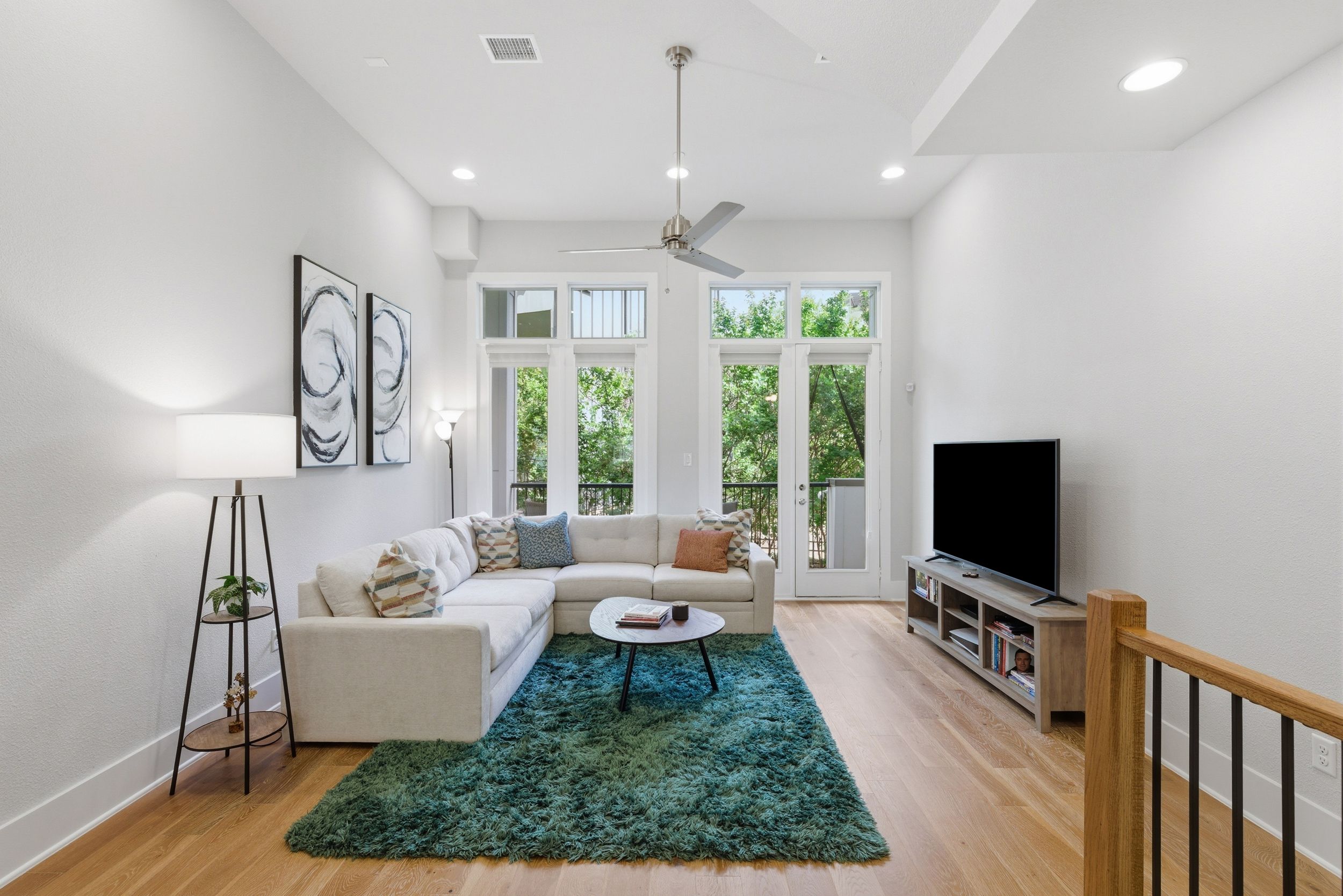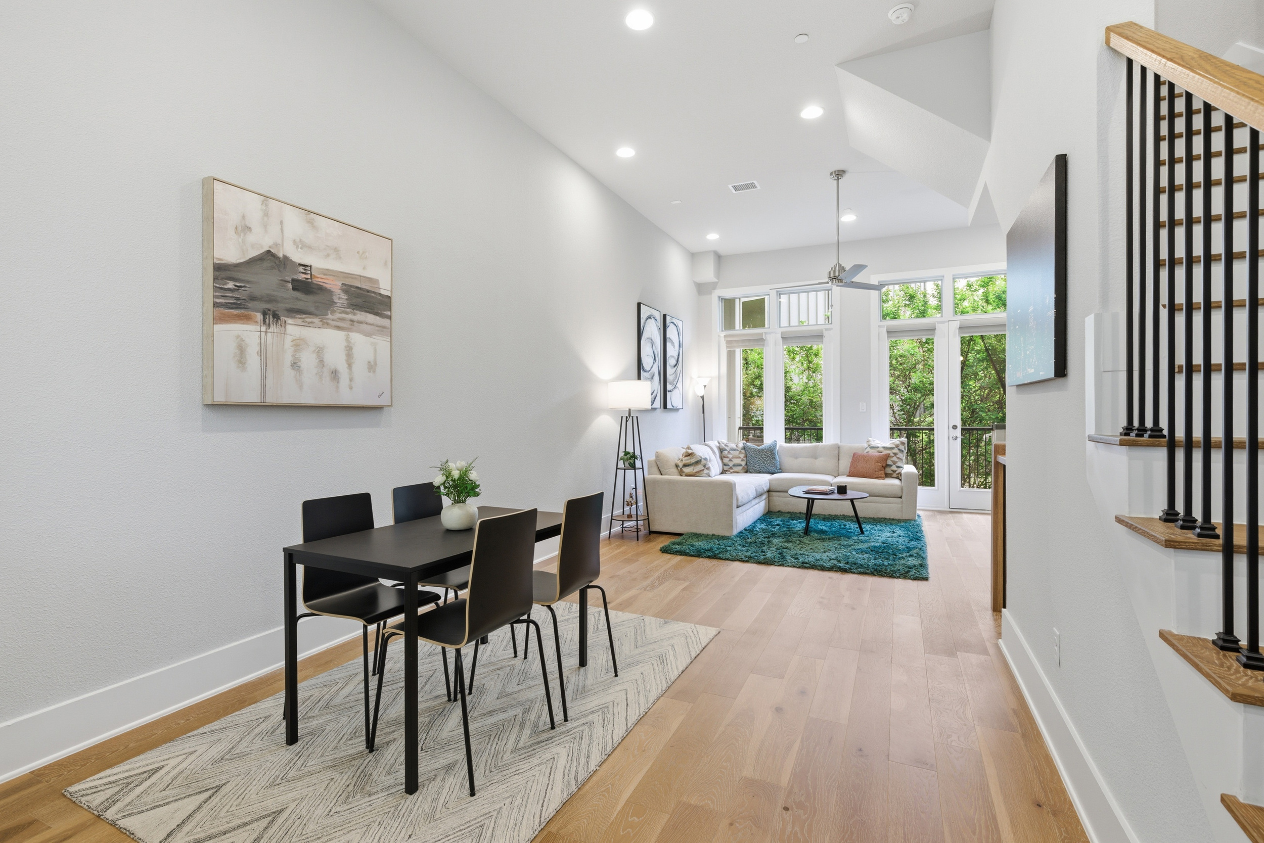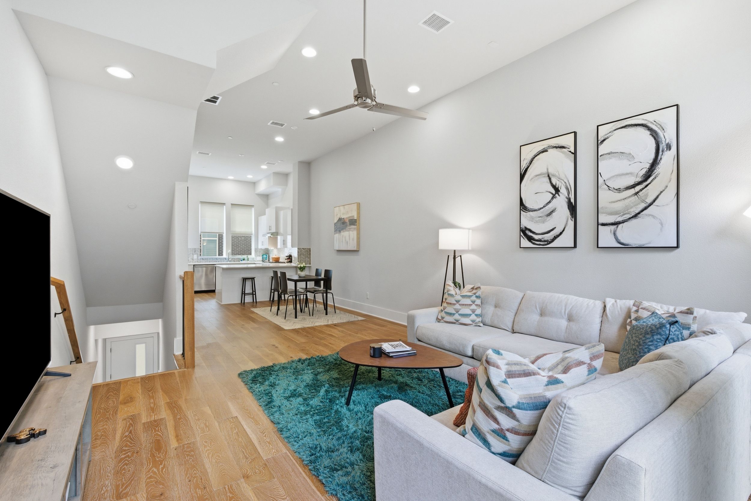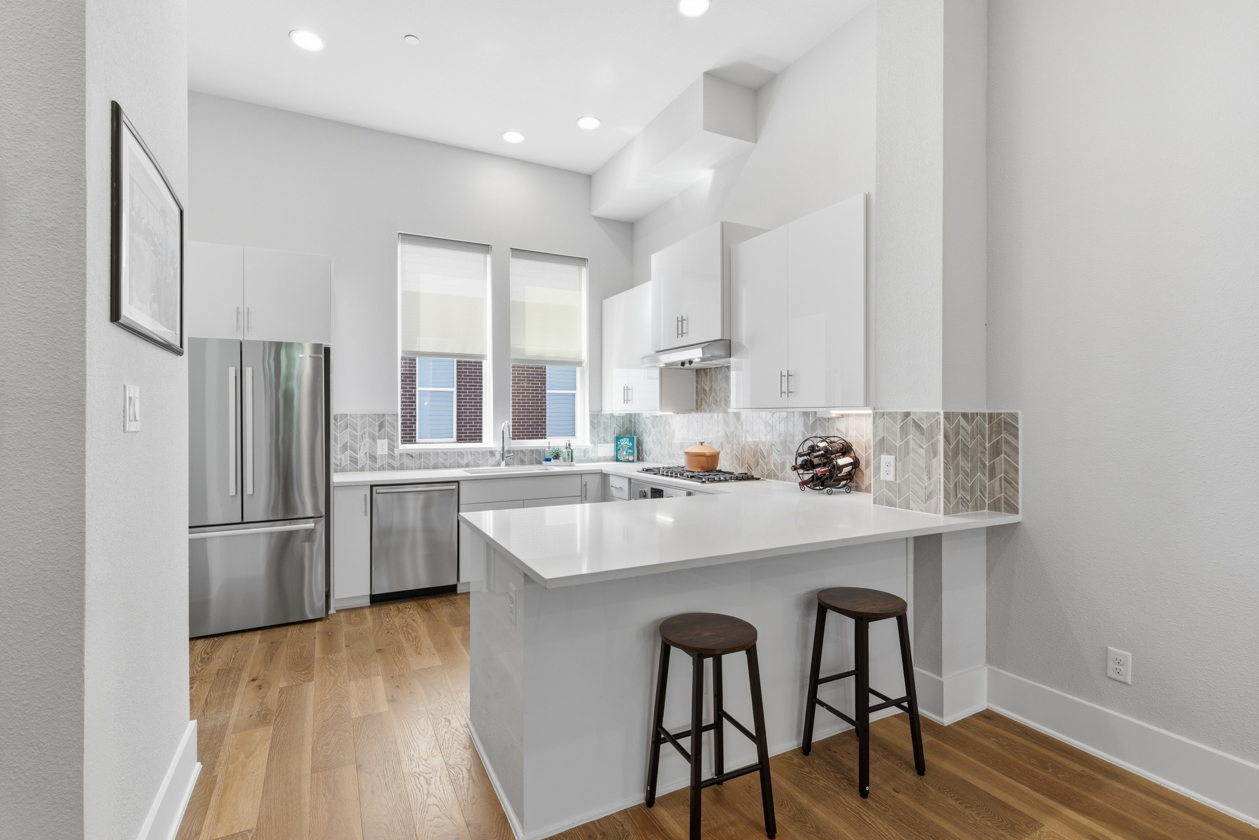 Welcome to Trinity Bluffs, nestled along the Trinity River just on the other side from downtown Dallas. This stunning 3 story townhome offers the perfect blend of modern luxury and urban convenience. Unit 1002 at 381 E. Greenbriar is a beautifully appointed 2 bedroom, 2.5 bath residence built in 2023, offering 1,414 square feet of thoughtfully designed living space in one of Oak Cliff's most coveted and quaint gated communities. Step inside to discover high ceilings, rich oak-style wood floors, and an open concept second floor where the living, dining, and kitchen areas flow seamlessly together. The kitchen features Bosch appliances, including a gas stove and built-in microwave, complemented by quartz countertops and designer lighting. A convenient powder bath completes the main living level.Upstairs, two spacious split bedrooms each offer privacy and en suite baths. The primary suite includes a generous walk in closet. Two private balconies provide a serene canopy of tree lined shade and in the winter months, enjoy unobstructed views of the iconic Reunion Tower. Residents enjoy resort style amenities including a sparkling community pool and secure gated entry. Ideally located near the scenic Trinity River trails, the vibrant Bishop Arts District, and an abundance of dining and entertainment options, this home puts the best of Dallas right at your doorstep and easy access to major highways.