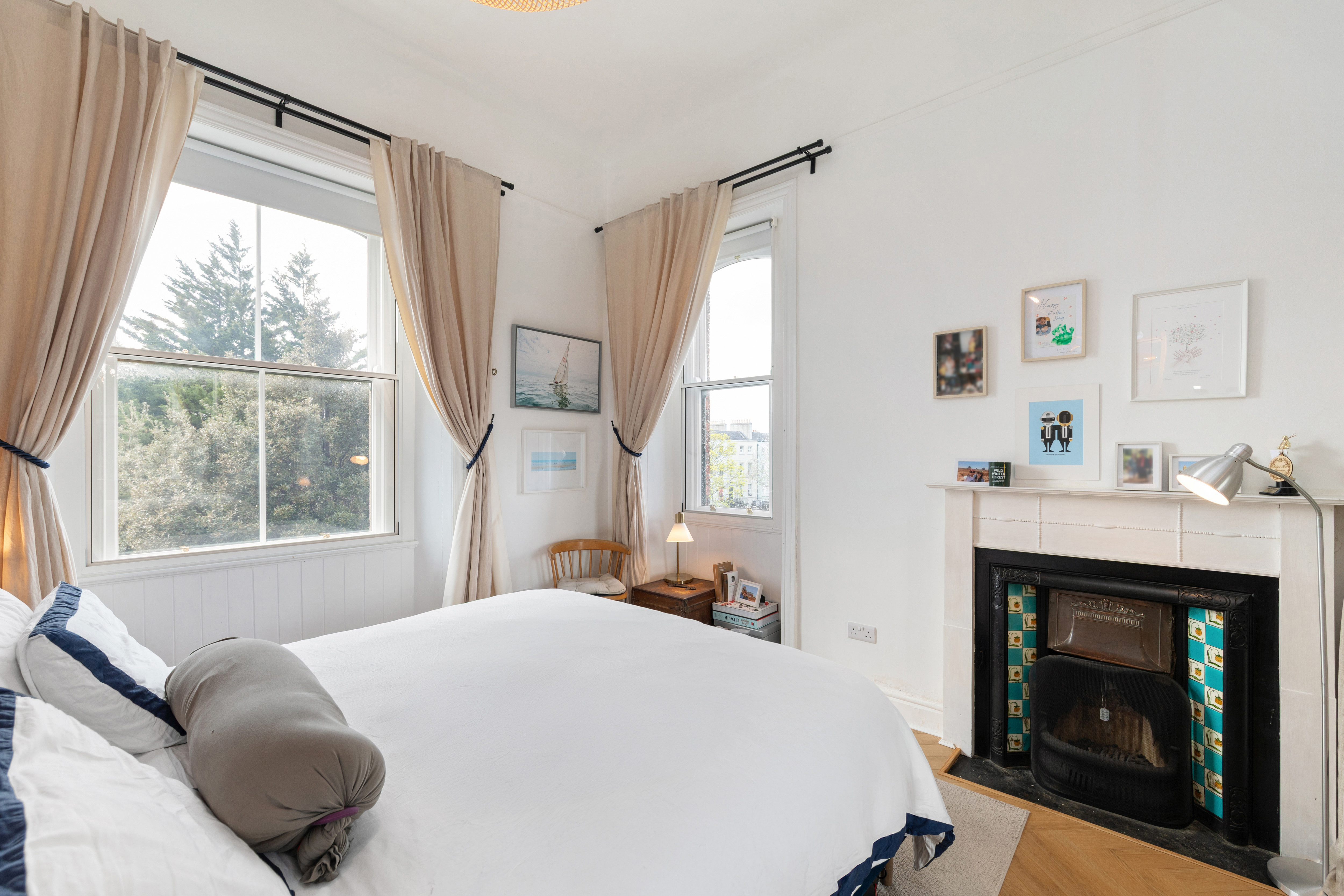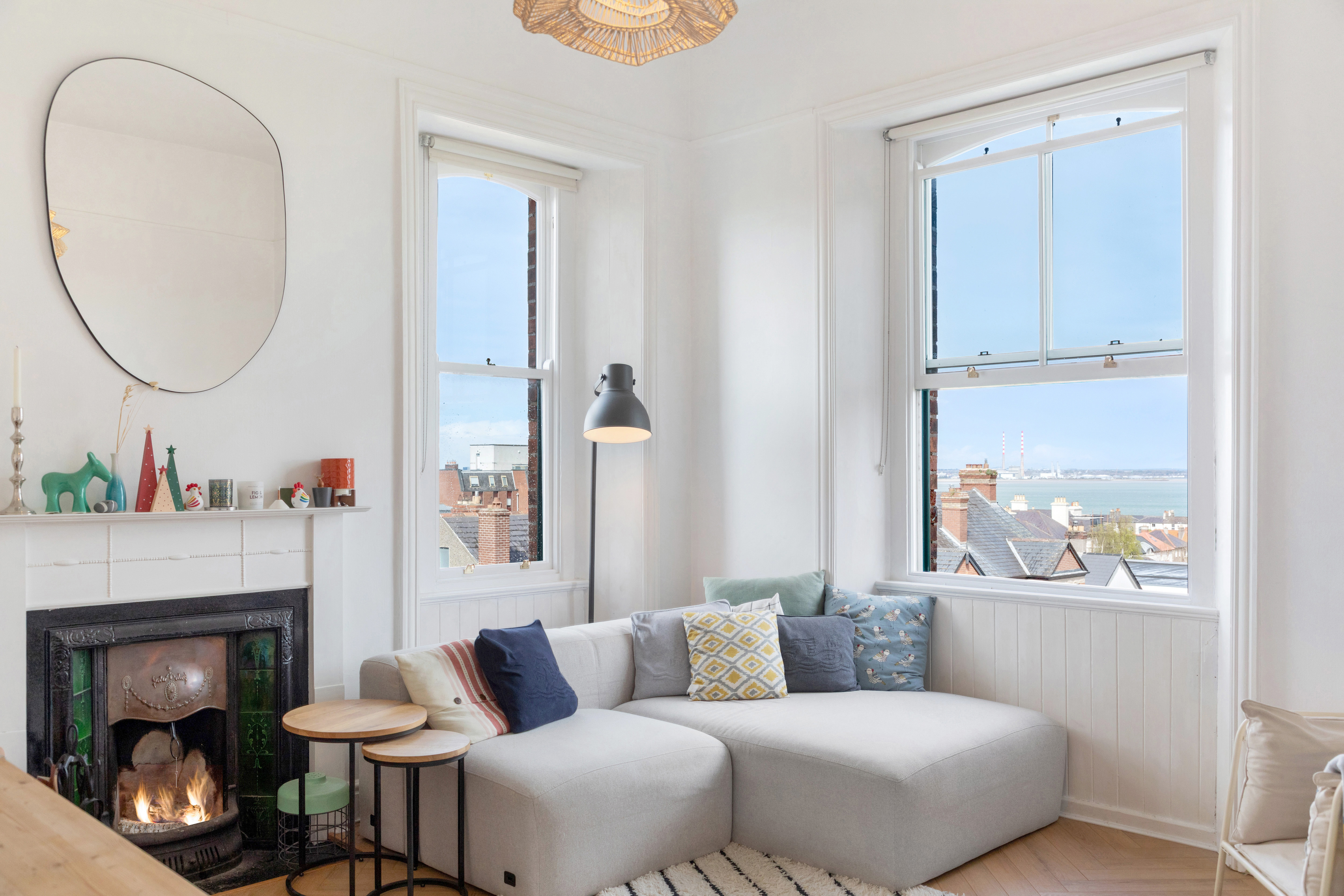 The welcoming entrance hall immediately sets the tone, featuring striking double height ceilings and beautiful bespoke shelving. From here, the accommodation flows effortlessly throughout the apartment. The living room is a particularly impressive space, enjoying stunning sea views, new sash windows and a feature wooden fireplace with a working open fire, creating a warm and elegant focal point. The generous ceiling height enhances both light and scale, making this an ideal room for everyday living and entertaining.